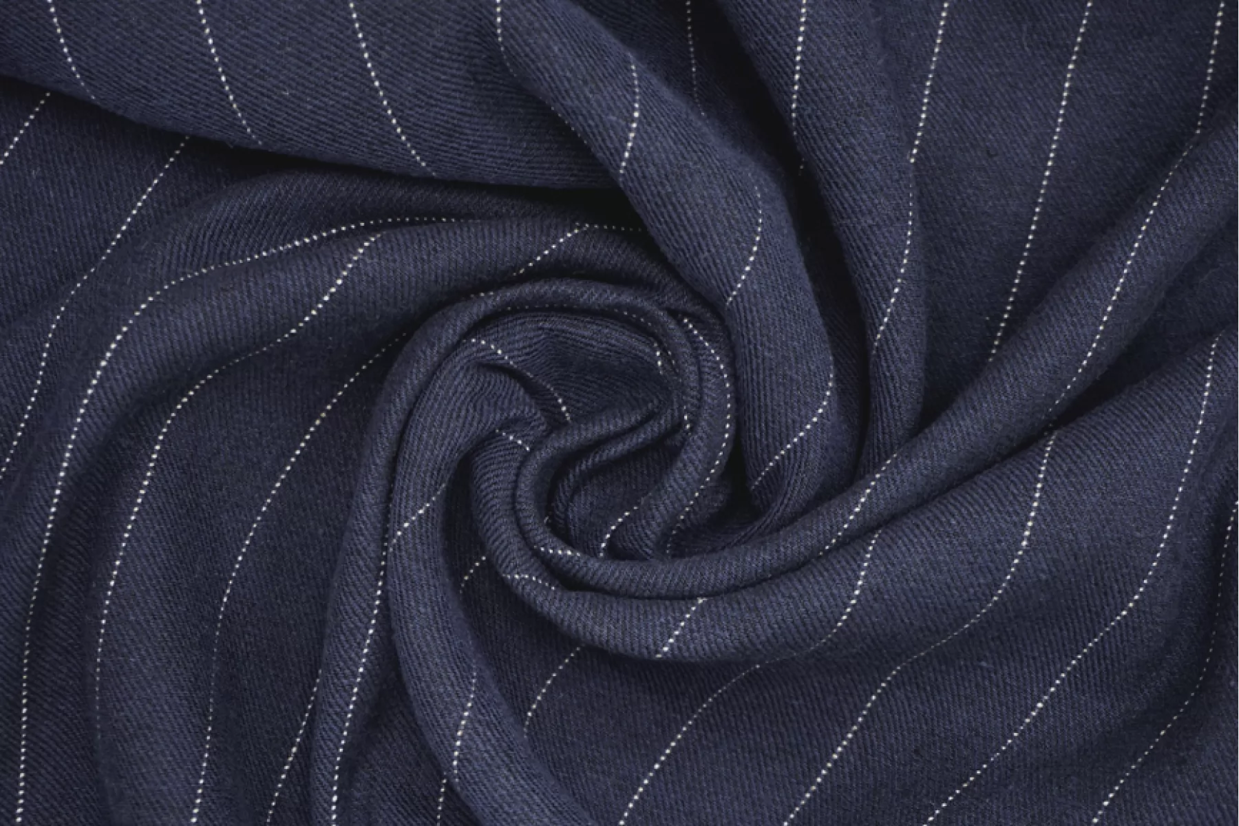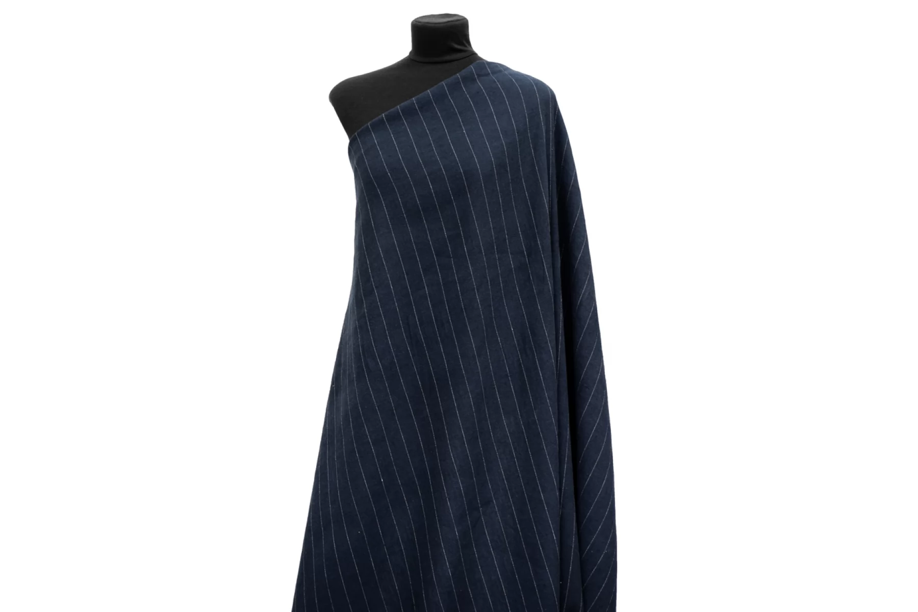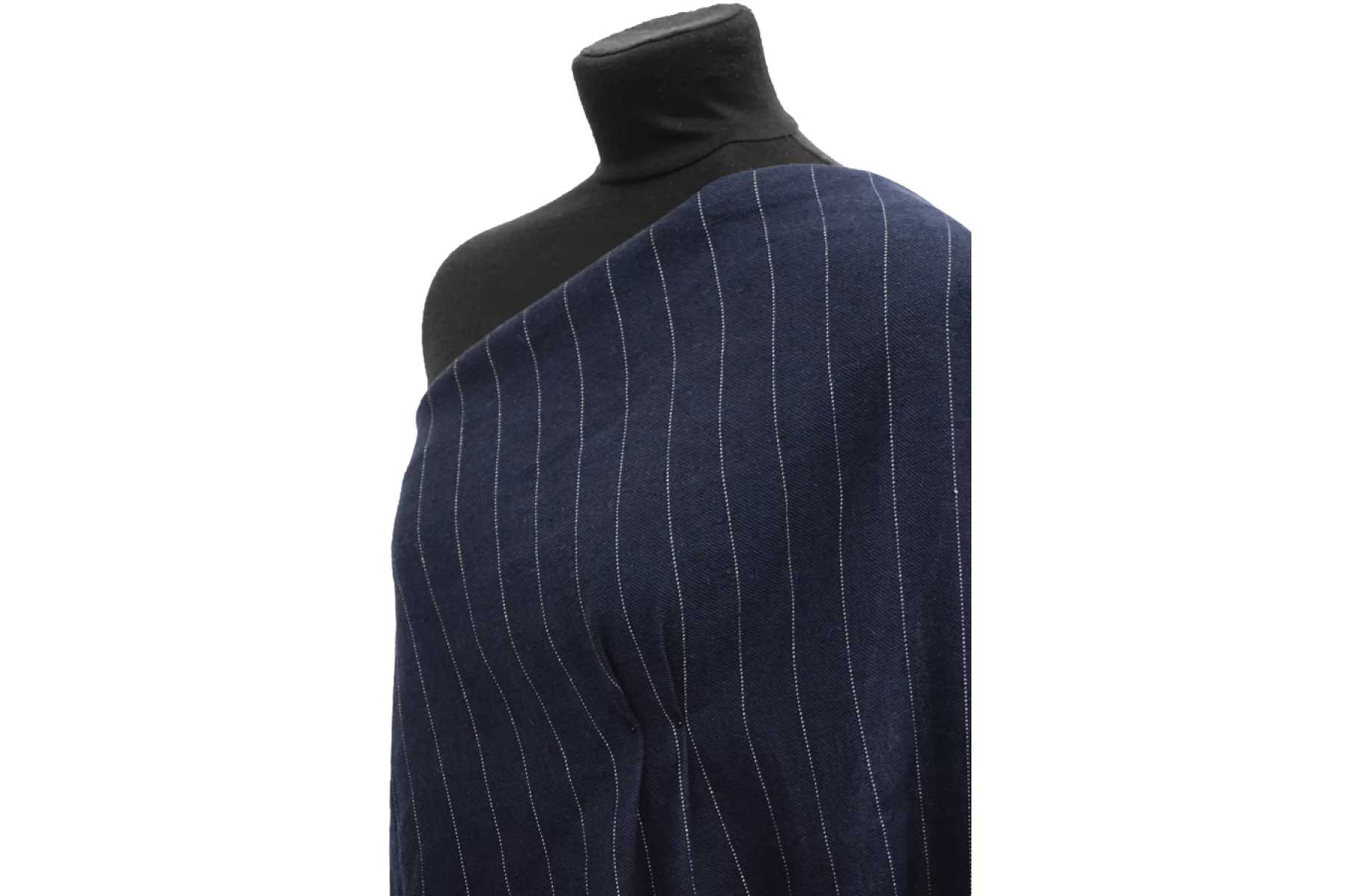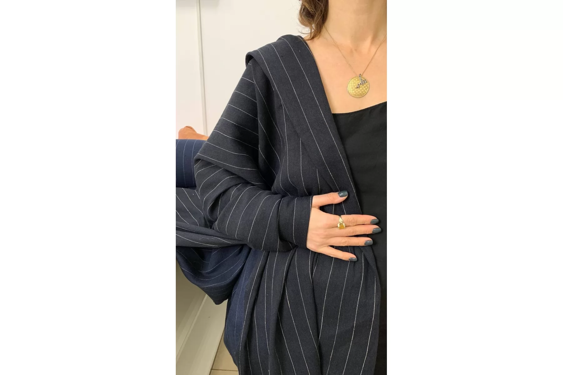 Костюмный лён, диагонального плетения, от FORTE FORTE переплетения нитей темно-синего оттенка и черного ( черный заметен между диагоналями) с вплетением молочной нити с бежевыми вкраплениями , что создает рисунок полоски. Расстояние между нитями, образующими полоску, ~2,7 мм. Обратная сторона черного припыленного оттенка. Материал тактильно приятный и мягкий, слегка шероховатый за счет плетения. Плотненький и достаточно толстенький. Не тянется. Не просвечивает, но если смотреть прямо на просвет, слегка заметен силуэт. Хорошо драпируется, форму практически не держит. Сминается. Отличный вариант на костюмы, жакеты, брюки на резинке и не только.