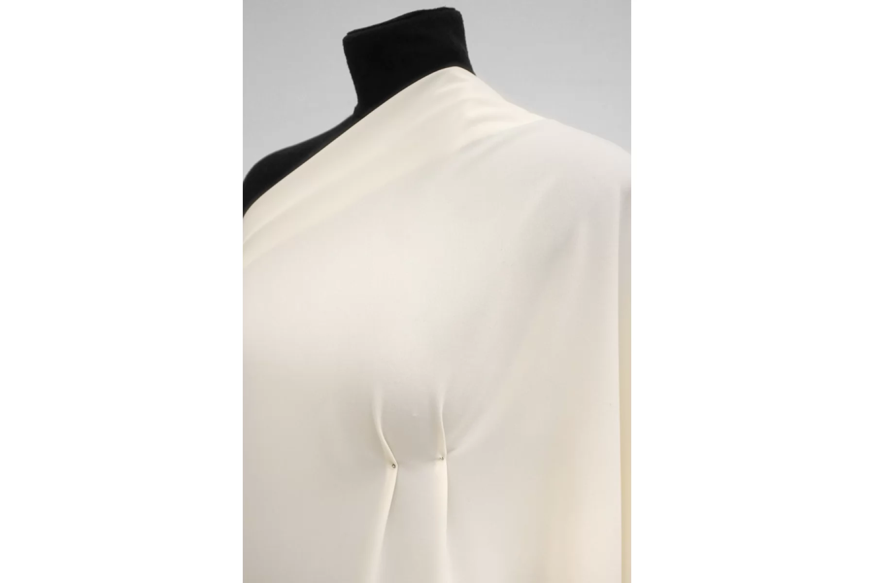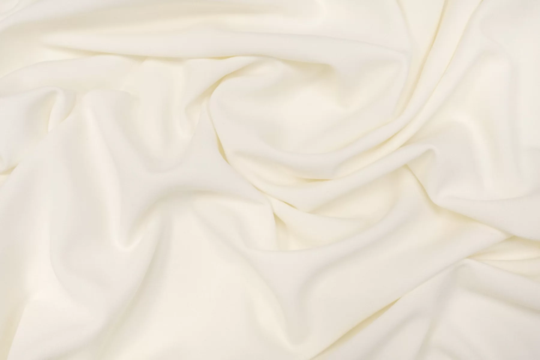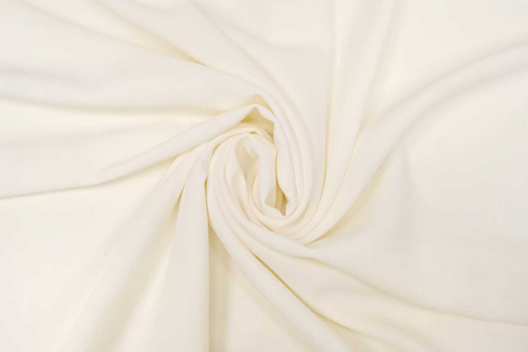 Плательный синтетический креп в молочно-белом цвете. Тянется в оба направления, немного просвечивает, пластичный. Подойдет для пошива платья, юбки, топа.