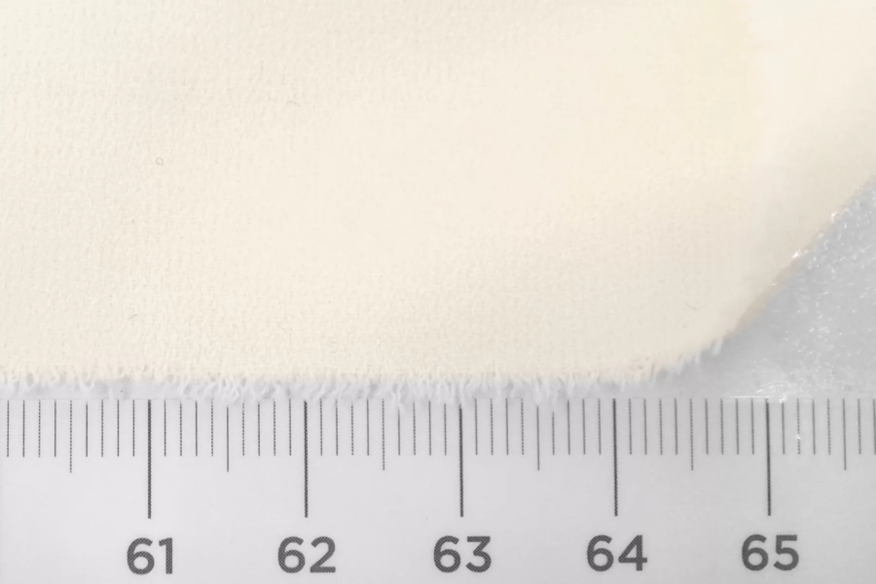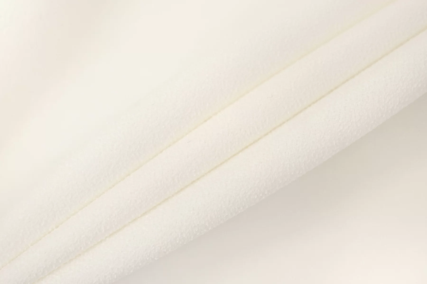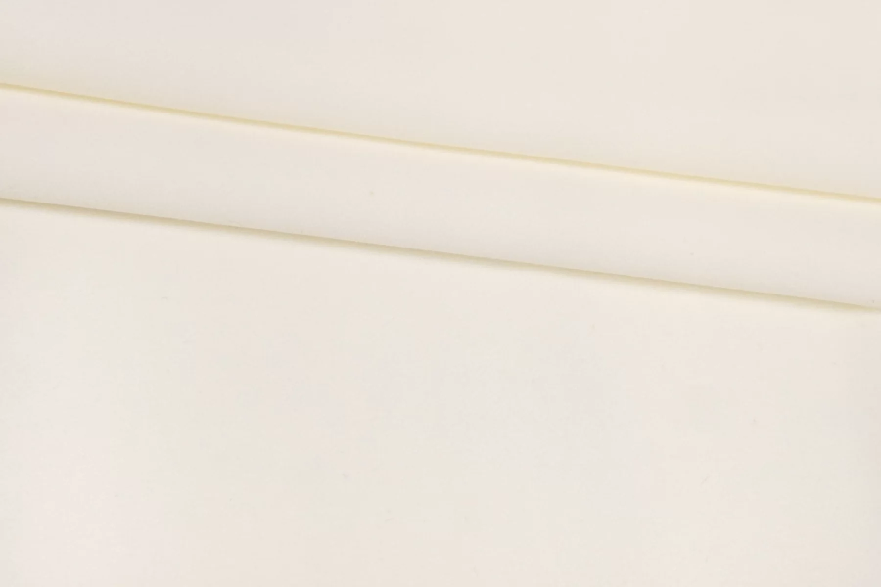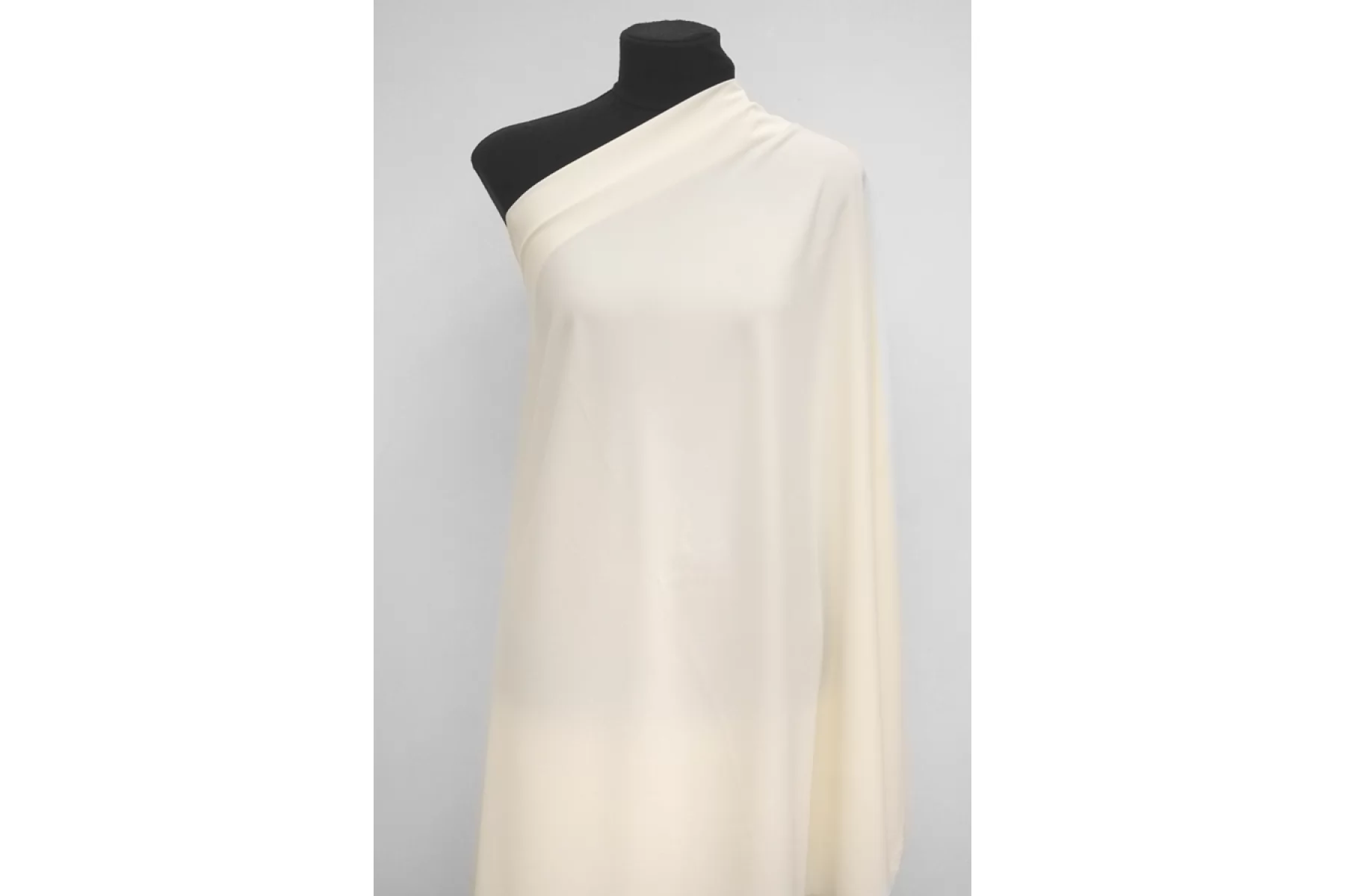 Плательный синтетический креп в молочно-белом цвете. Тянется в оба направления, немного просвечивает, пластичный. Подойдет для пошива платья, юбки, топа.