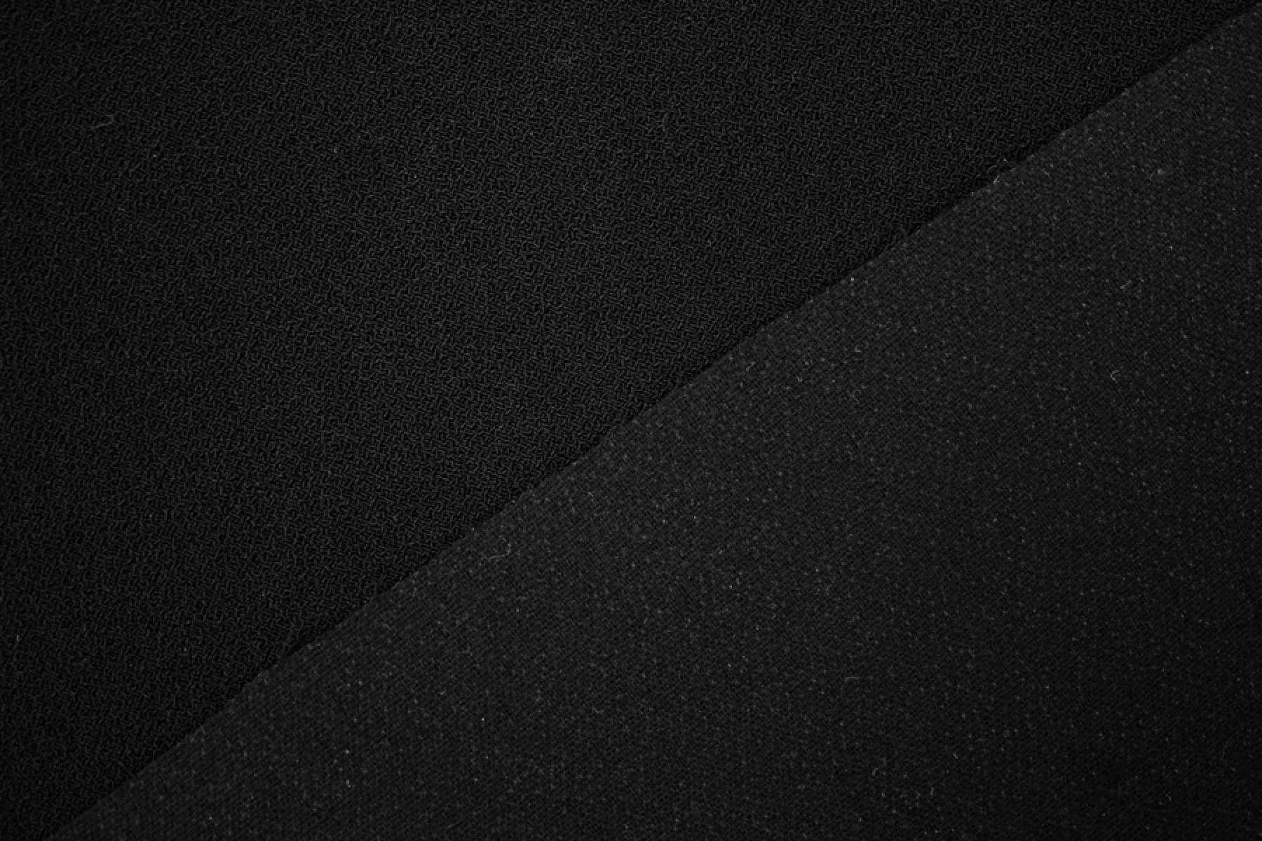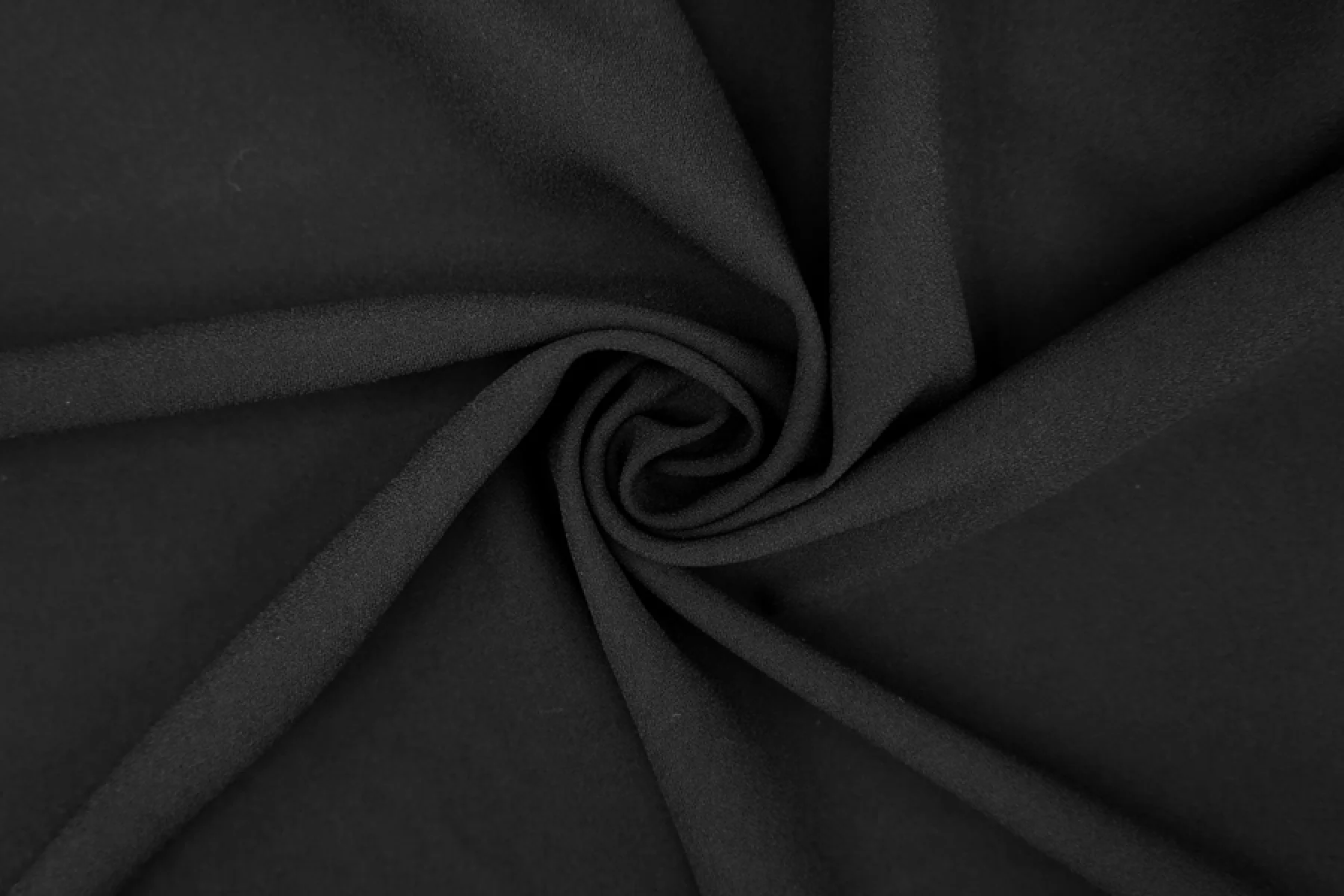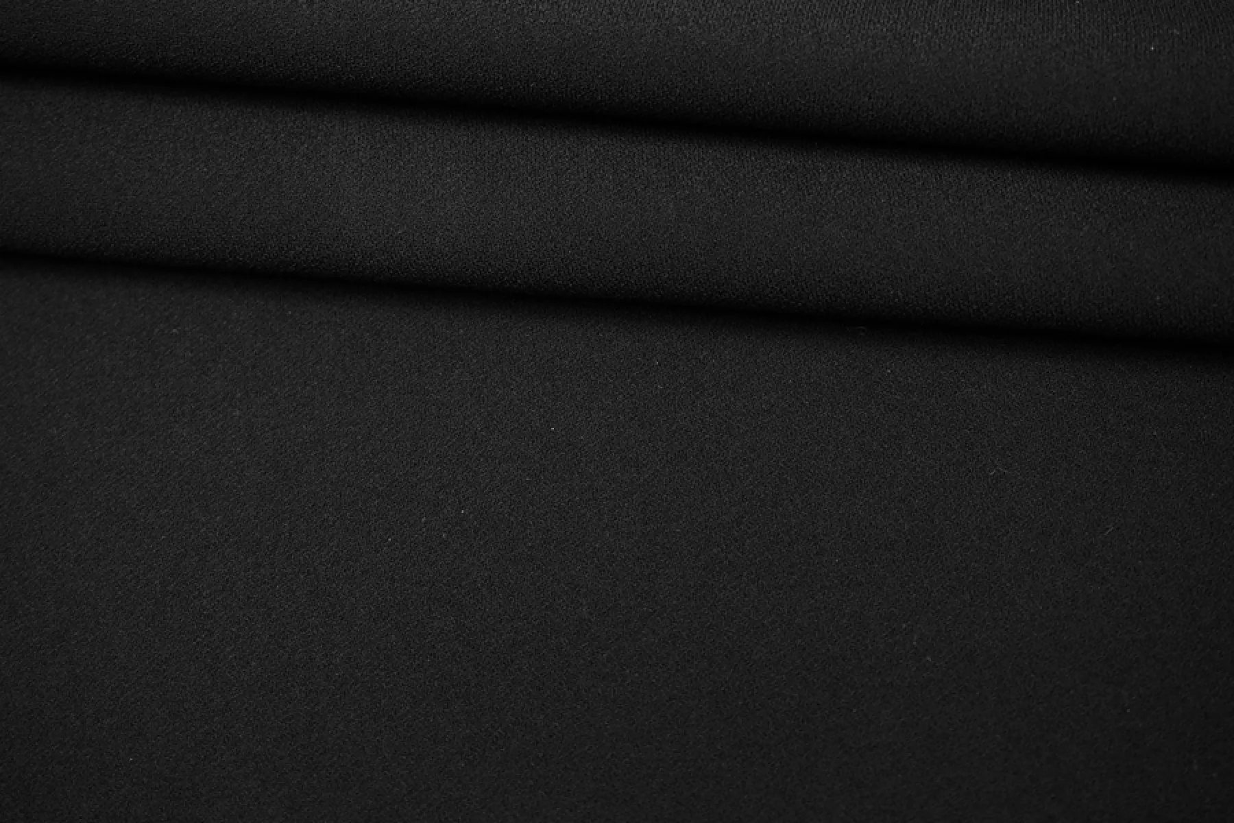 Костюмно-плательный креп черного цвета на дублерине. Хорошо держит форму и драпируется, не мнется. Материал плотный, не тянется. Не просвечивает. Подойдет на костюмные варианты, отрезные платья, брюки и юбки.