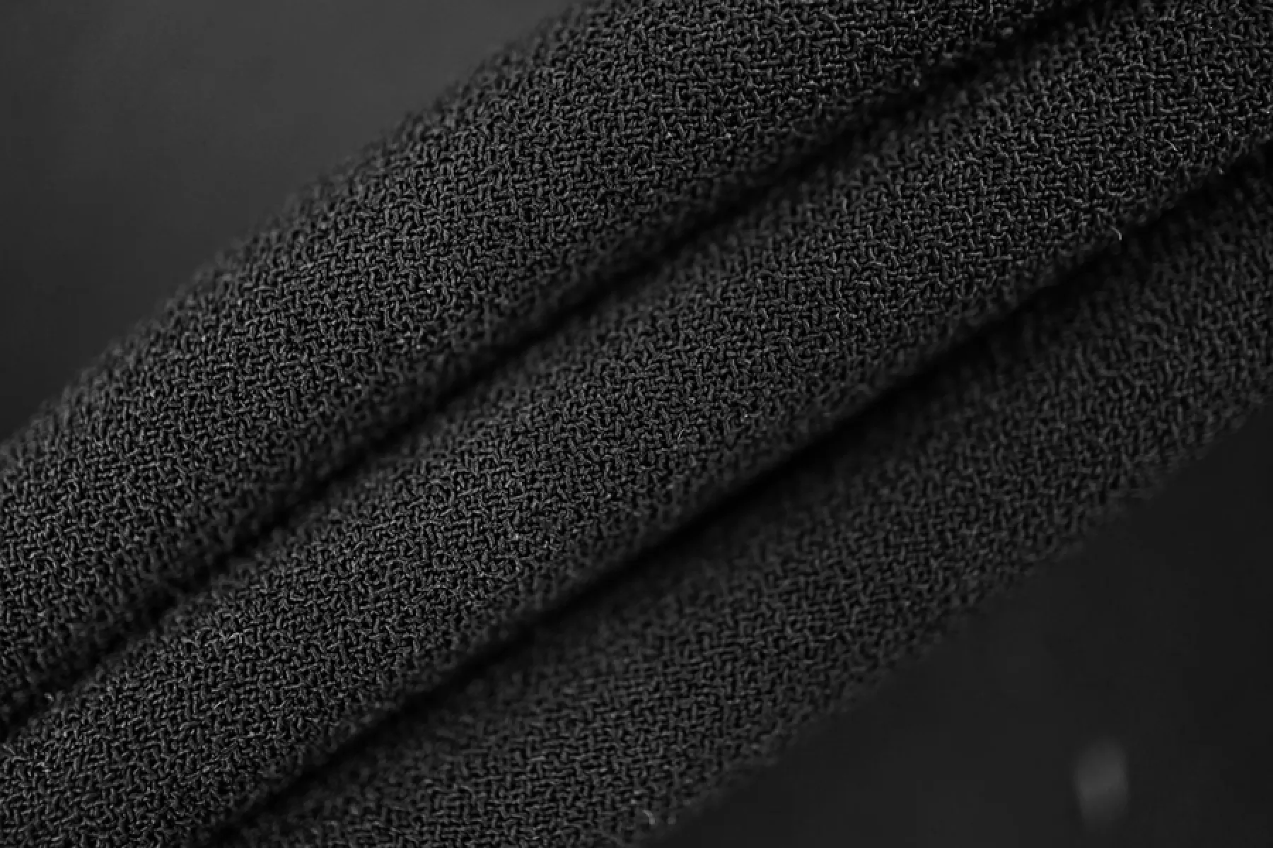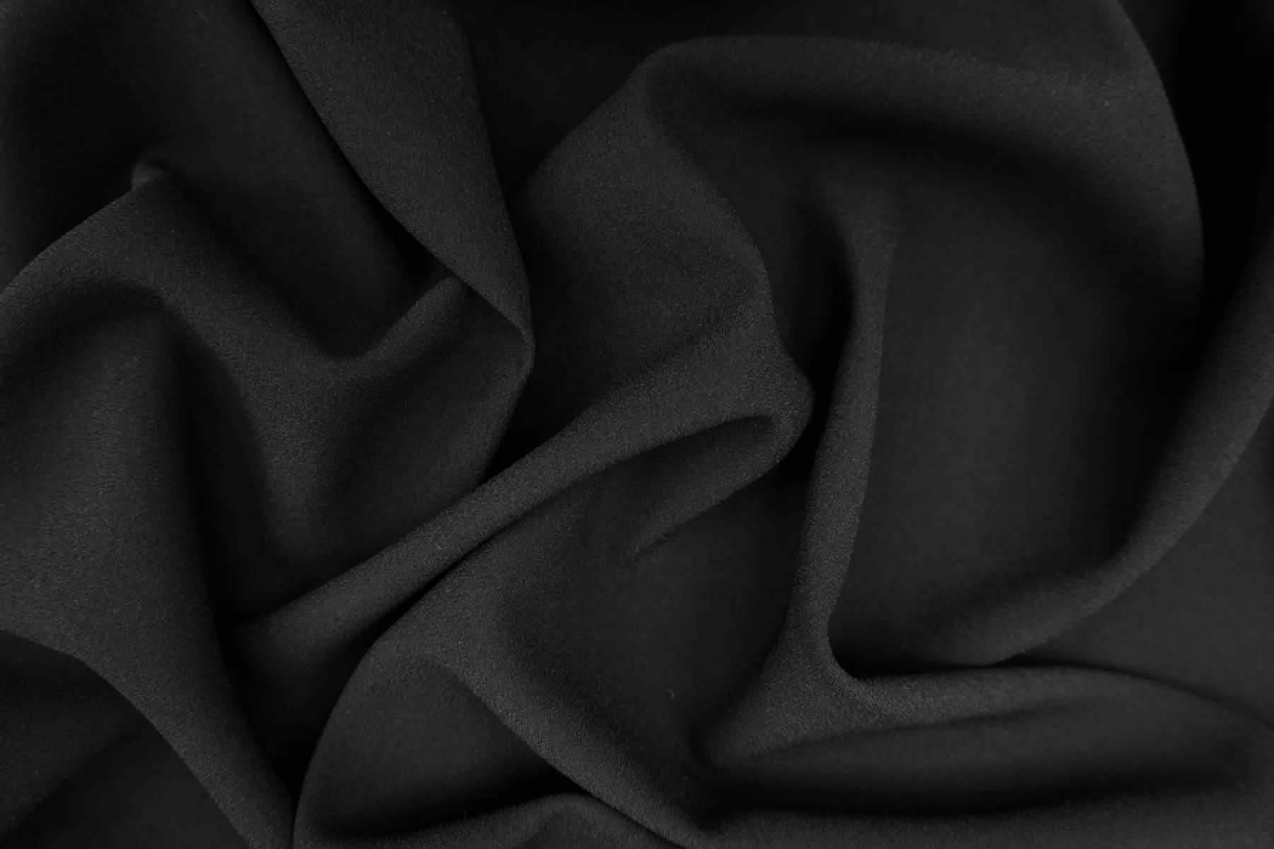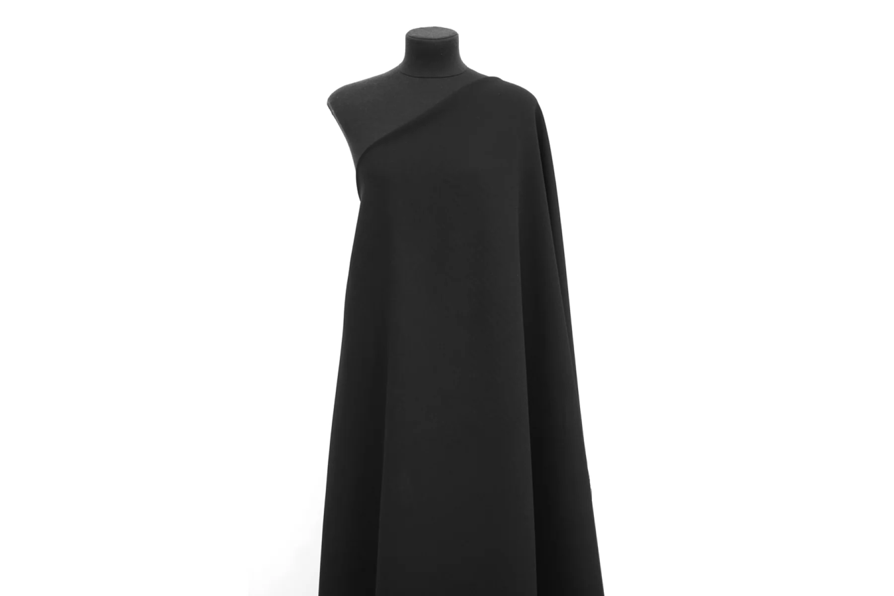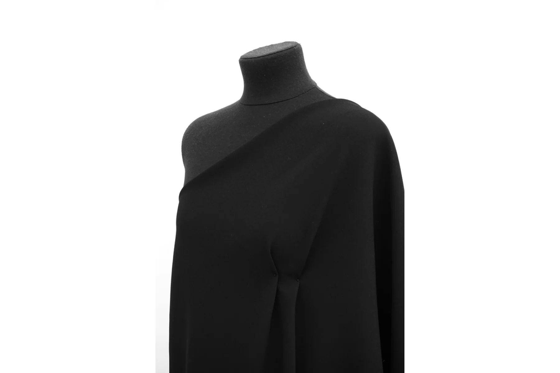 Костюмно-плательный креп черного цвета на дублерине. Хорошо держит форму и драпируется, не мнется. Материал плотный, не тянется. Не просвечивает. Подойдет на костюмные варианты, отрезные платья, брюки и юбки.