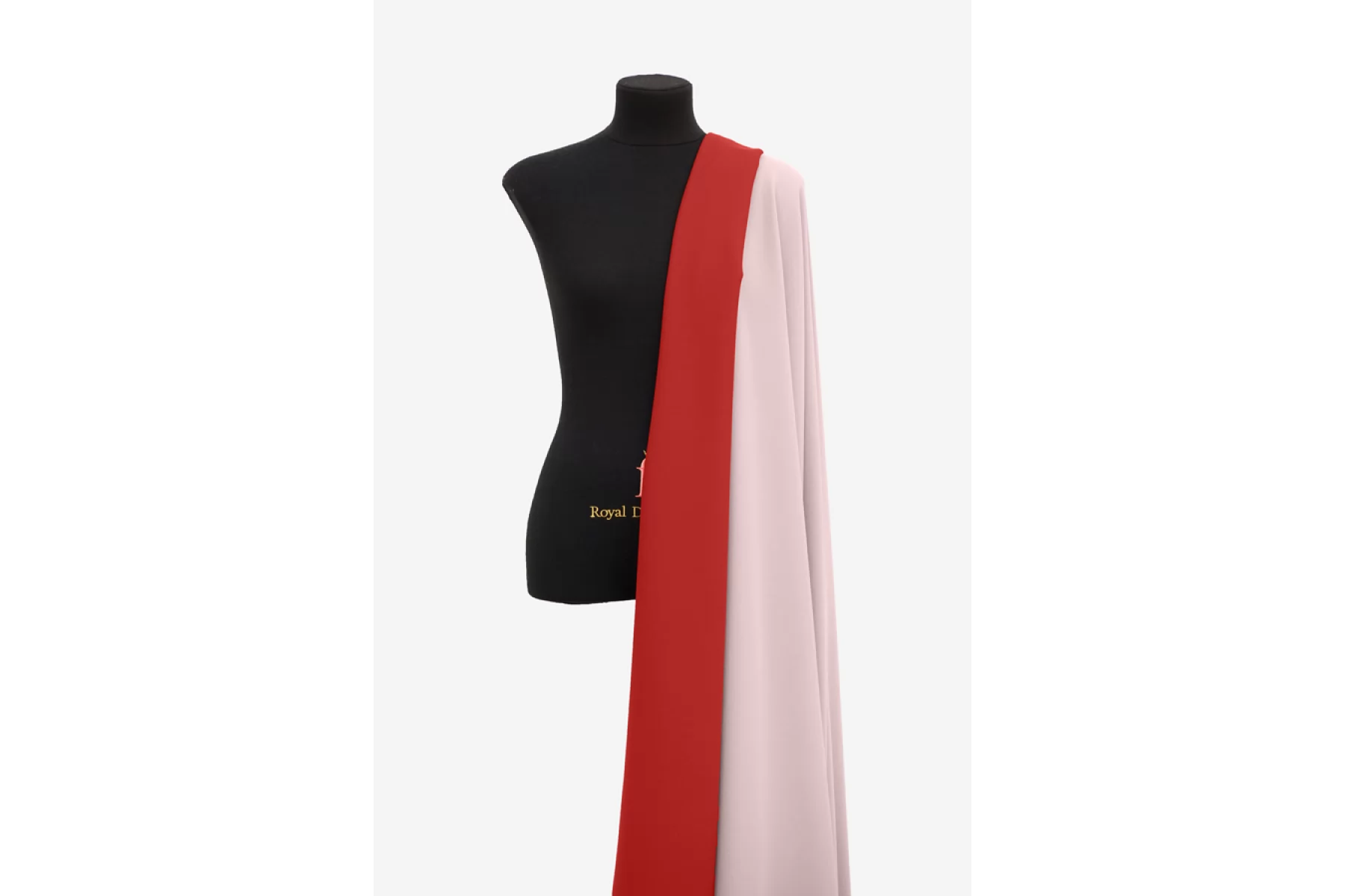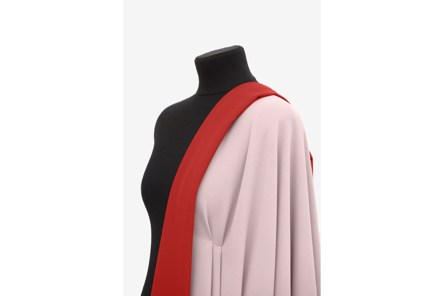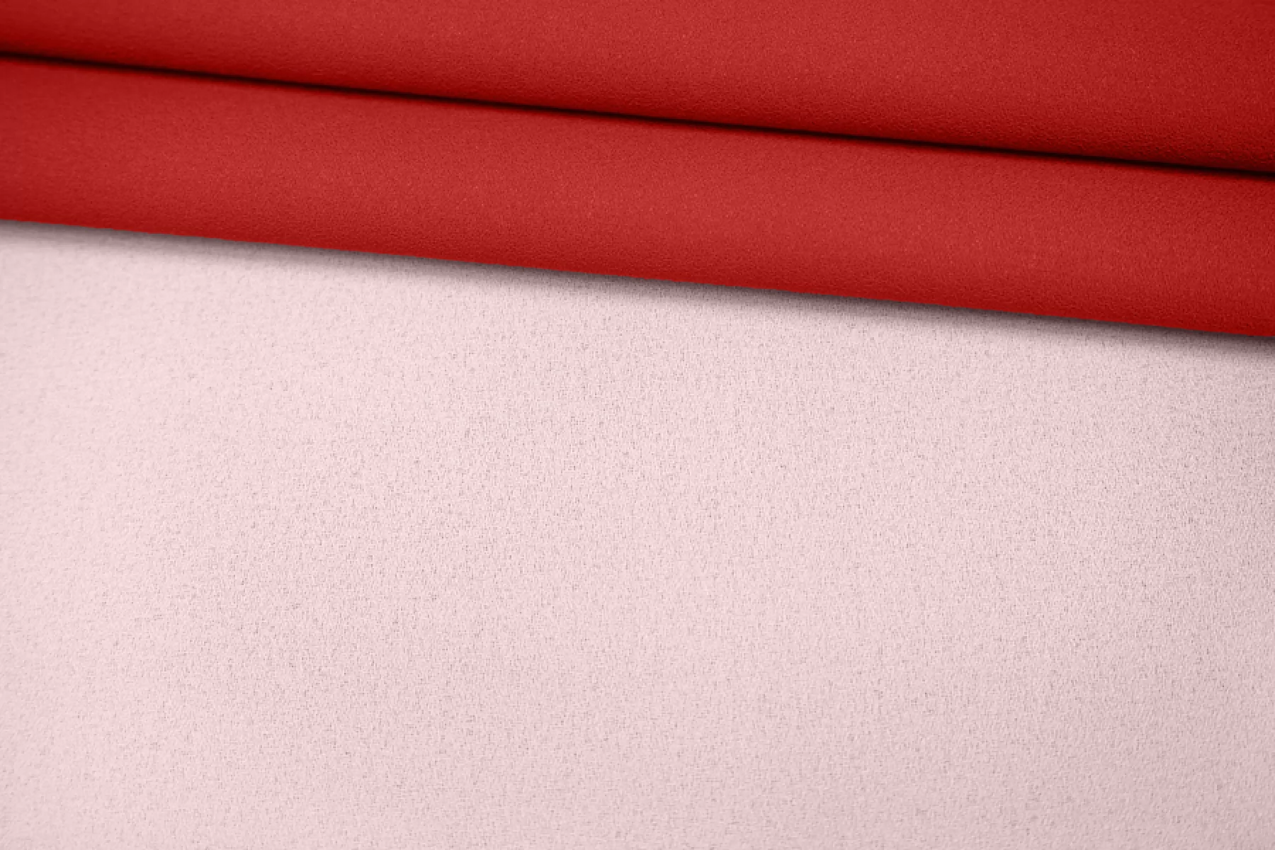 Интересная позиция - креп-шифон, состоящий из двух легкоразделяющихся склееных слоев. Один слой пудрового цвета, а второй - красного, оба рабочие. Материал плотный, формодержащий и не мнется. Слегка просвечивает силуэт. Шьем жакеты, платья юбки.