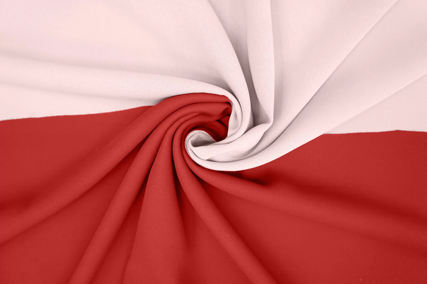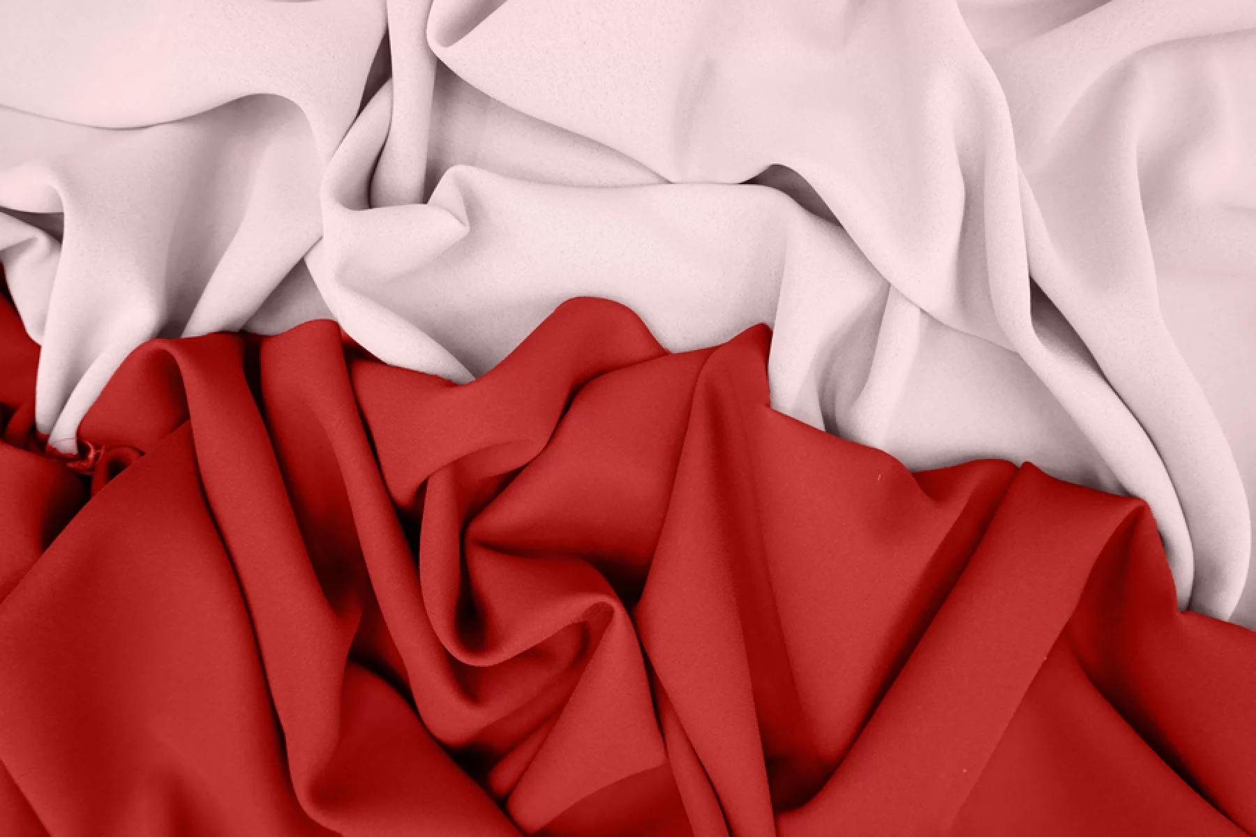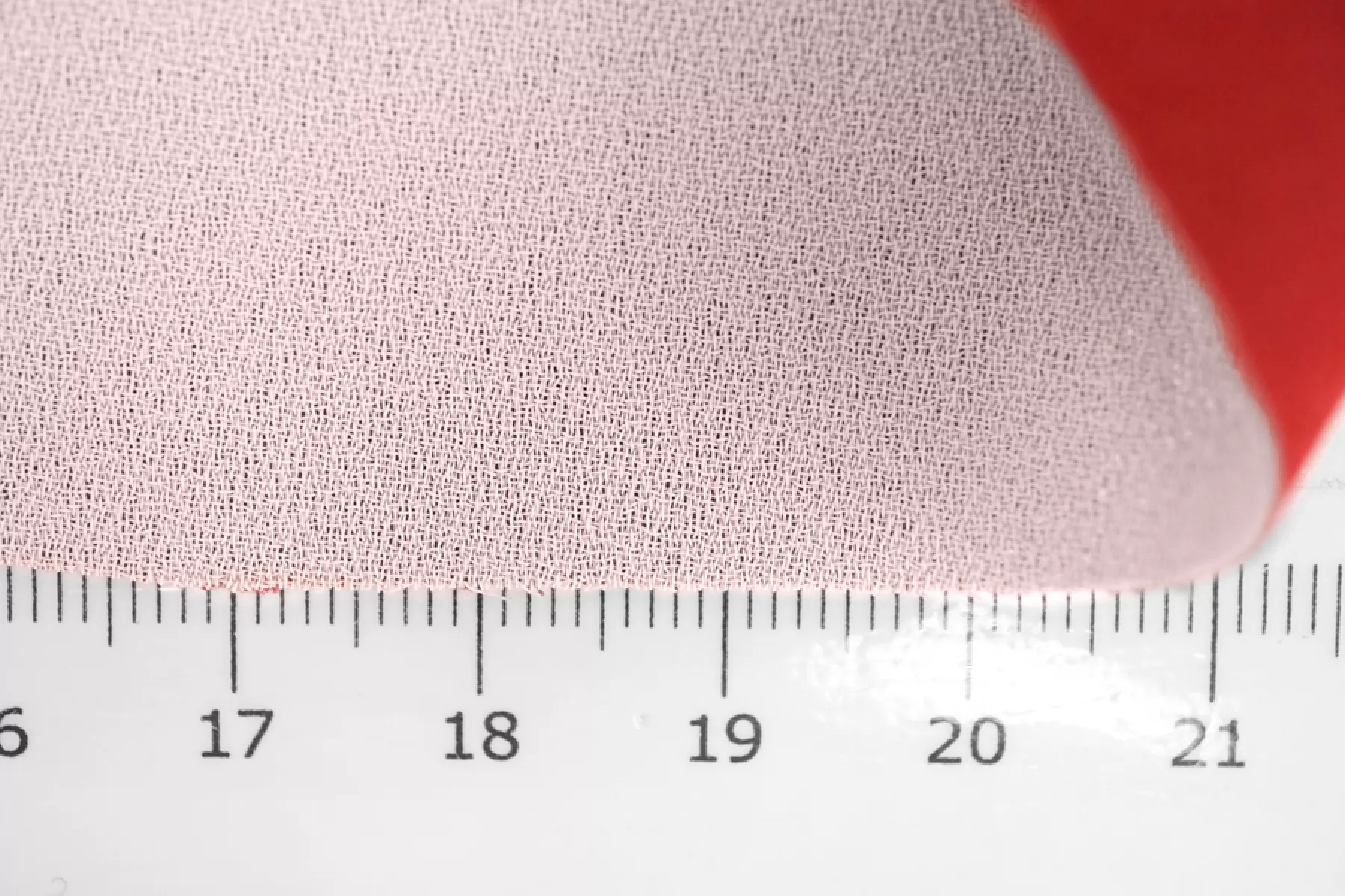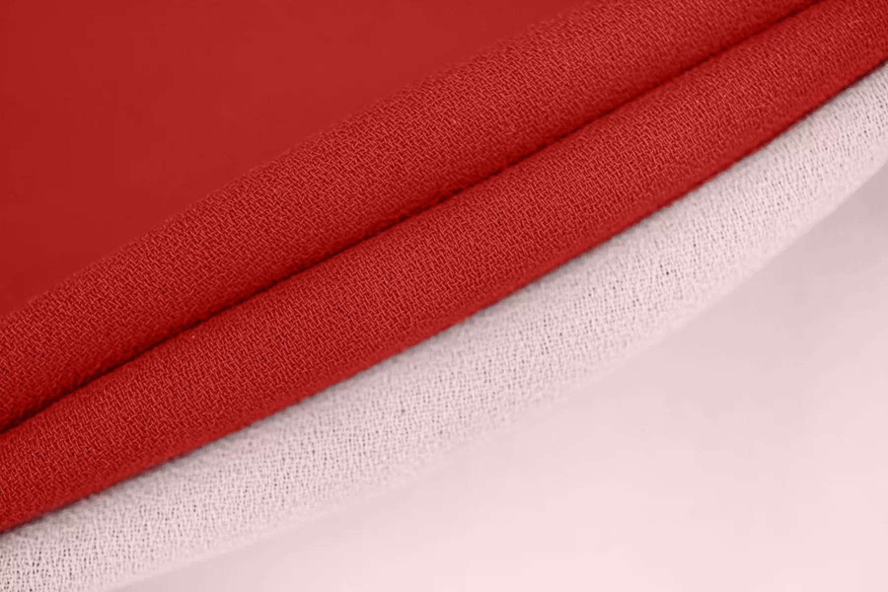 Интересная позиция - креп-шифон, состоящий из двух легкоразделяющихся склееных слоев. Один слой пудрового цвета, а второй - красного, оба рабочие. Материал плотный, формодержащий и не мнется. Слегка просвечивает силуэт. Шьем жакеты, платья юбки.