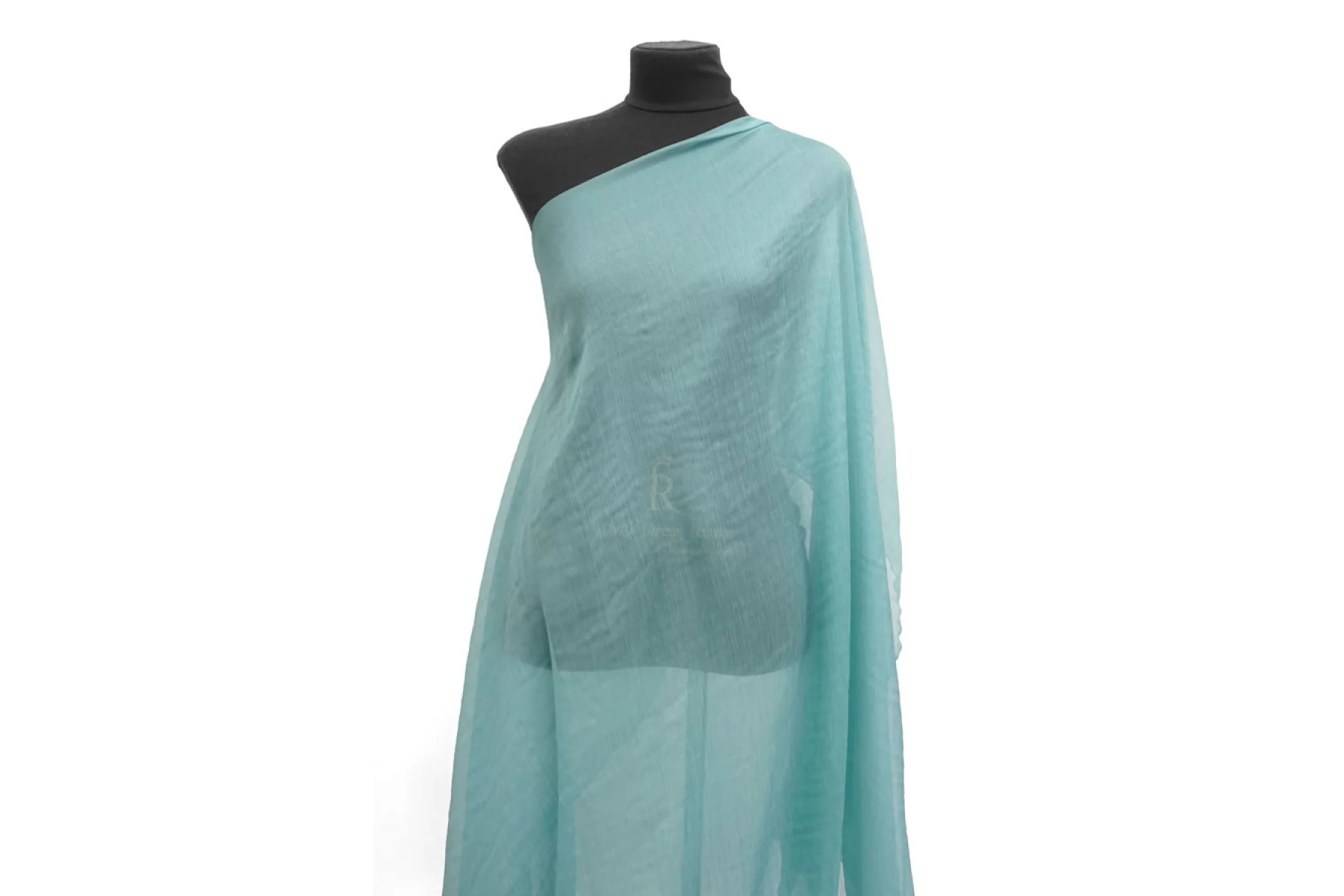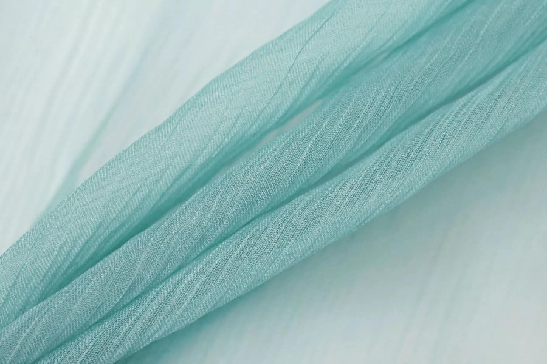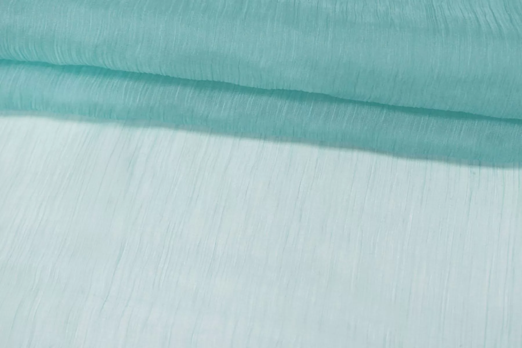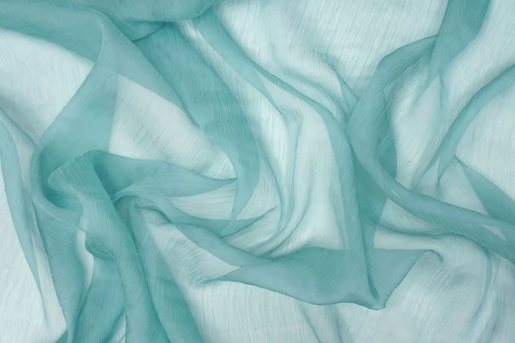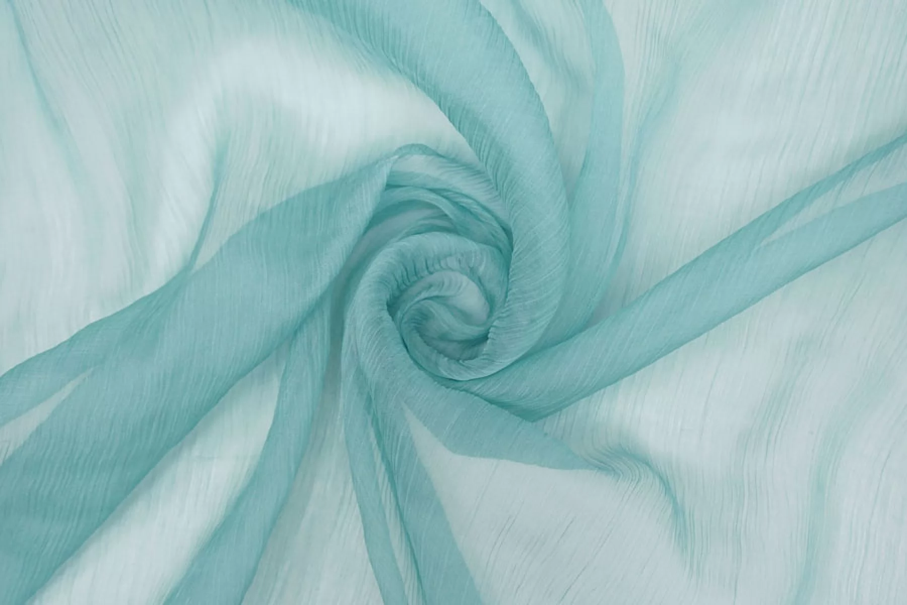 Крешированный шелковый шифон в светло-бирюзовом оттенке. Струящийся, летящий, воздушный, шероховатый, отлично тянется за счет фактуры жатой. Прозрачный. Подойдет на платье, блузку, юбку. Уход, как и за любым шелком, деликатный.