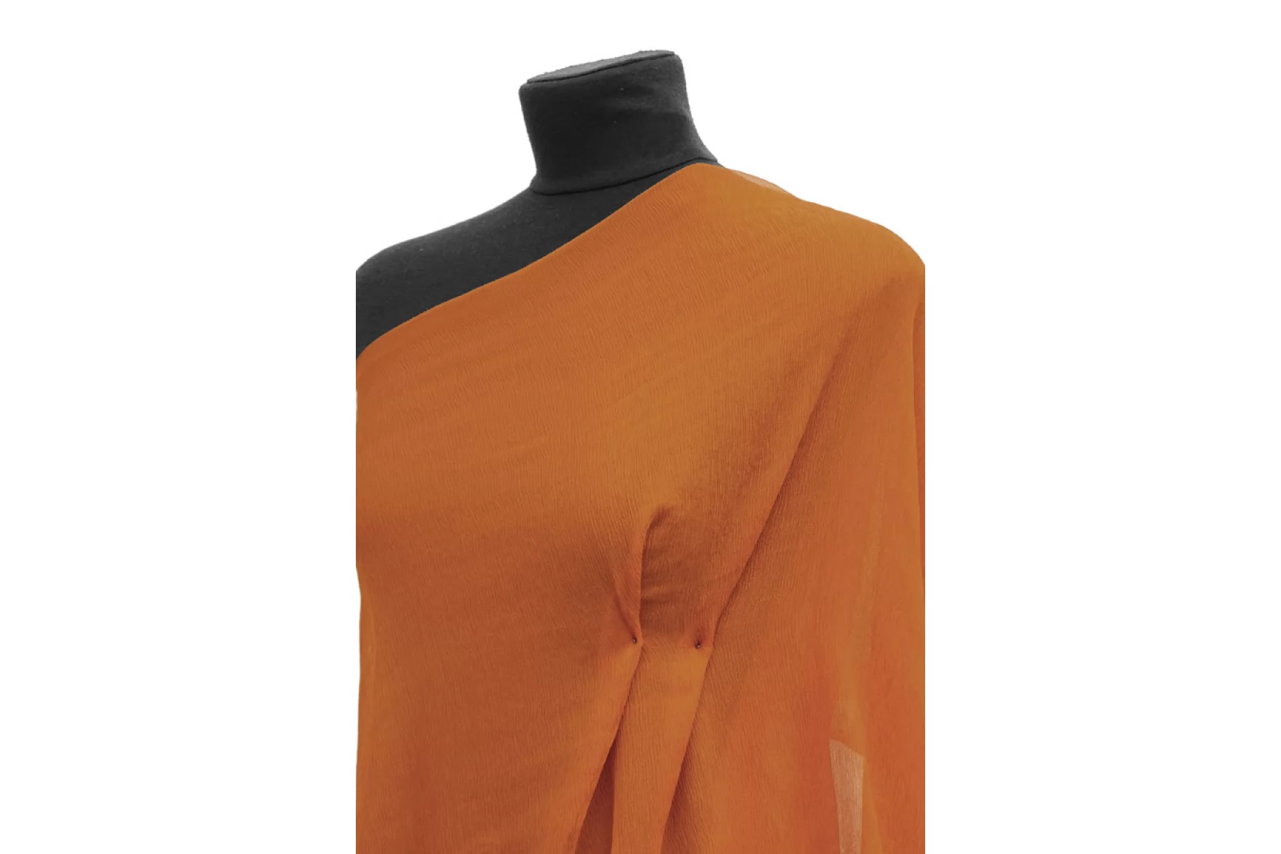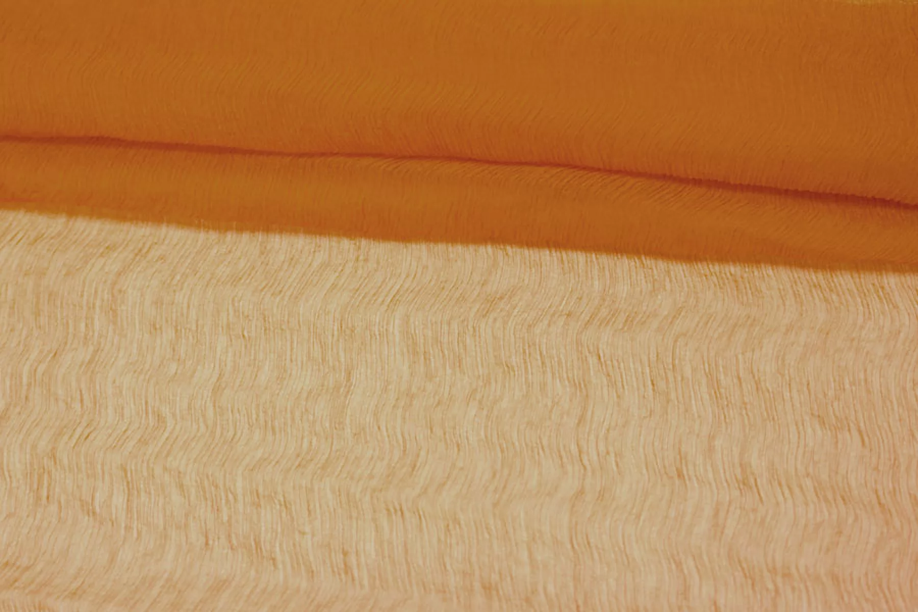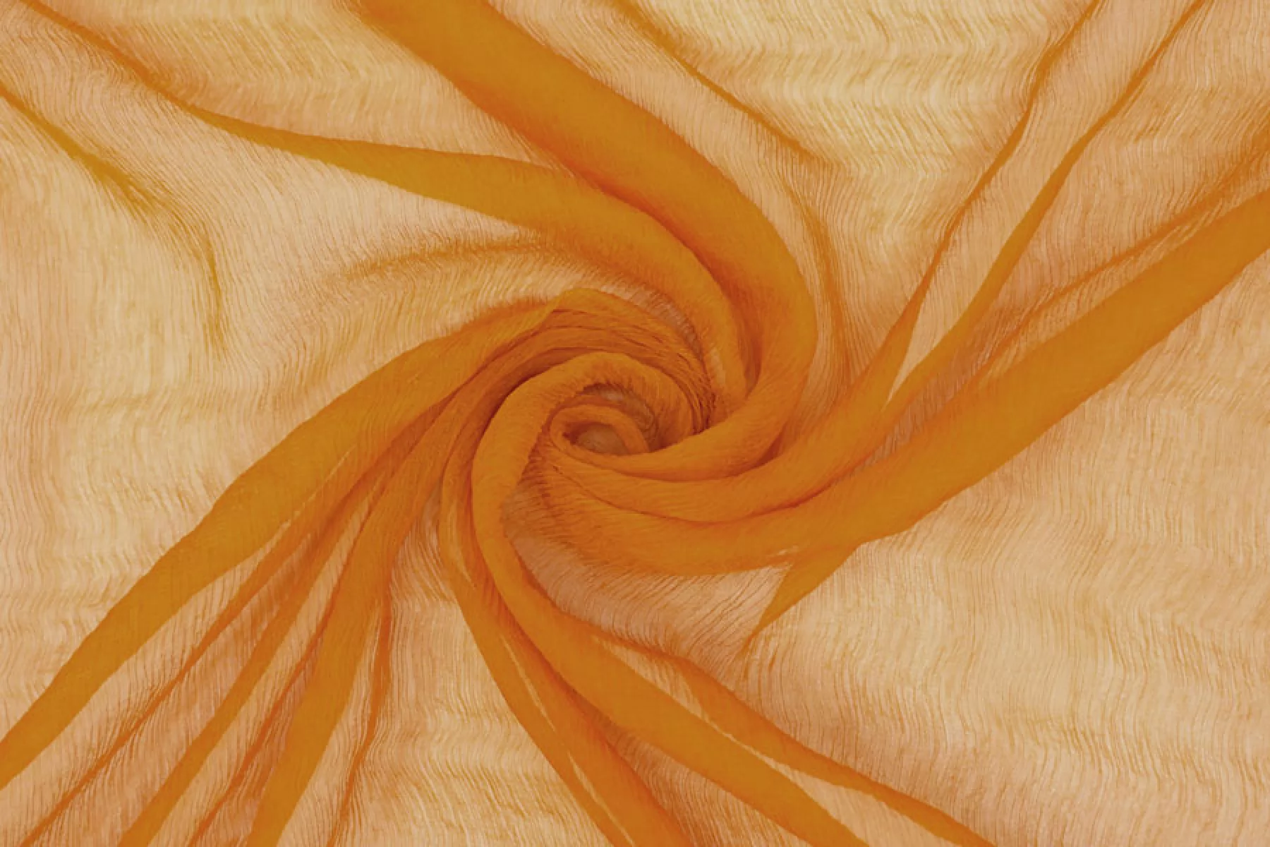 Крешированный шелковый шифон в тыквенном оттенке. Струящийся, летящий, воздушный, шероховатый, отлично тянется за счет жатой фактуры. Прозрачный. Подойдет на платье, блузку, юбку. Уход, как и за любым шелком, деликатный.