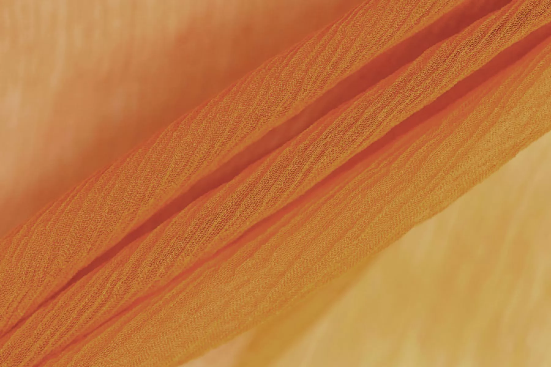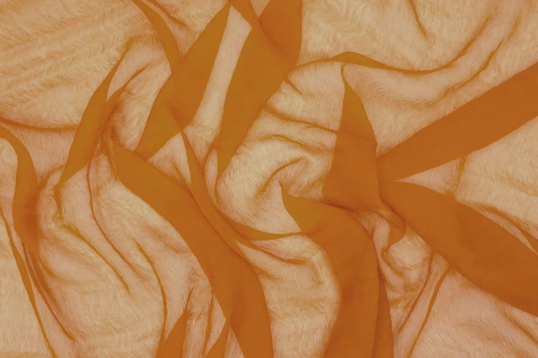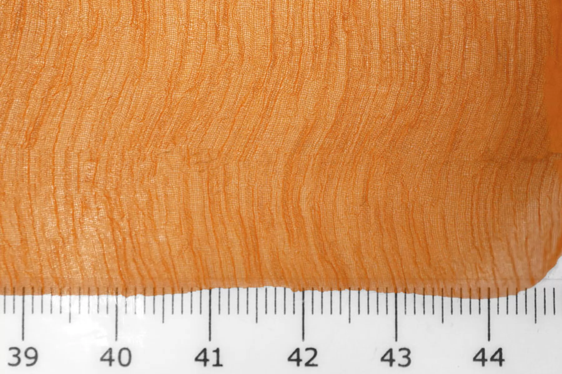 Крешированный шелковый шифон в тыквенном оттенке. Струящийся, летящий, воздушный, шероховатый, отлично тянется за счет жатой фактуры. Прозрачный. Подойдет на платье, блузку, юбку. Уход, как и за любым шелком, деликатный.