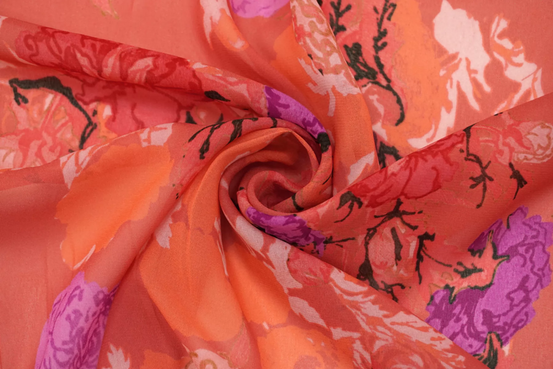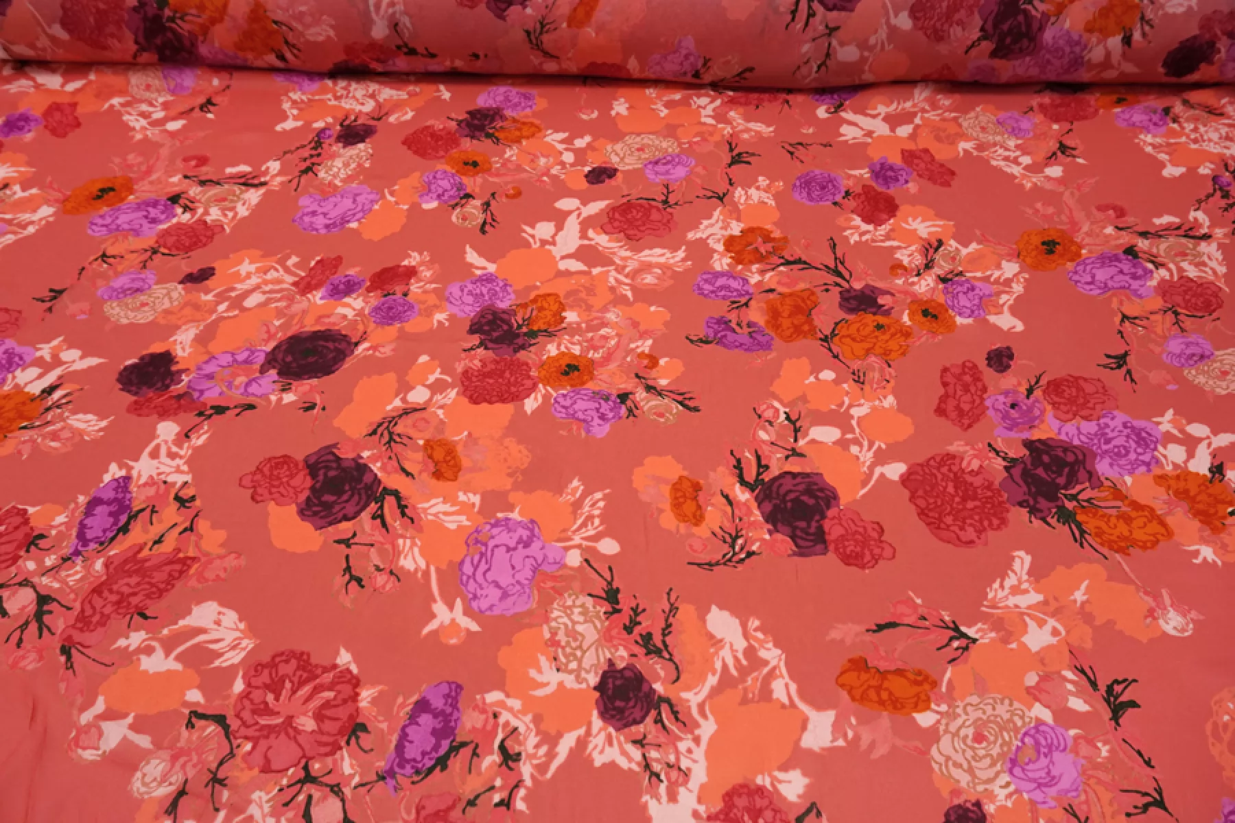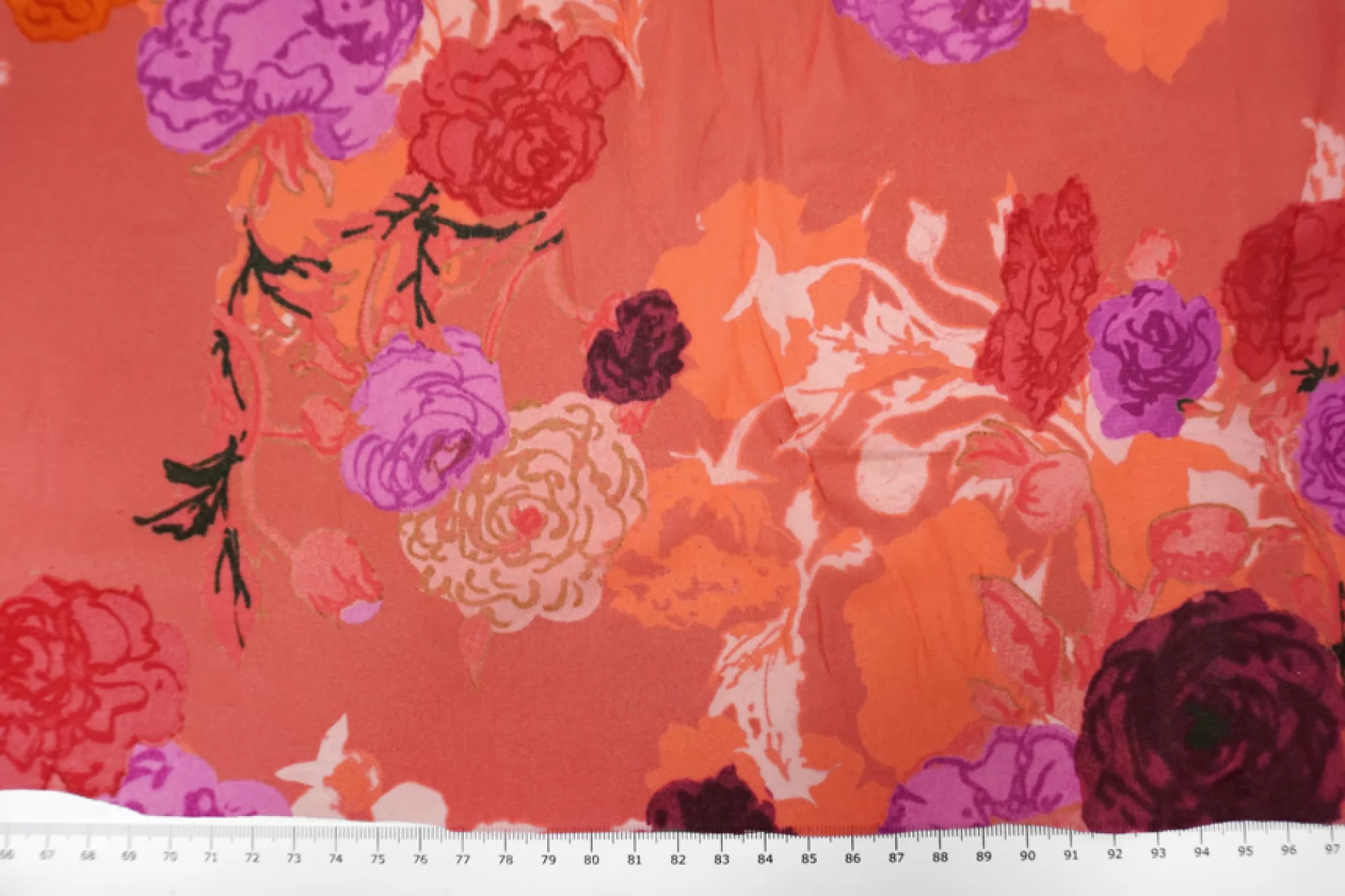 Вискозный креп-шифон в персиково-розовых оттенках с цветочным принтом. Струящийся, летящий, воздушный, шероховатый, не тянется. Полупрозрачный. Подойдет для пошива блузки, туники, платья, юбки (на подкладе или многослойной).