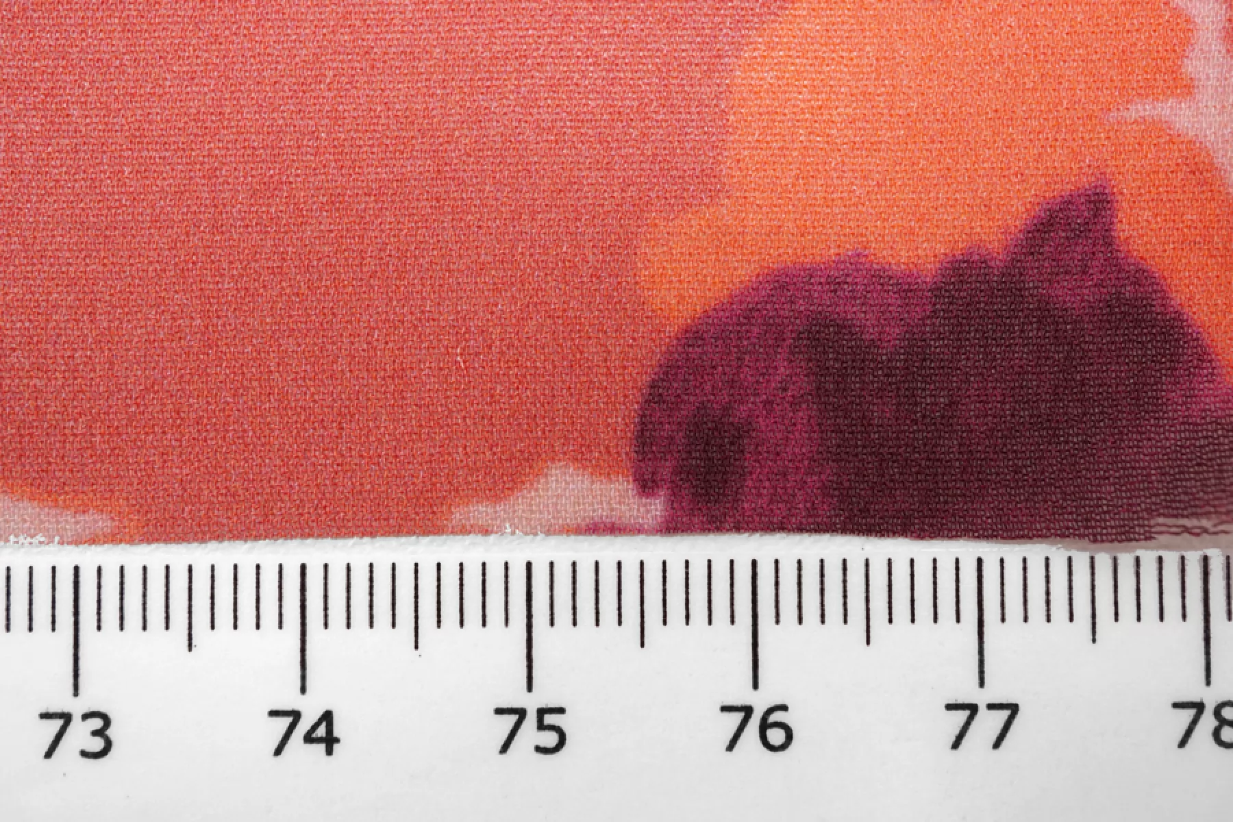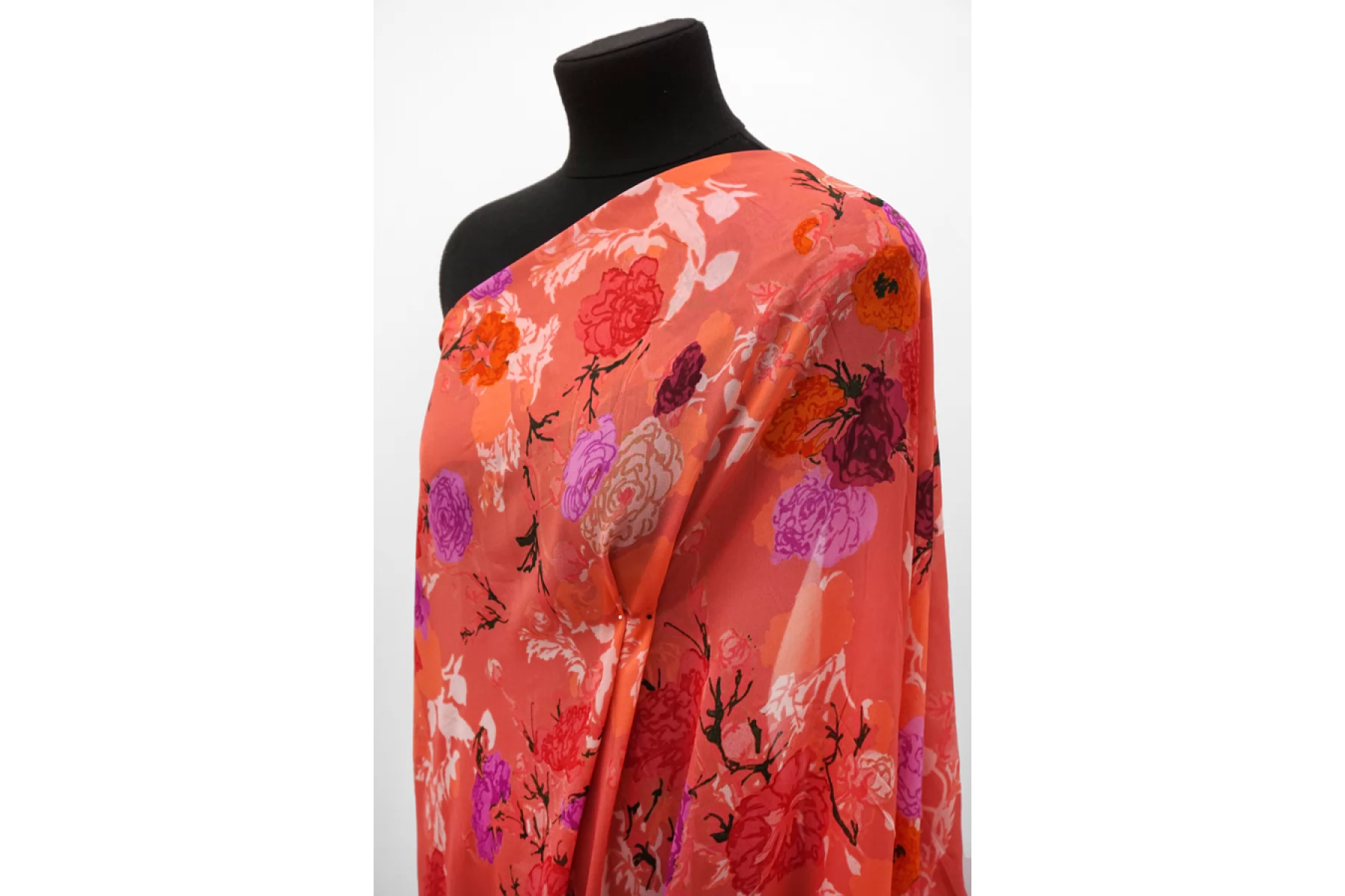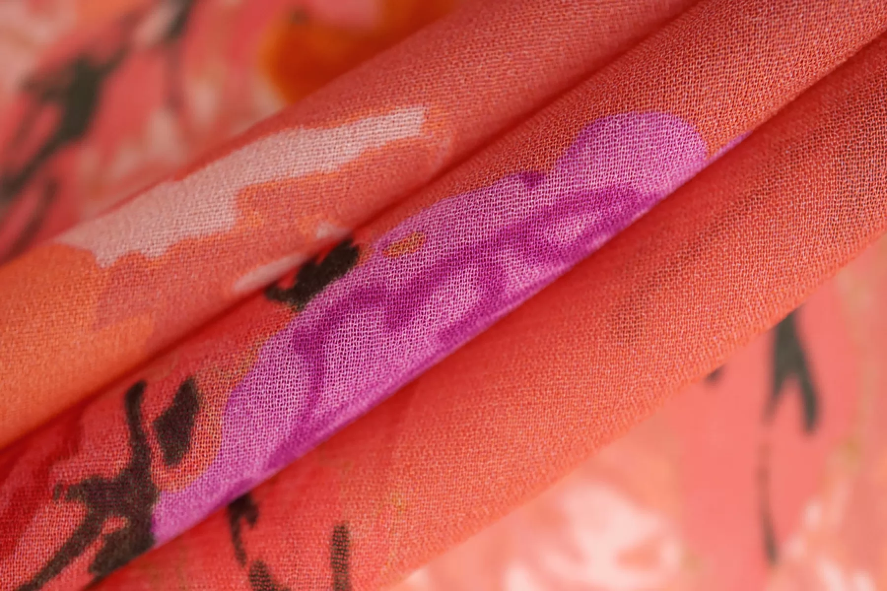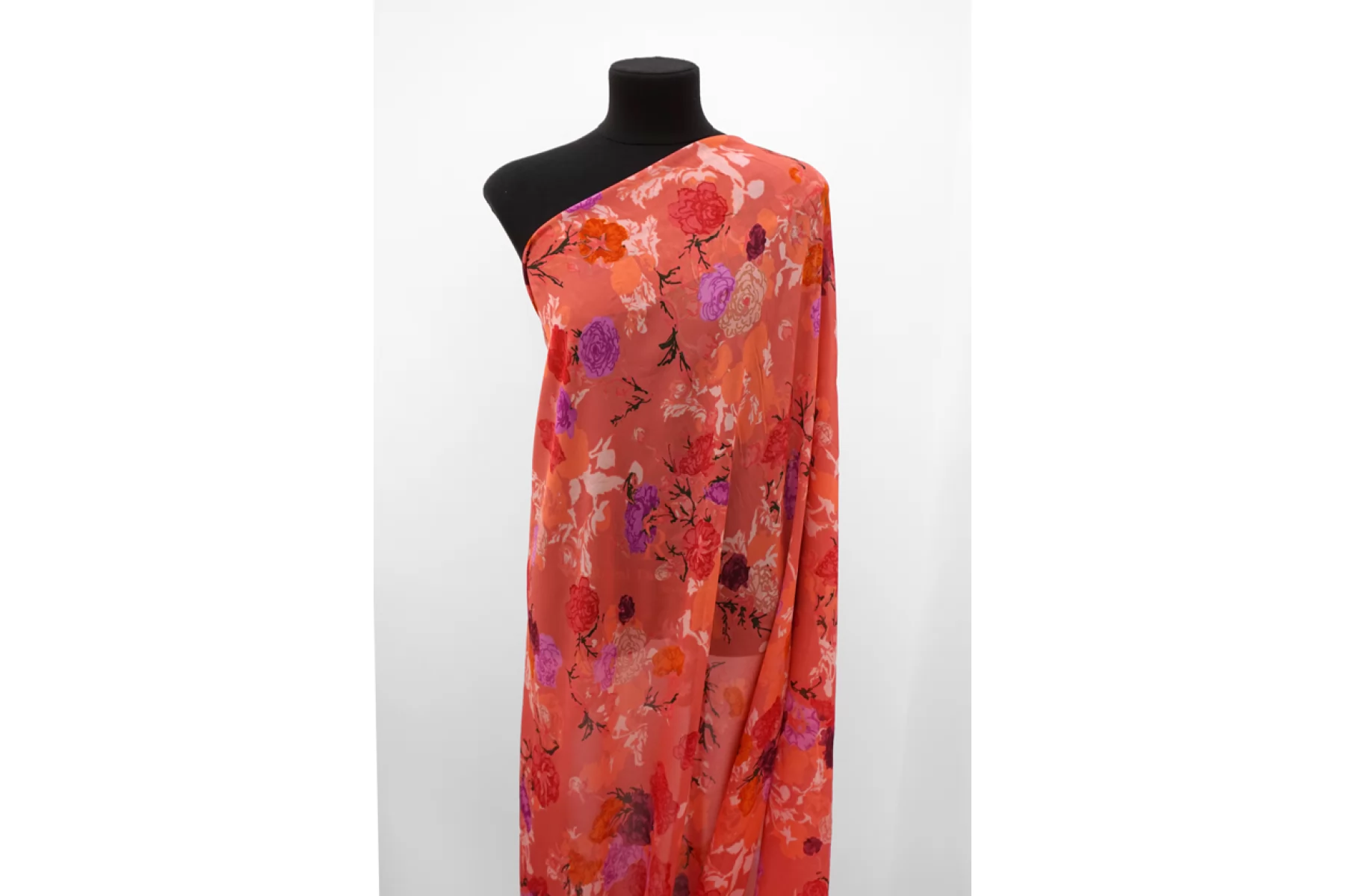 Вискозный креп-шифон в персиково-розовых оттенках с цветочным принтом. Струящийся, летящий, воздушный, шероховатый, не тянется. Полупрозрачный. Подойдет для пошива блузки, туники, платья, юбки (на подкладе или многослойной).