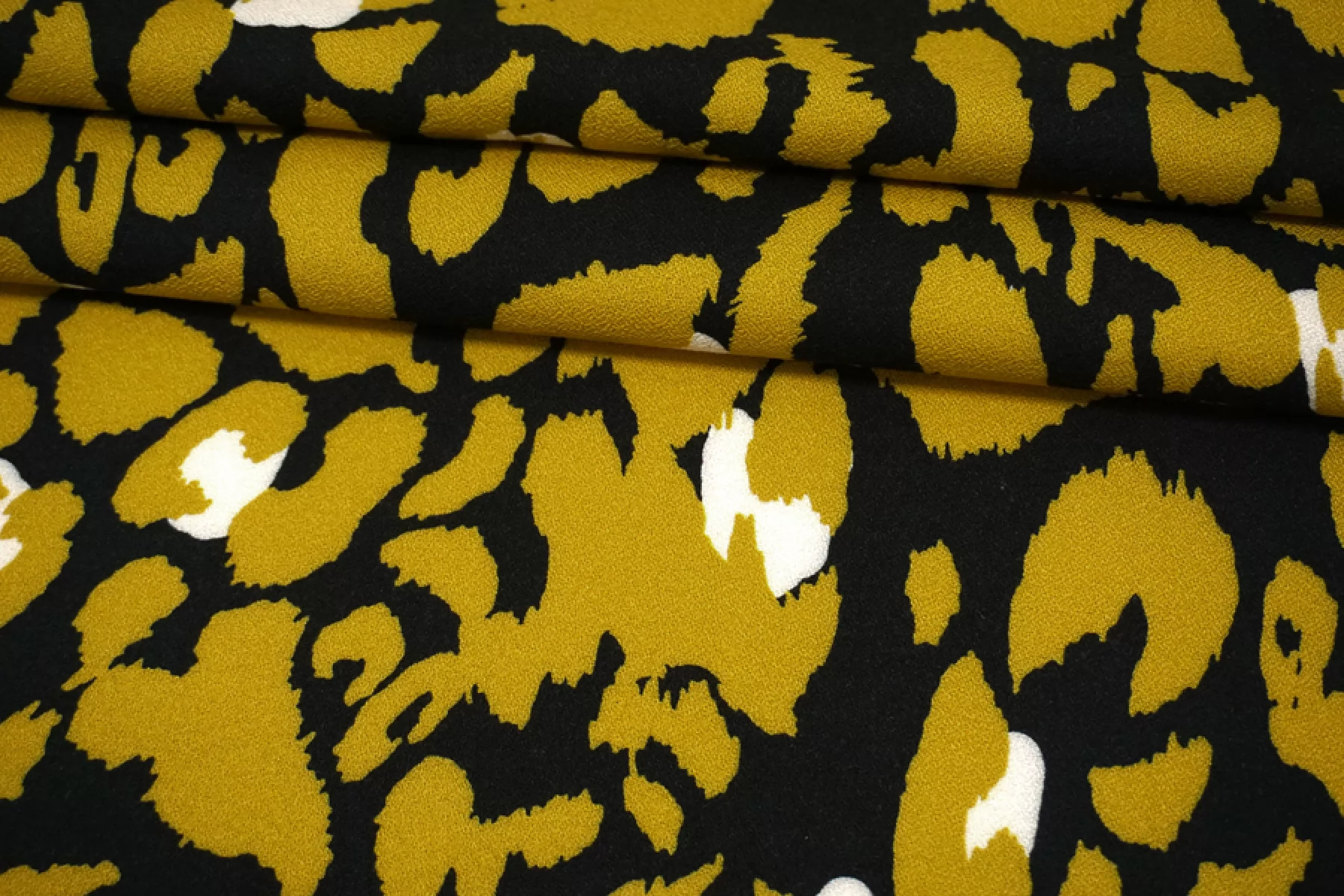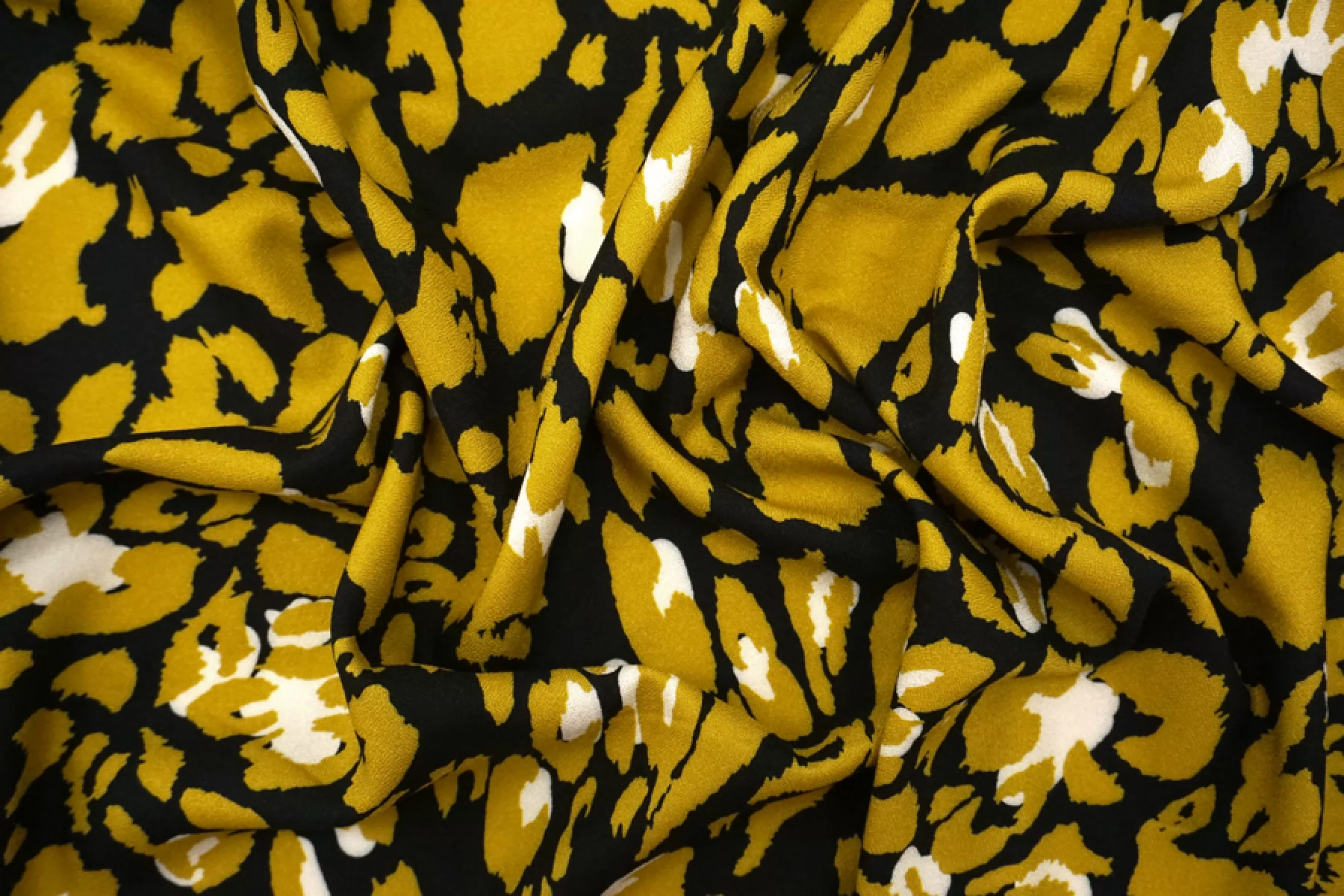 Вискозный плательный креп с принтом - абстракцией на горчичном фоне (без рыжины). Шероховатый материал, струящийся. Подойдет для пошива платья, топа, свободных штанов, юбки. Тонкий, пластичный. При работе с этой тканью советуем использовать тонкие иглы и нитки.