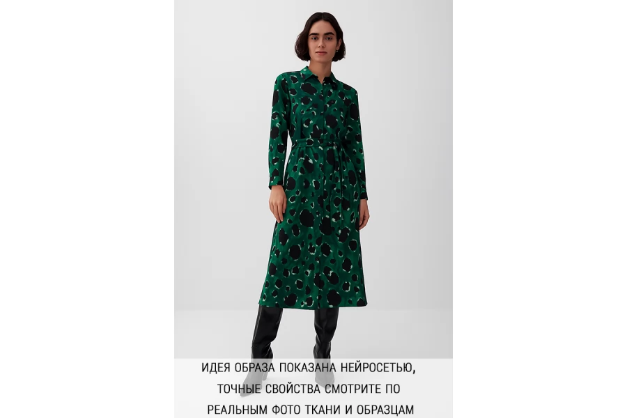 Плотная и красивая креповая вискоза с абстрактным изумрудно-зеленым и черно-коричневым принтом. Материал тактильно зернистый, достаточно увесистый, не тянется, но слегка пружинит за счет плетения. Немного просвечивает силуэт. Не мнется. Вискоза пластичная, слегка держит форму. Шьем платье, мягкие жакеты или юбку. Обязательно учитывайте усадку 5-10%. При необходимости используйте подкладочный материал.