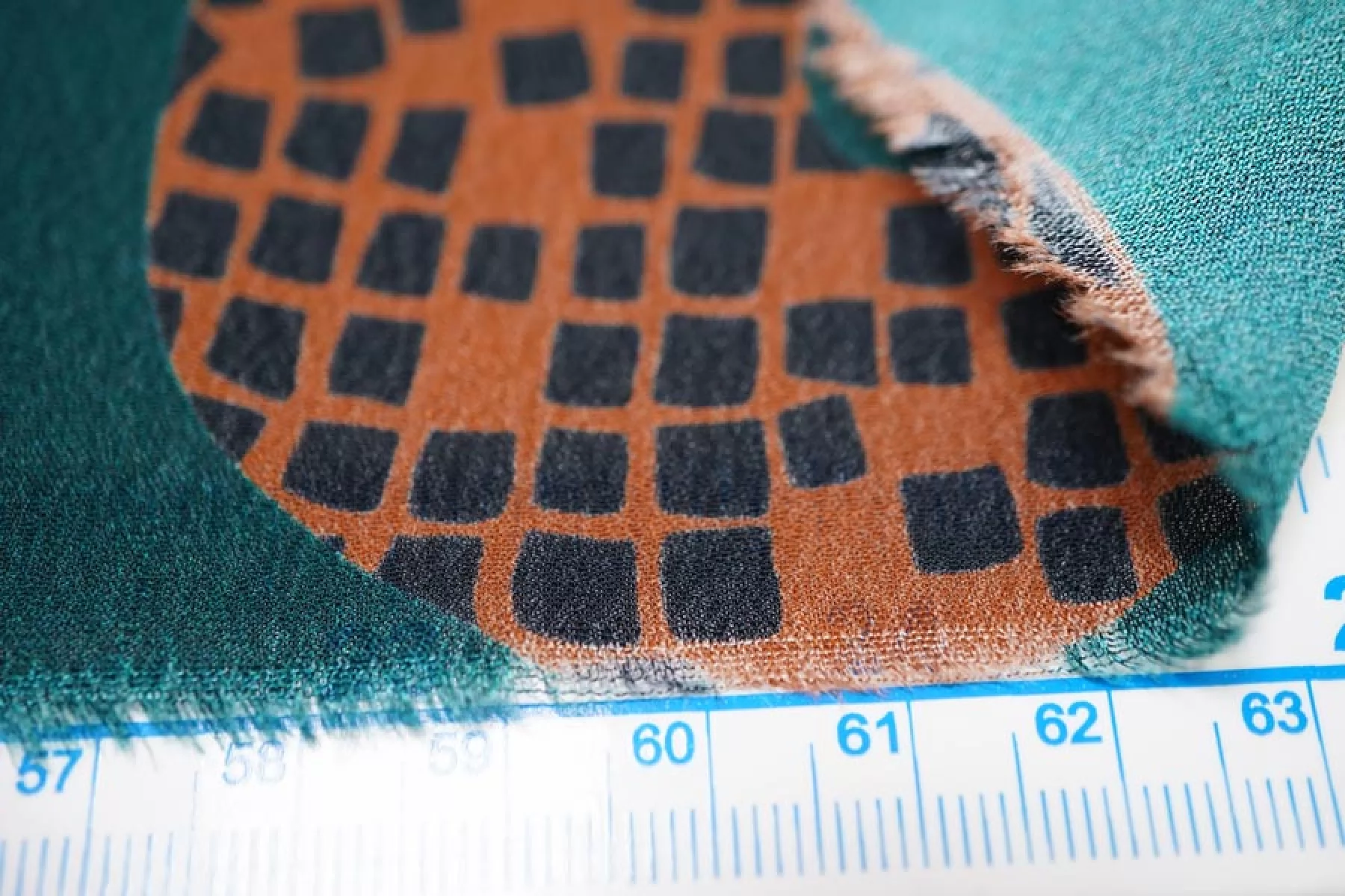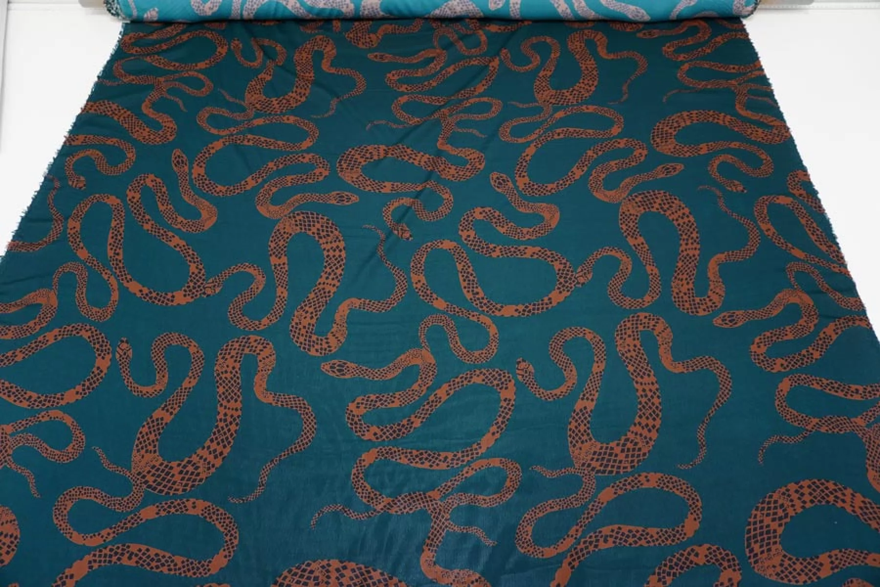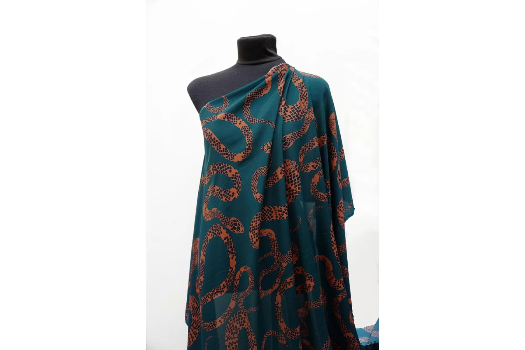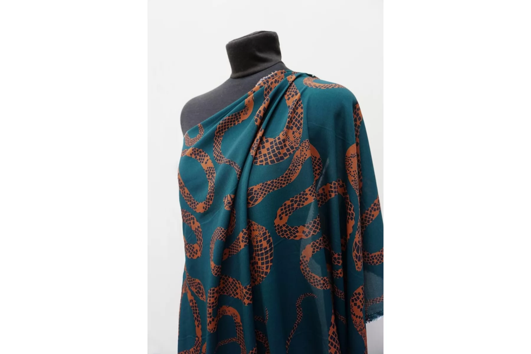 Итальянская креповая вискоза, довольно тонкая с красивым принтом в виде стилизованных змей (слегка выбеленный коричневый с тёплым подтоном) на тёмно-бирюзовом фоне. Просвечивает в один слой, пластичная, легкая, тактильно сухая, скользящая. Плетение немного тянется (пружинит). Подойдет для пошива платья, сарафана, блузки или юбки.