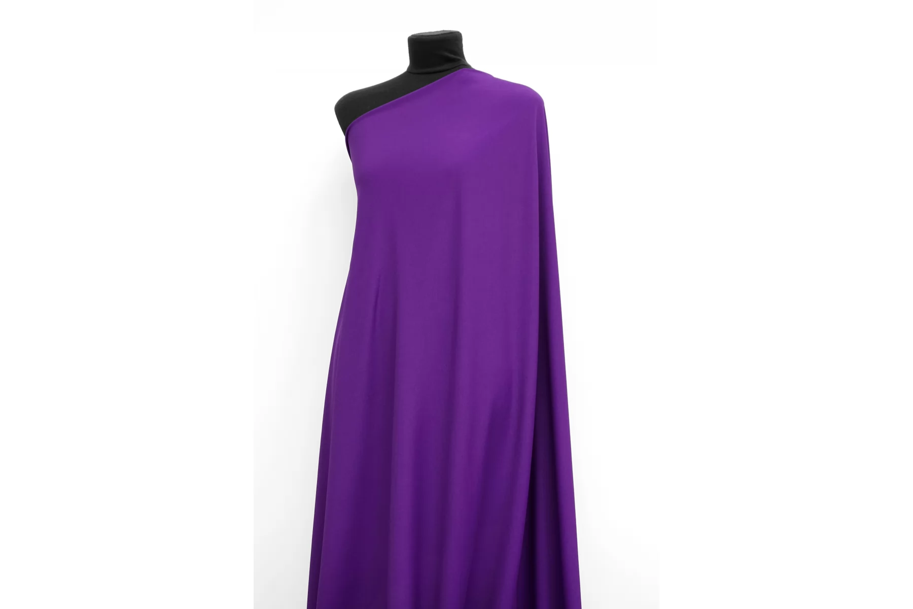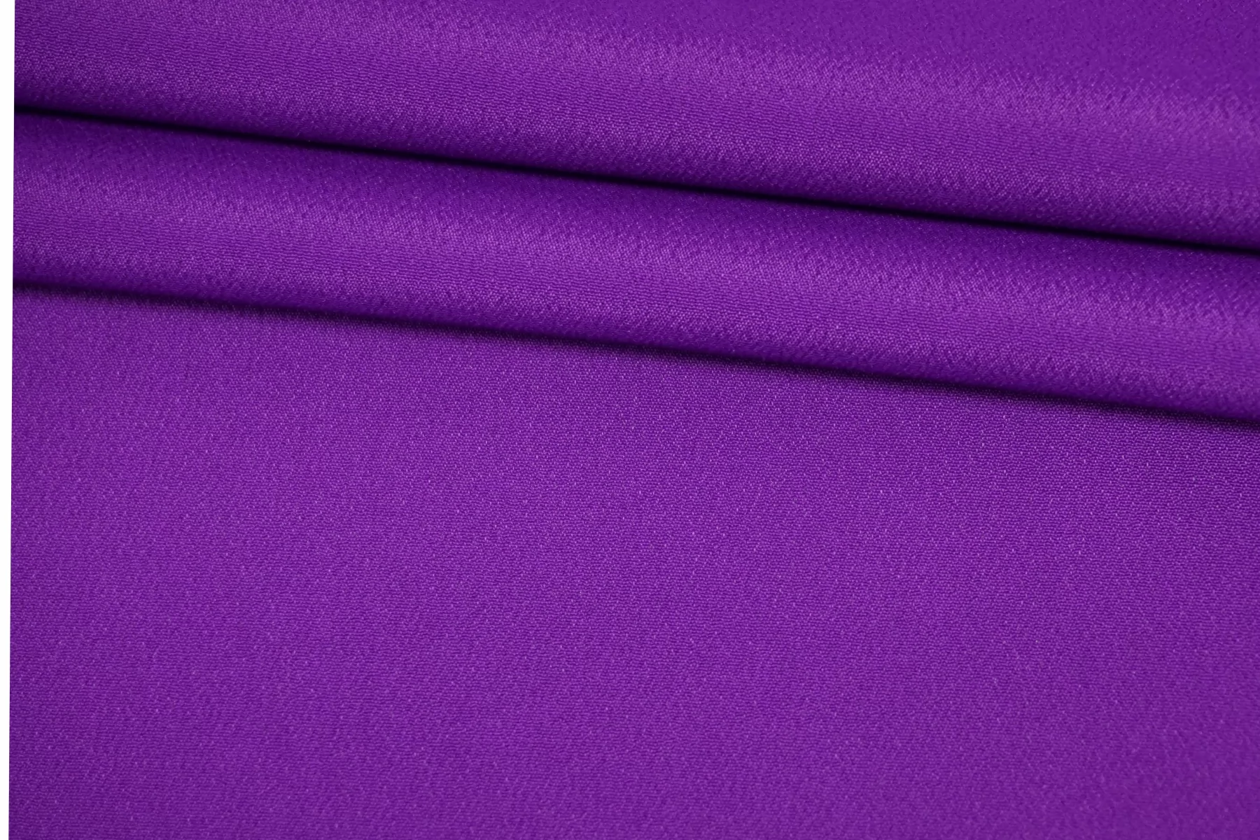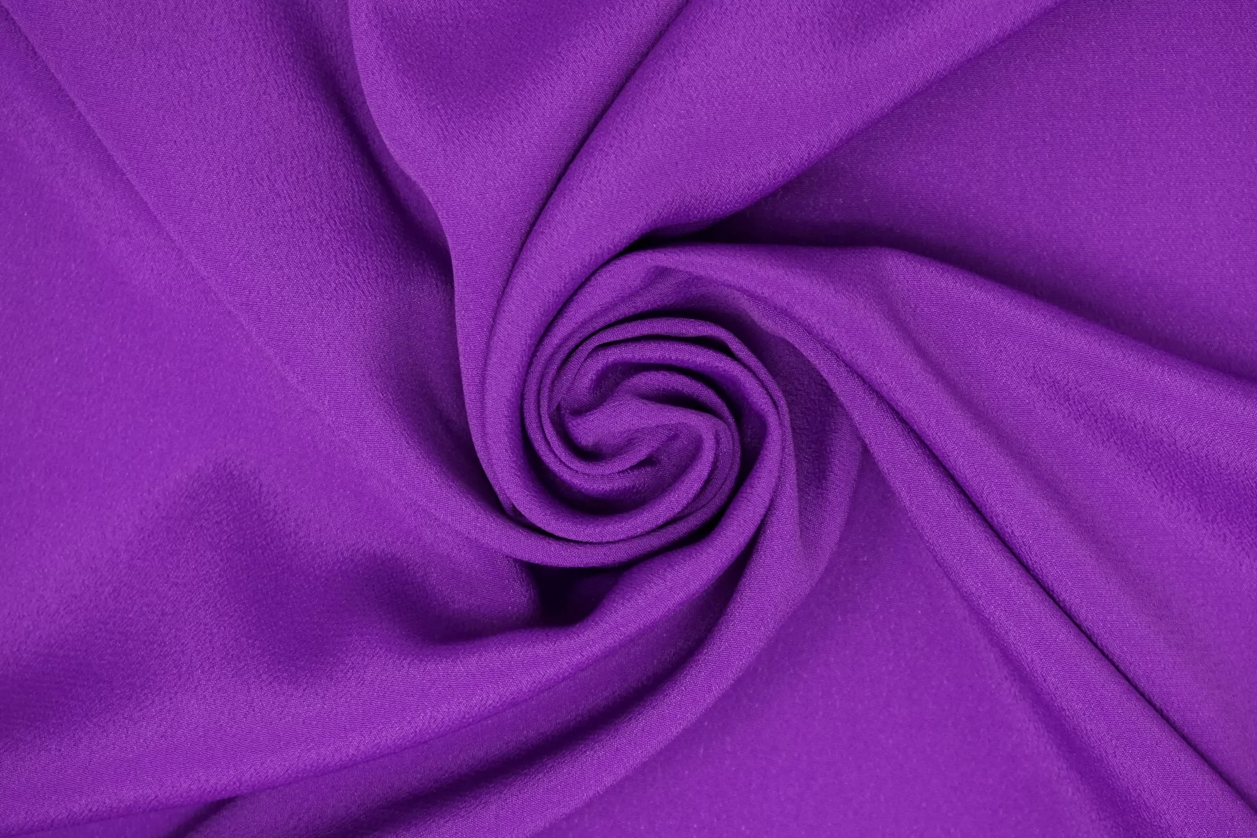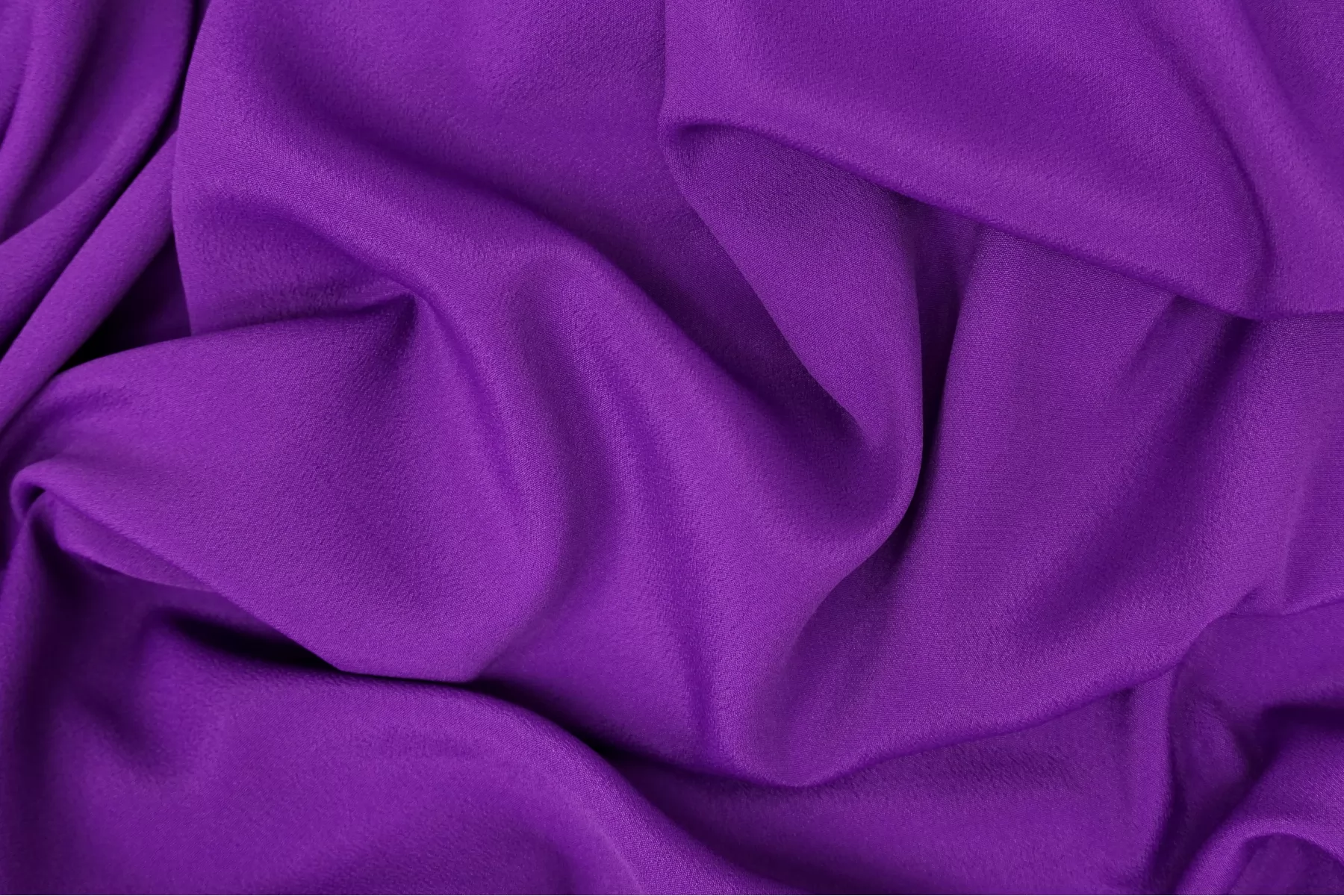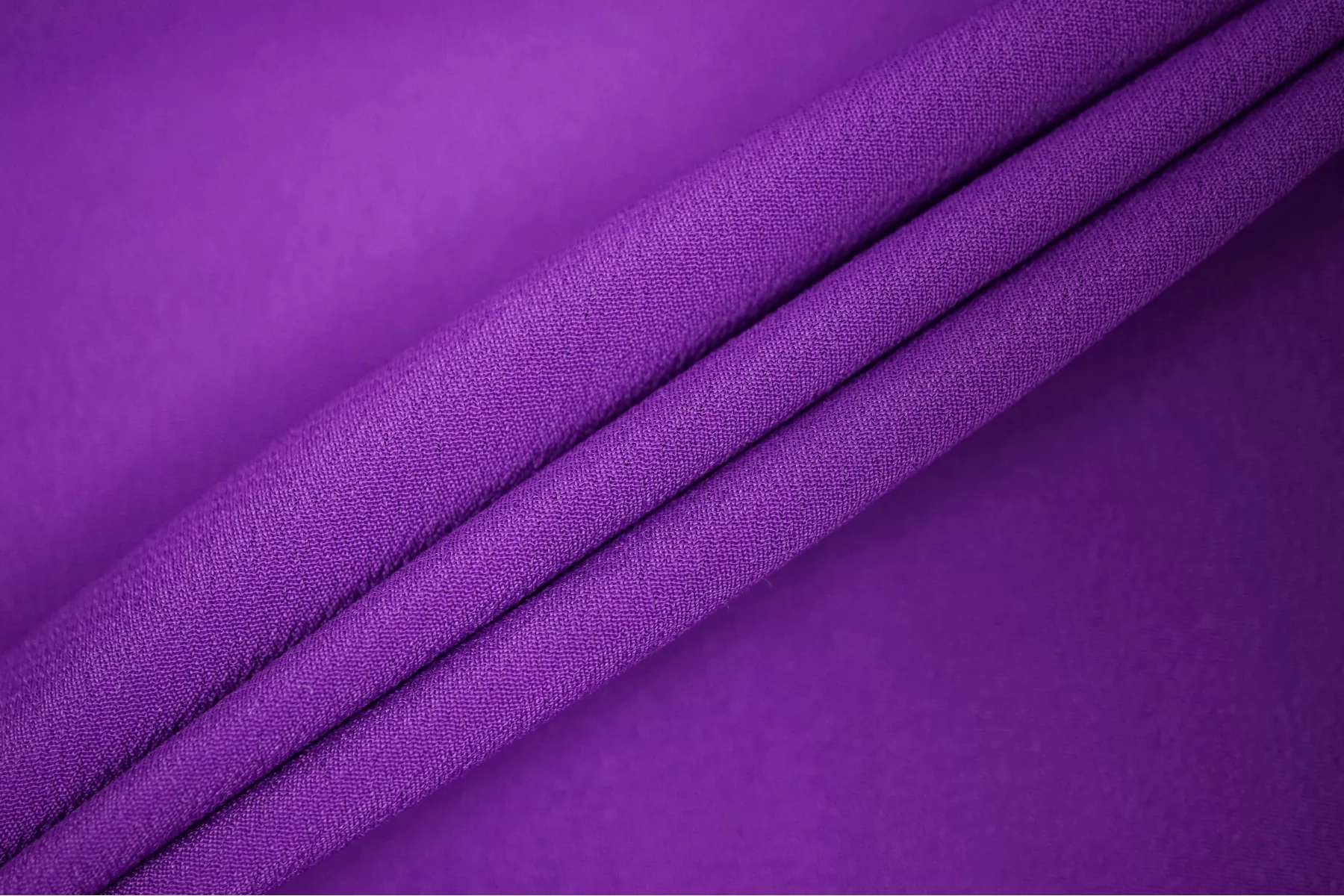 Крепдешин, плательно-блузочный по плотности, шелк с ацетатом фиолетового цвета. Тактильно слегка шероховатый, легкий и воздушный. Не тянется, но хорошо пружинит за счет плетения. Красив в своей пластике и в складках. Немного виднеется силуэт на просвет. Отлично подойдет на платья, юбки, туники и блузки. Уход - деликатный.