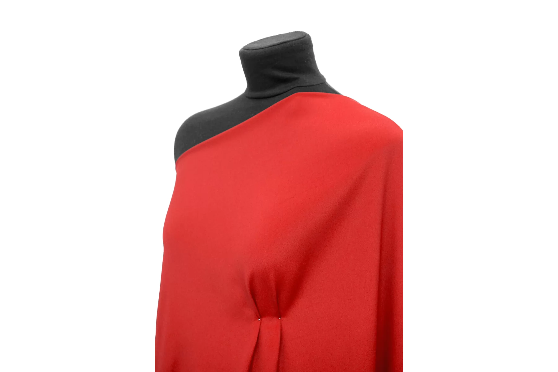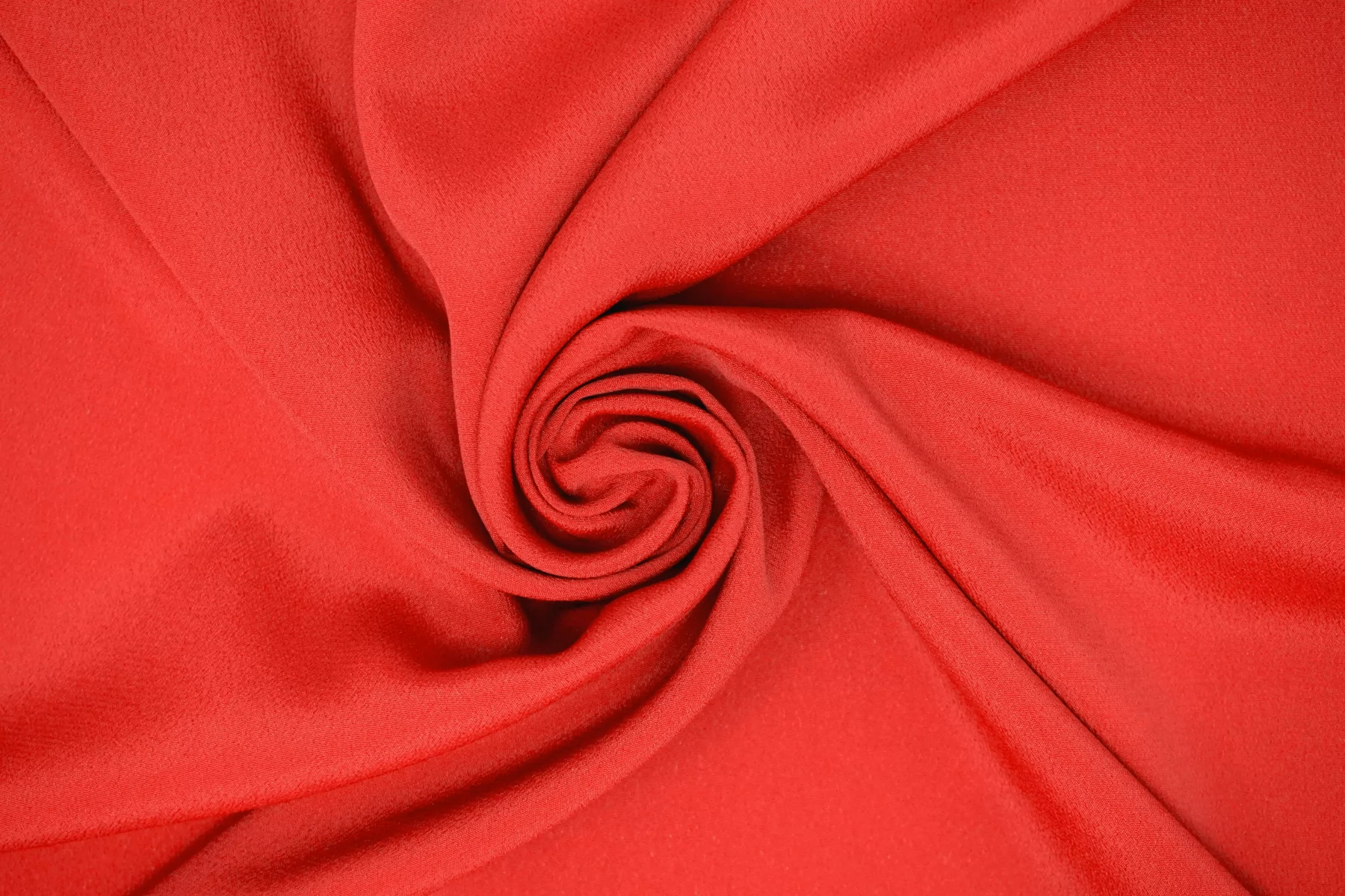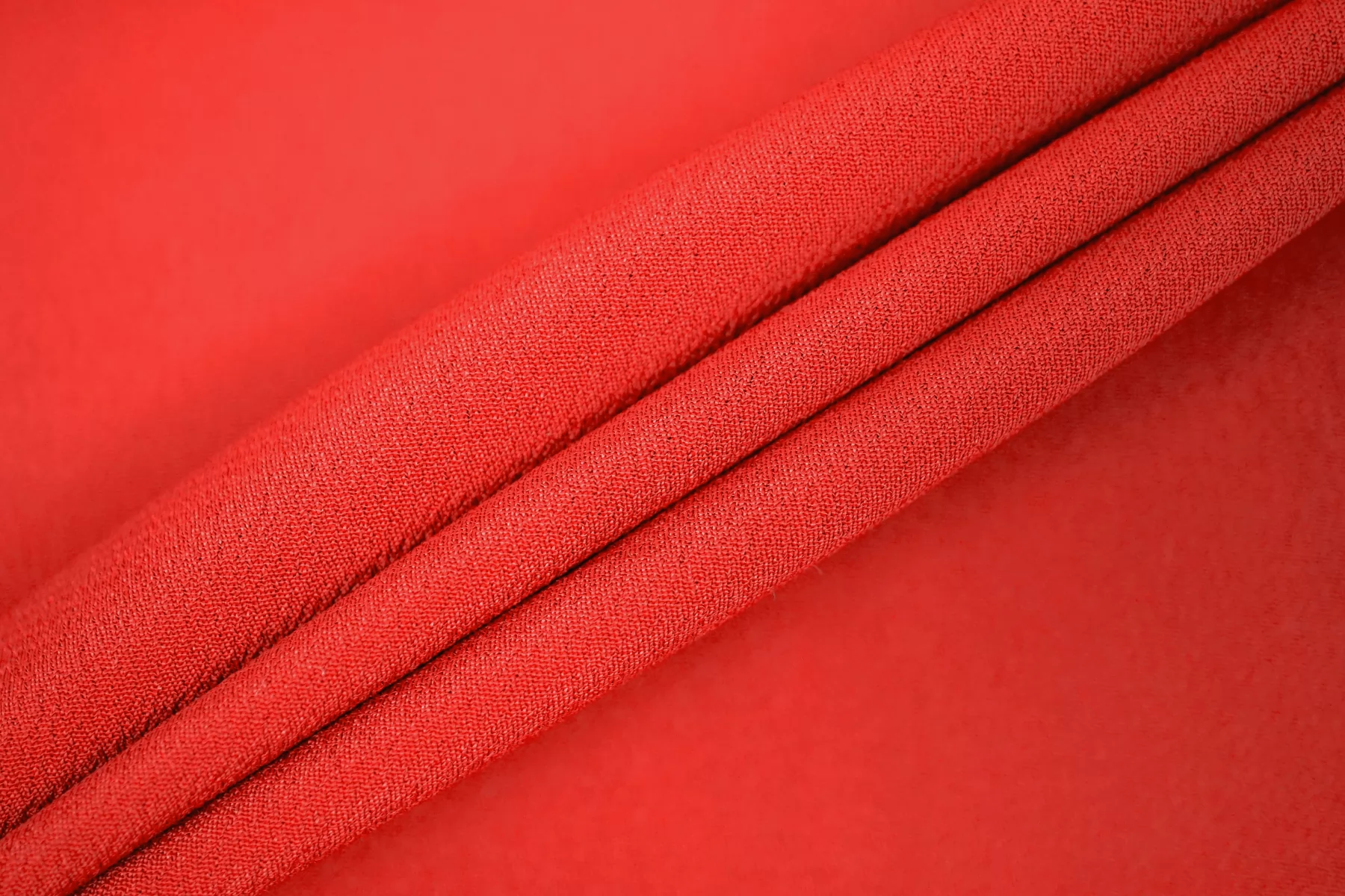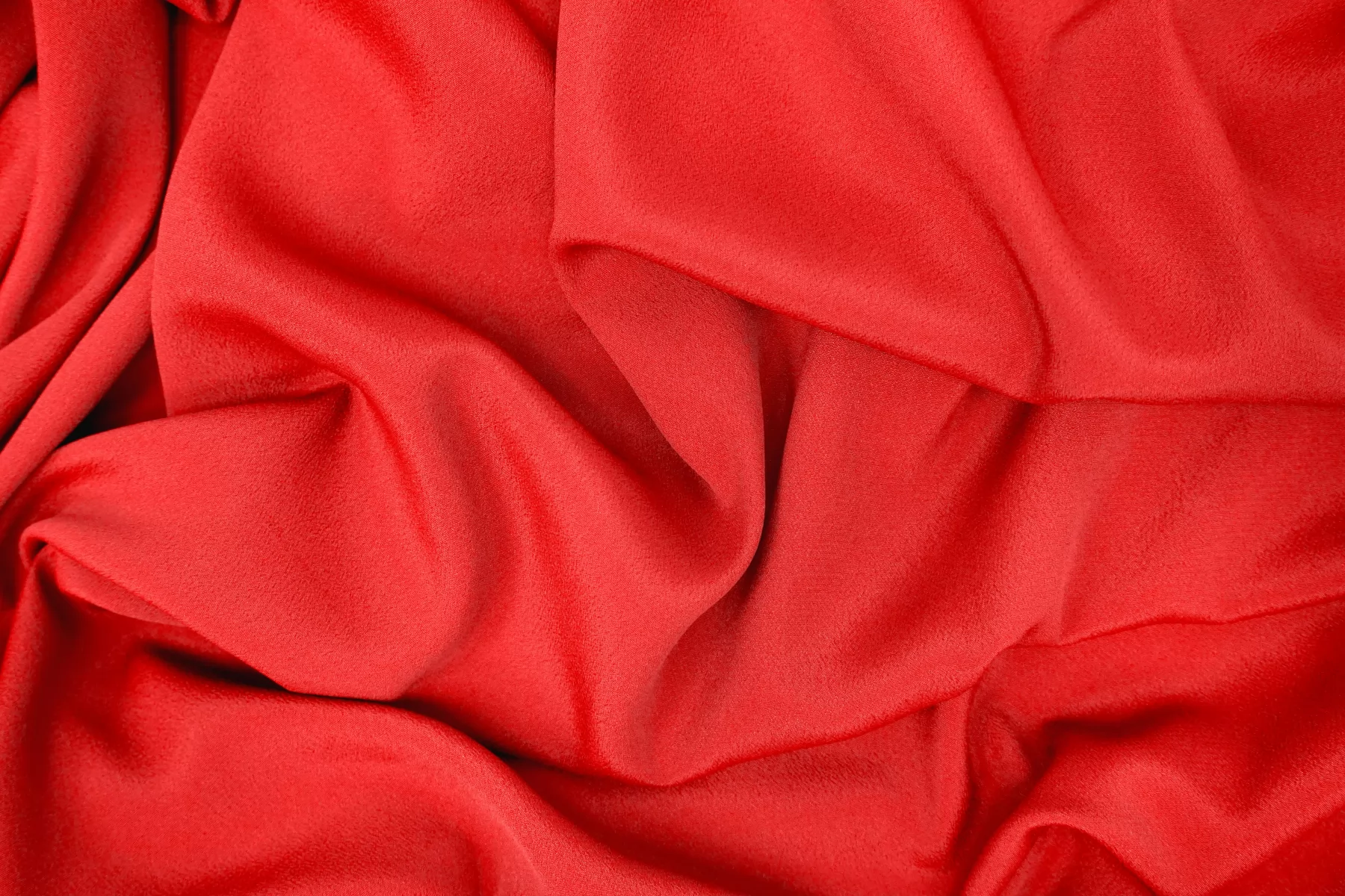 Крепдешин, плательно-блузочный по плотности, шелк с ацетатом красного цвета. Тактильно слегка шероховатый, легкий и воздушный. Не тянется, но хорошо пружинит за счет плетения. Красив в своей пластике и в складках. Немного виднеется силуэт на просвет. Отлично подойдет на платья, юбки, туники и блузки. Уход - деликатный.