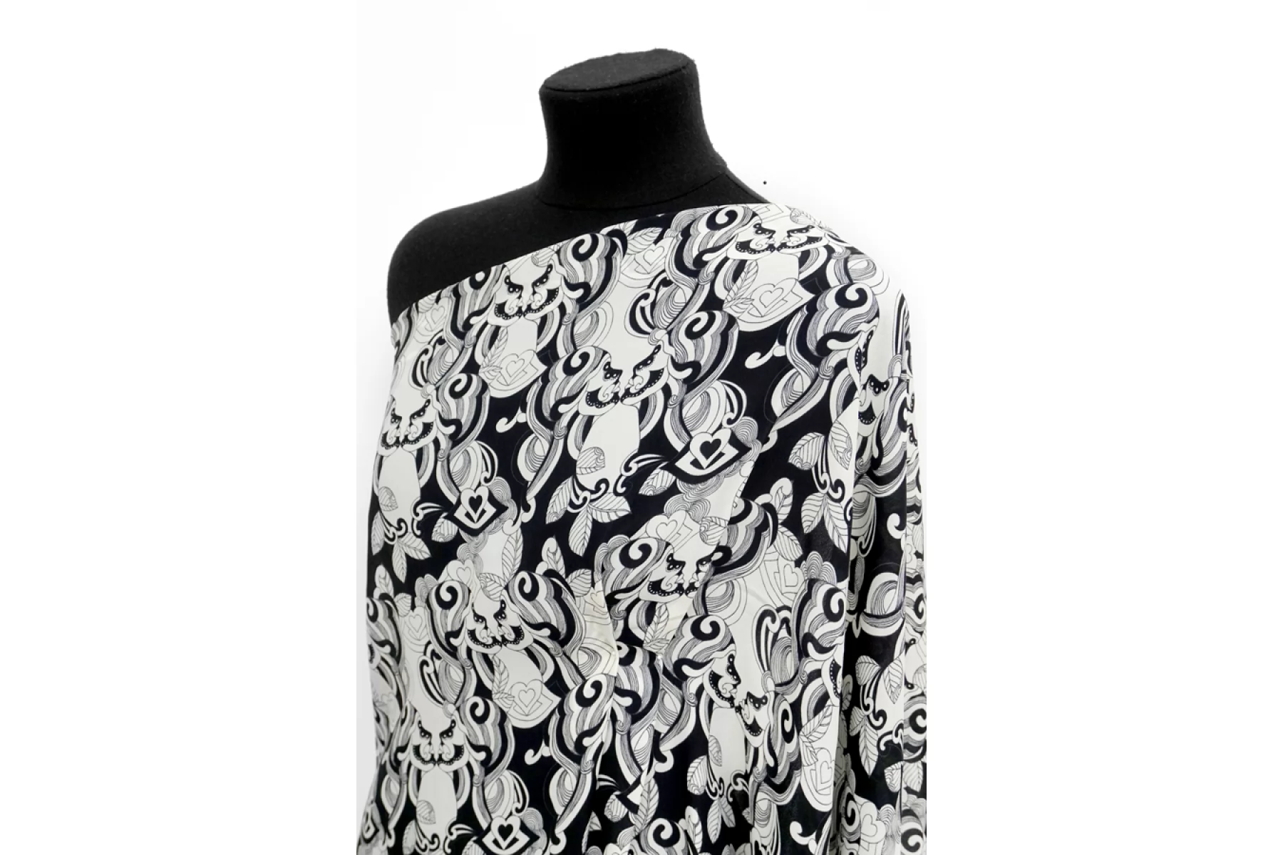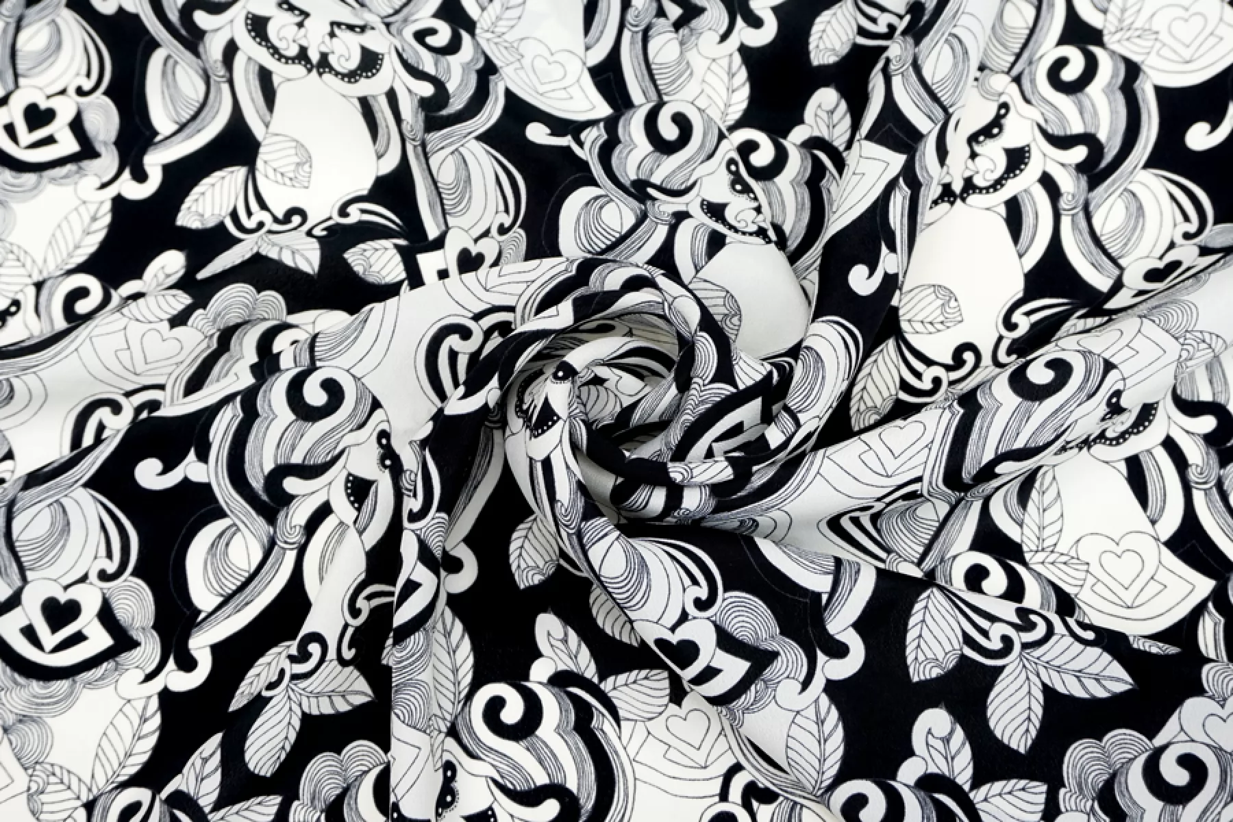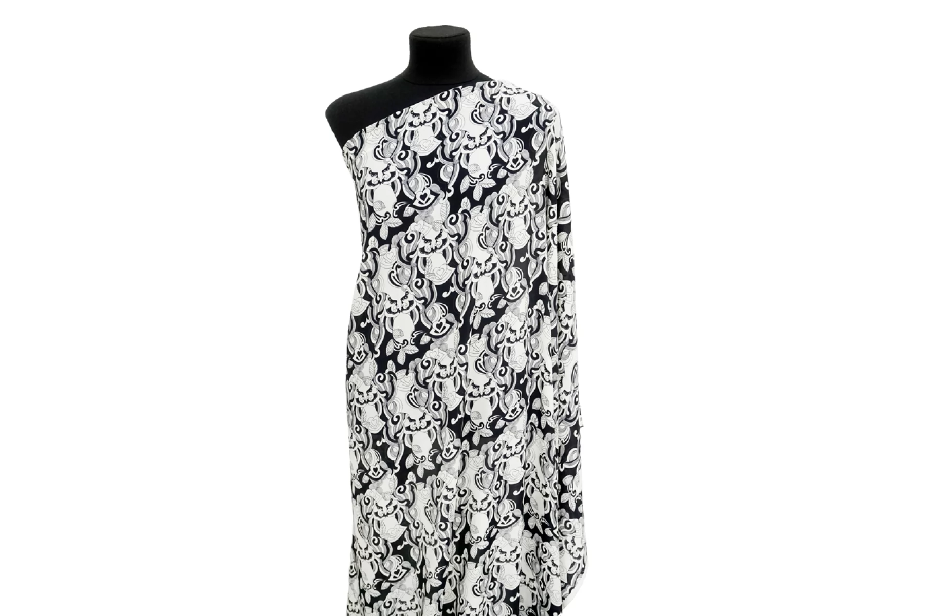 Очень интересная позиция - тонкий крепдешин из шелка с вискозой в молочно-черной цветовой палитре с необычным абстрактным принтом в виде лиц девушек, размером примерно 13х13 см, и других фигур. Материал тактильно слегка шероховатый, но очень мягкий и приятный. Струящийся и летящий. Немного просвечивает силуэт. Смотрится очень стильно и дорого! Шьем платья, юбки, туники и блузки. Для однослойных изделий при необходимости используем подкладочный материал. Уход - деликатный.