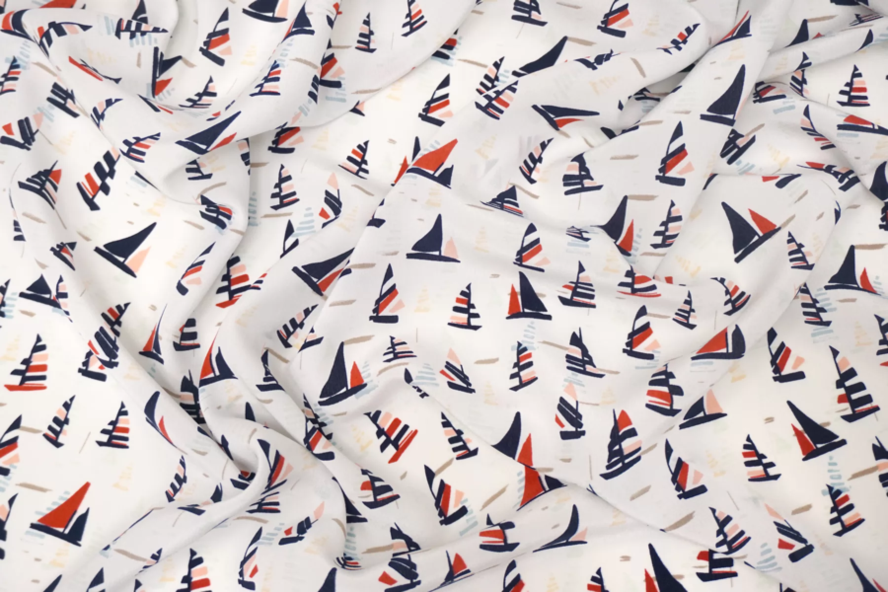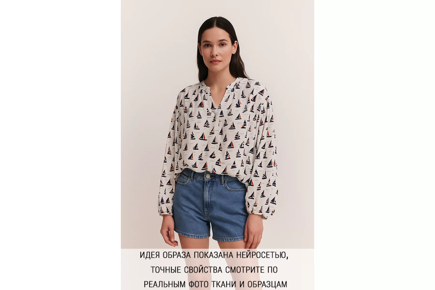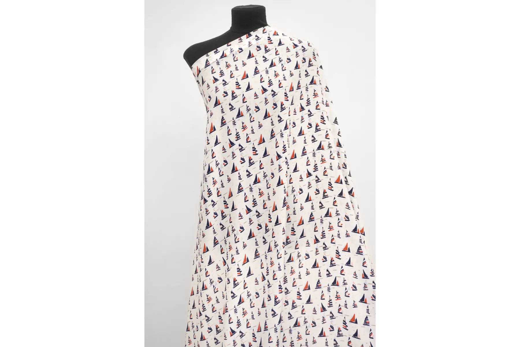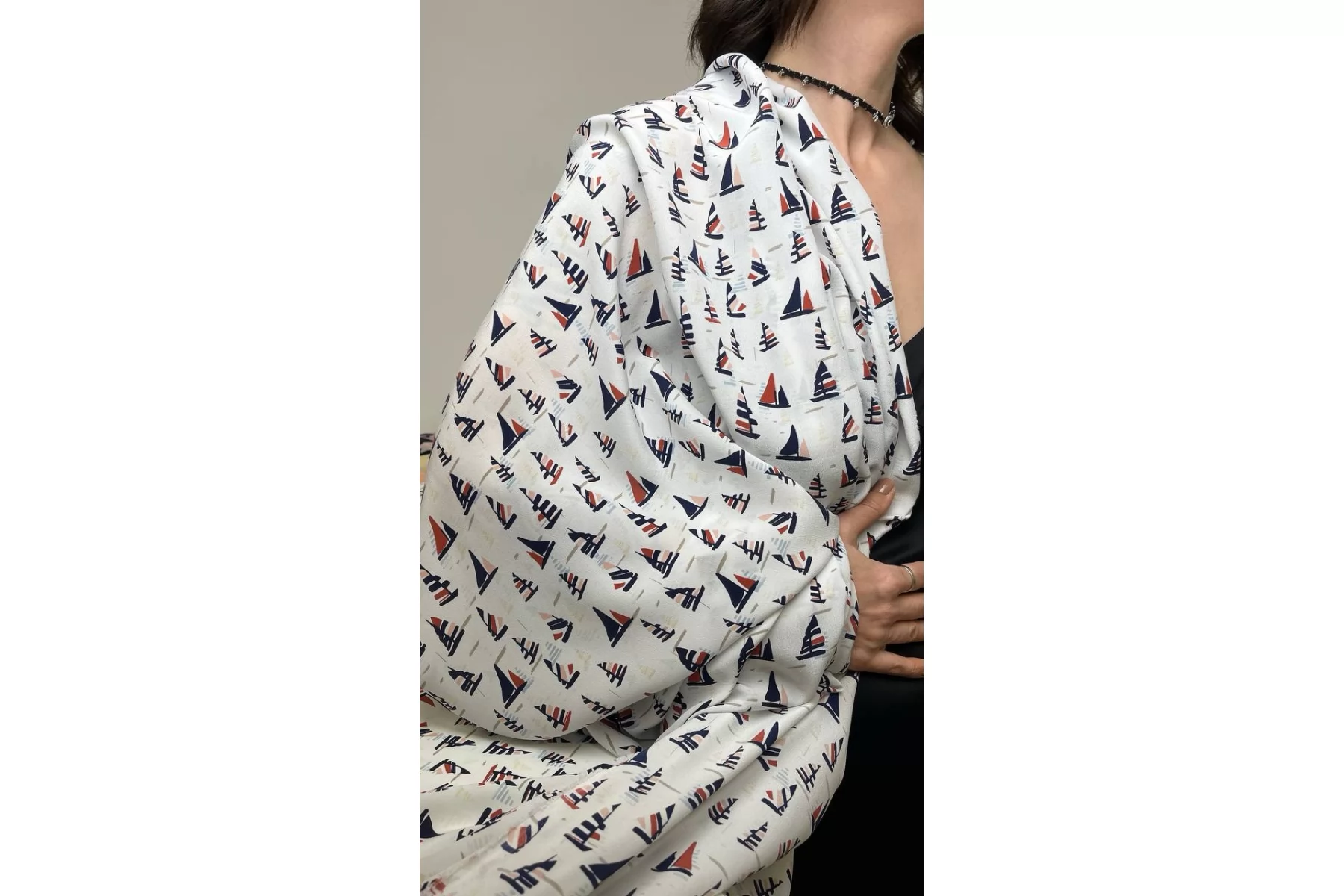 Крепдешин из вареного шелка от известного модного дома DOLCE & GABBANA бело-голубого оттенка с небольшими сине-красными корабликами. Материал тактильно очень мягкий и приятный на ощупь, напоминает вареный крепдешин. Достаточно плотный. Не тянется, но слегка пружинит за счет плетения. Красиво струится. Совсем немного просвечивает силуэт. Не мнется. Форму не держит, но красив в драпировке. Идеальный летний вариант на блузки и платья. При необходимости используйте подкладочный материал. Уход, как и за любым шелком, деликатный.