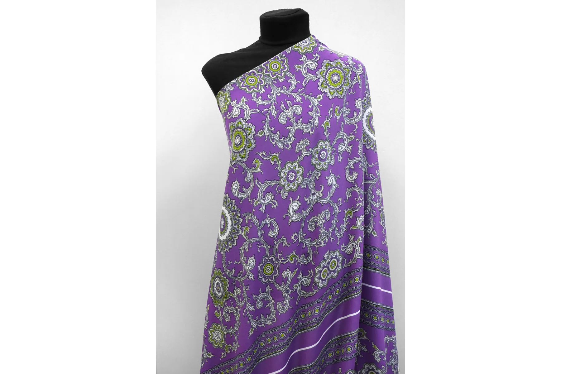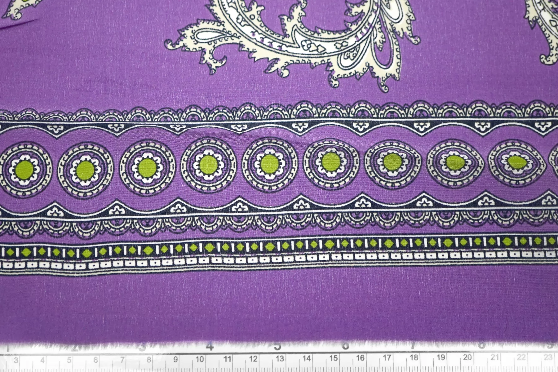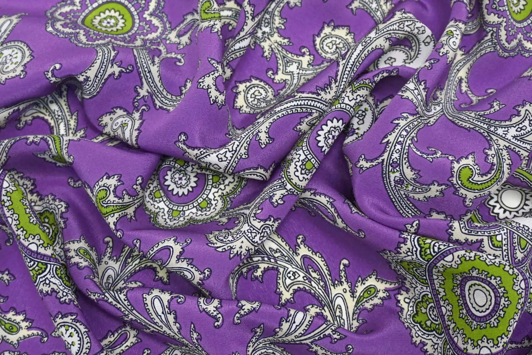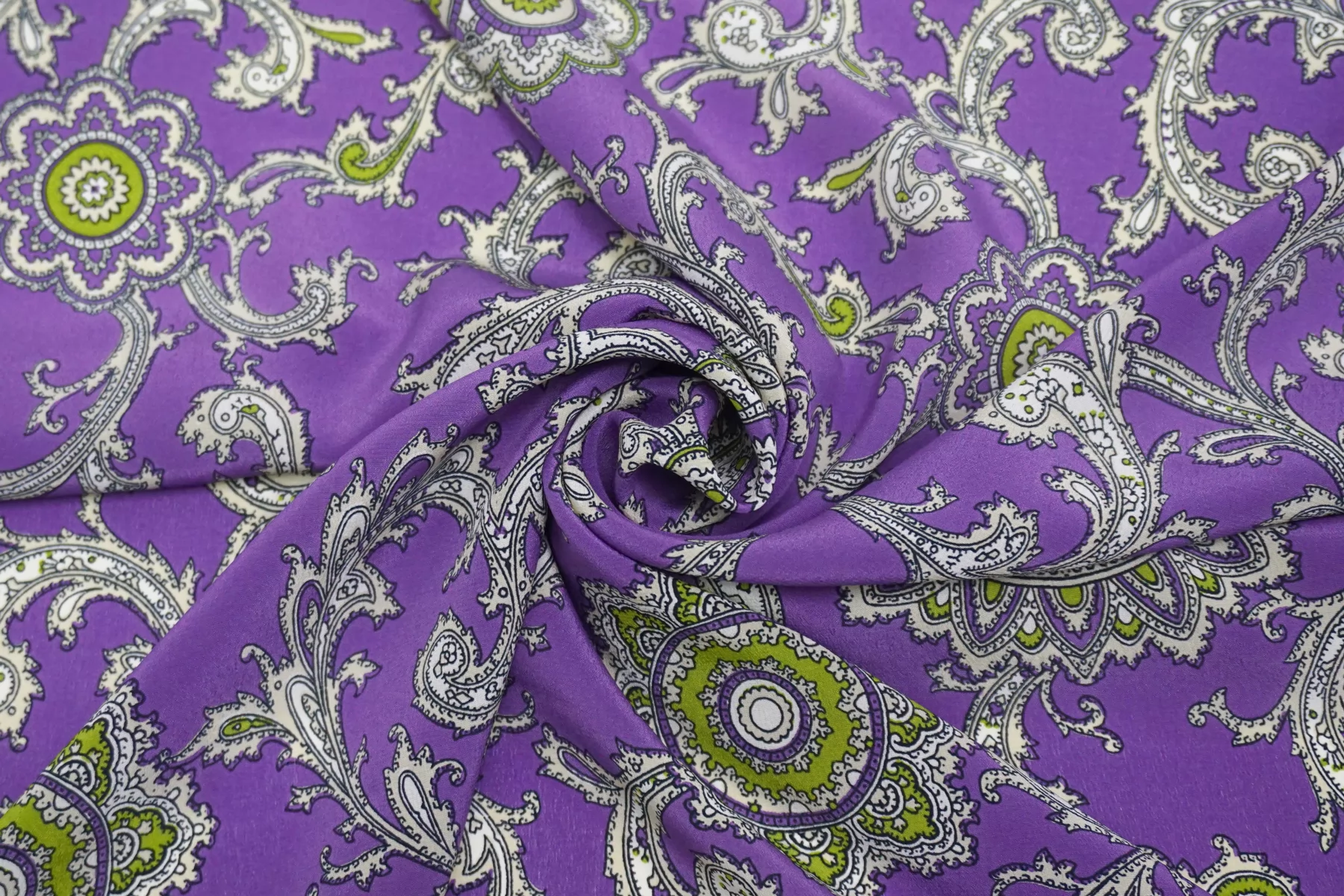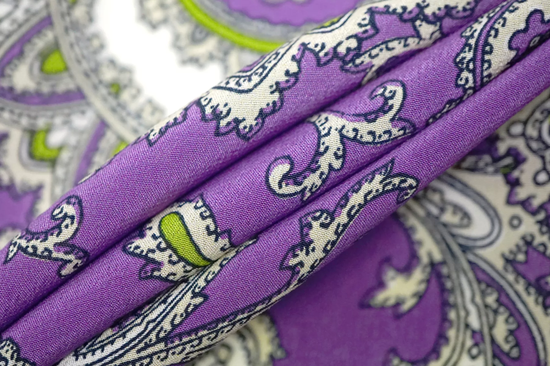 ВНИМАНИЕ! Ткань режется кратно купону, длина купона 80 см, цена за купон -3552 руб. Красивая позиция - шелковый крепдешин с платочным принтом на фиолетовом фоне. Тактильно очень мягкий, приятный, легкий, летящий и пластичный. Немного просвечивает. Не тянется, но пружинит за счет плетения. Практически не мнется. Красив в складках. Форму не держит. Шьем блузки, платья, юбки и не только. При необходимости используйте подкладочный материал. Уход за шелком деликатный.
