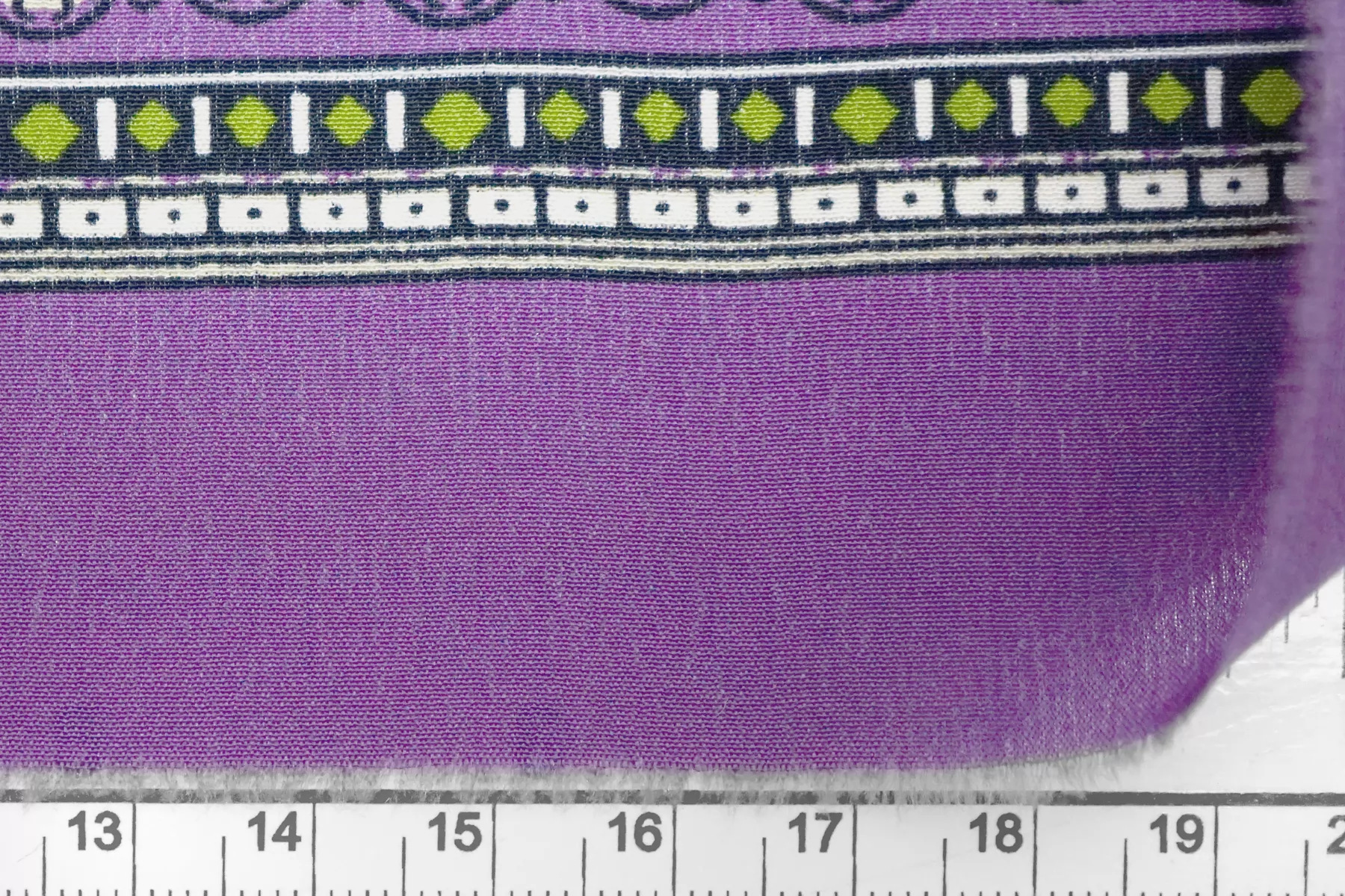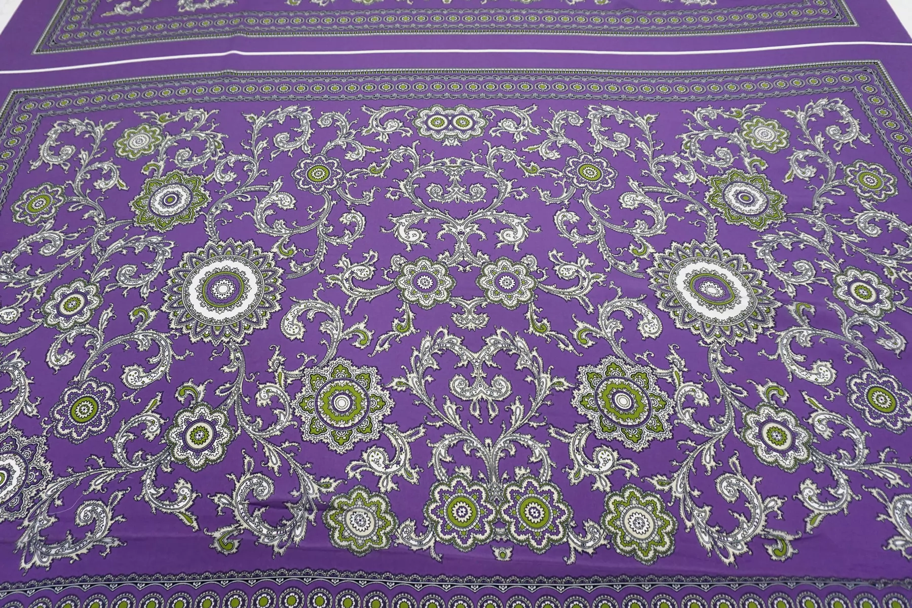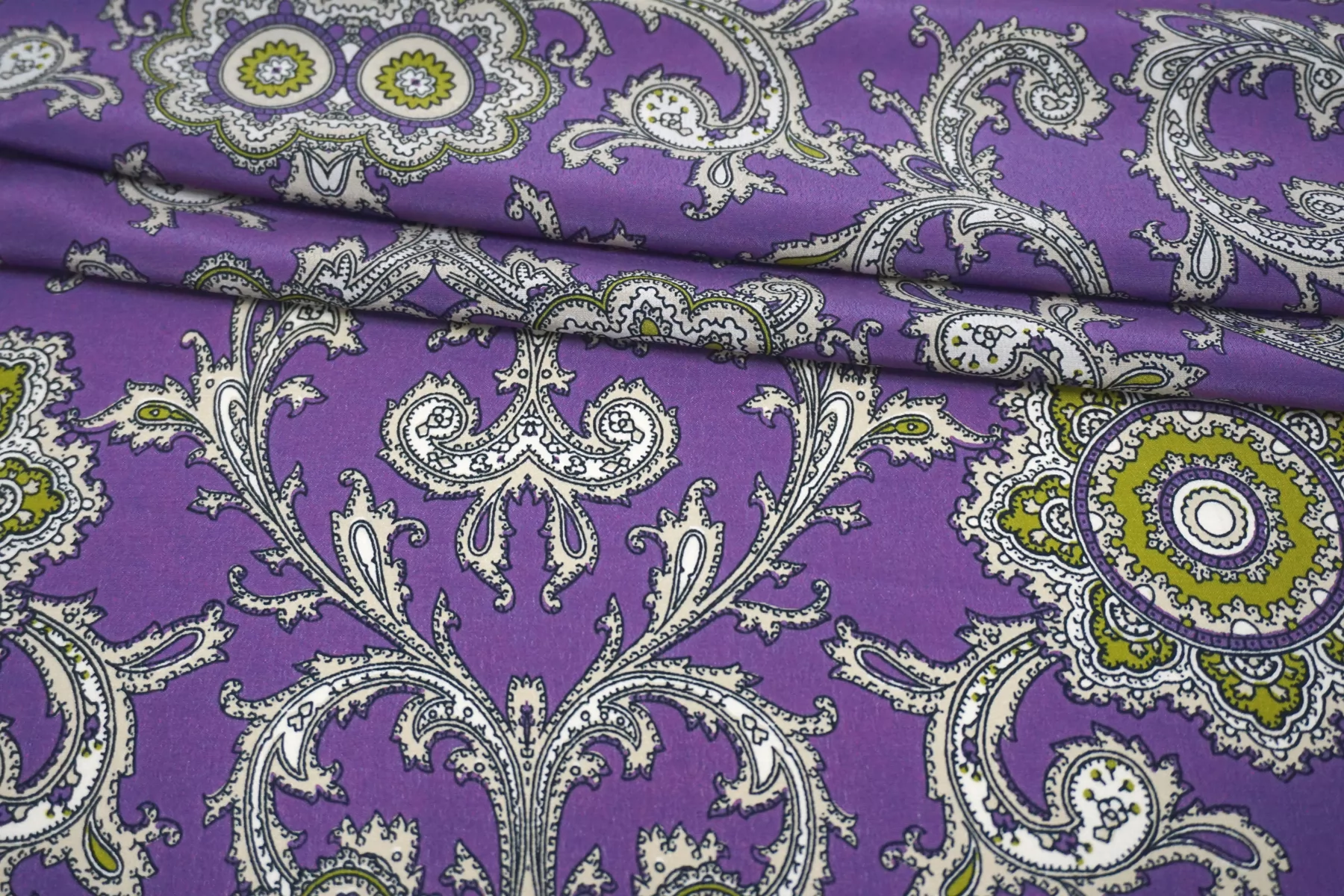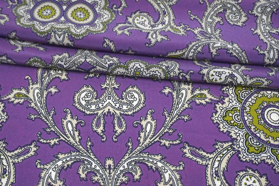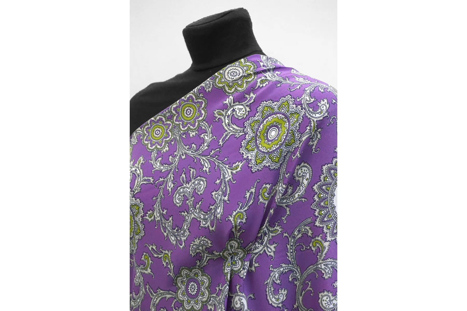 ВНИМАНИЕ! Ткань режется кратно купону, длина купона 80 см, цена за купон -3552 руб. Красивая позиция - шелковый крепдешин с платочным принтом на фиолетовом фоне. Тактильно очень мягкий, приятный, легкий, летящий и пластичный. Немного просвечивает. Не тянется, но пружинит за счет плетения. Практически не мнется. Красив в складках. Форму не держит. Шьем блузки, платья, юбки и не только. При необходимости используйте подкладочный материал. Уход за шелком деликатный.