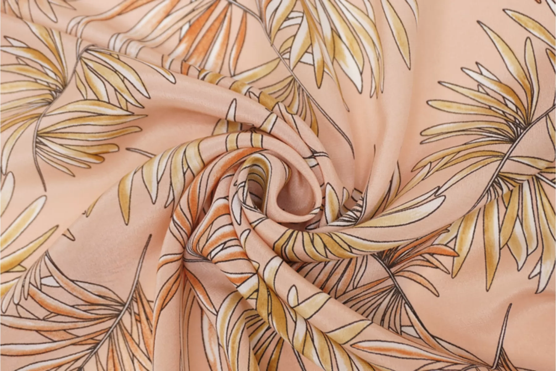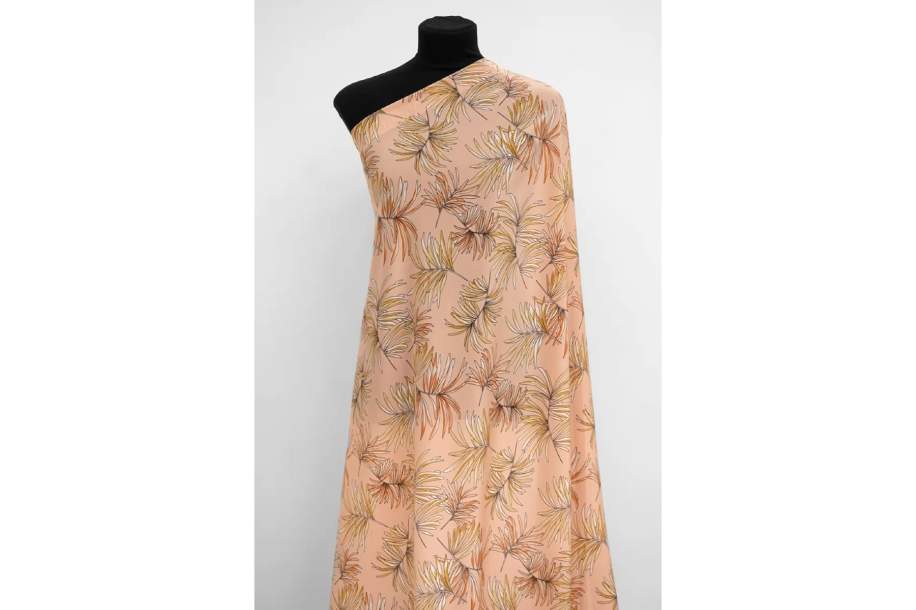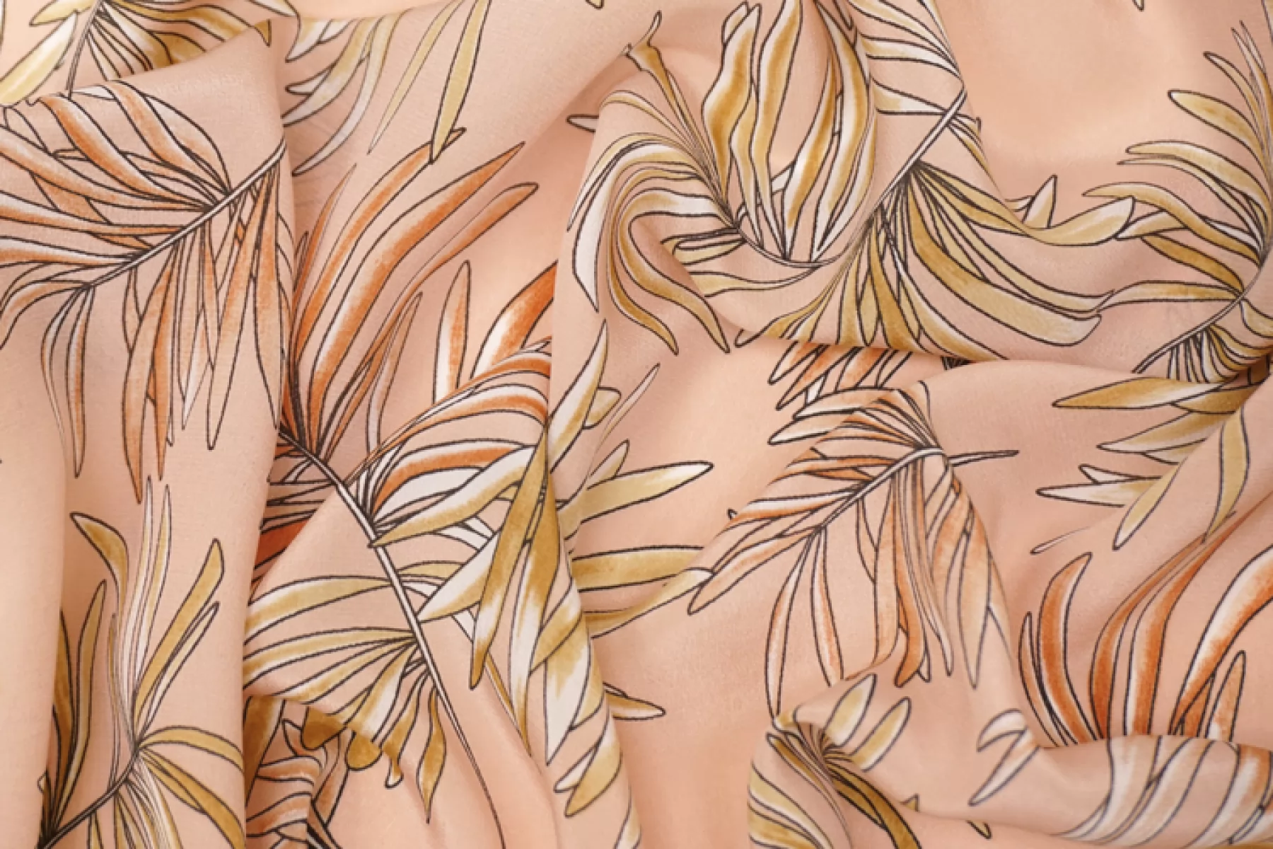 Шелковый крепдешин с принтом в виде листьев бледно-оранжевого и бледно-желтого оттенка на нежном персиковом фоне. Поверхность материала слегка шероховатая, как у крепдешина, но тем не менее скользящая. С очень красивым приятным блеском. Мягкий, приятный, легкий и летящий. Не тянется, но слегка пружинит за счет плетения. Струится. Просвечивает силуэт на просвет. Практически не мнется. Форму не держит, но красив в драпировке.Отличный вариант на платья, блузки и юбки. При необходимости используйте подкладочный материал. Уход, как и за любым шелком, деликатный.