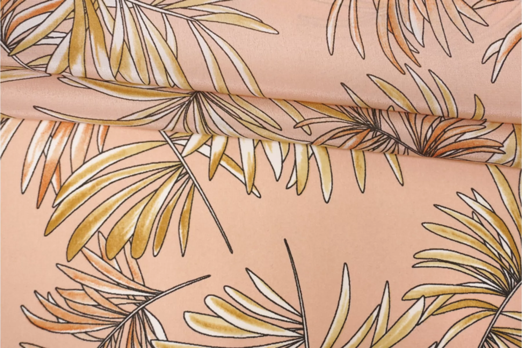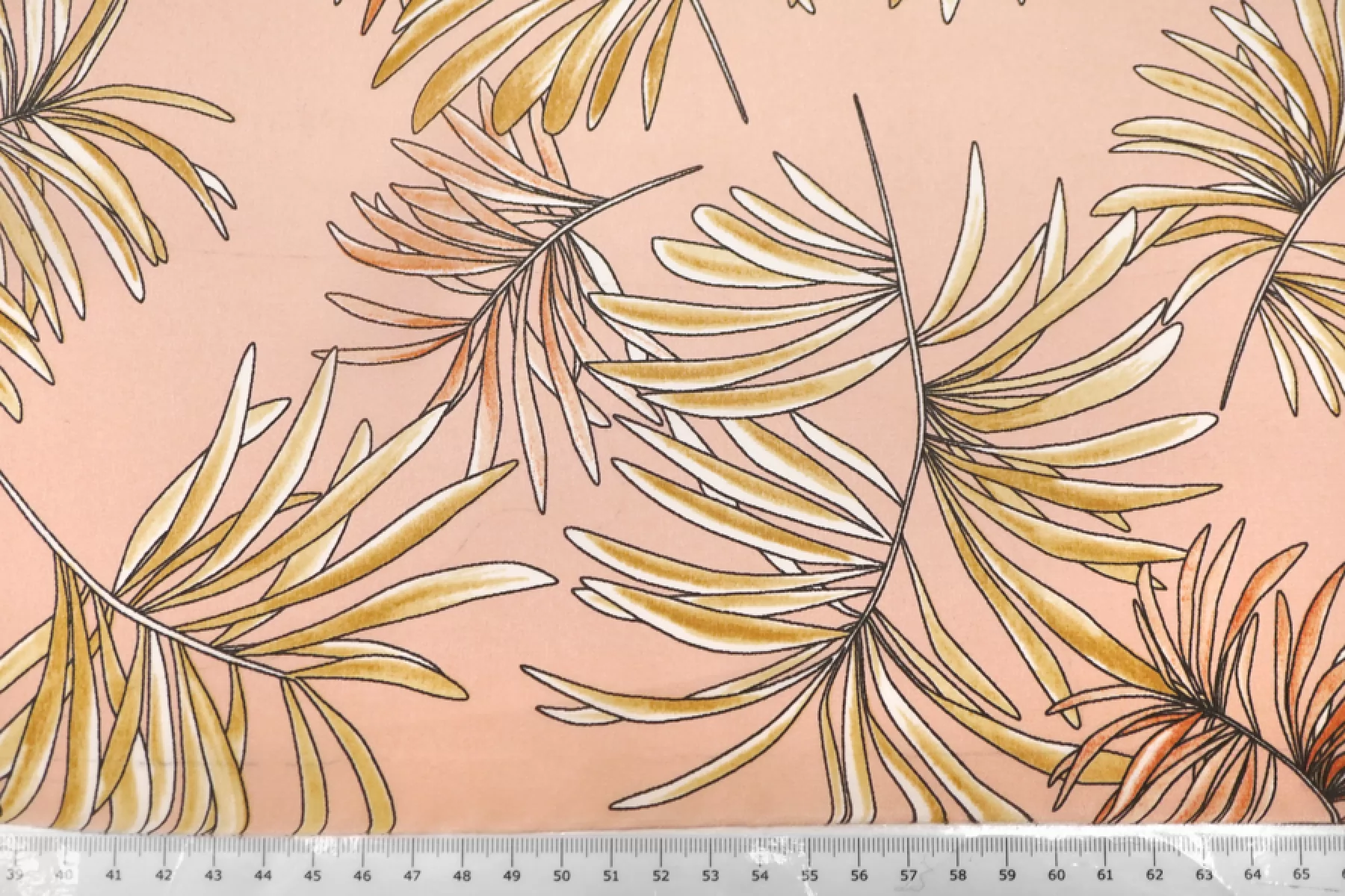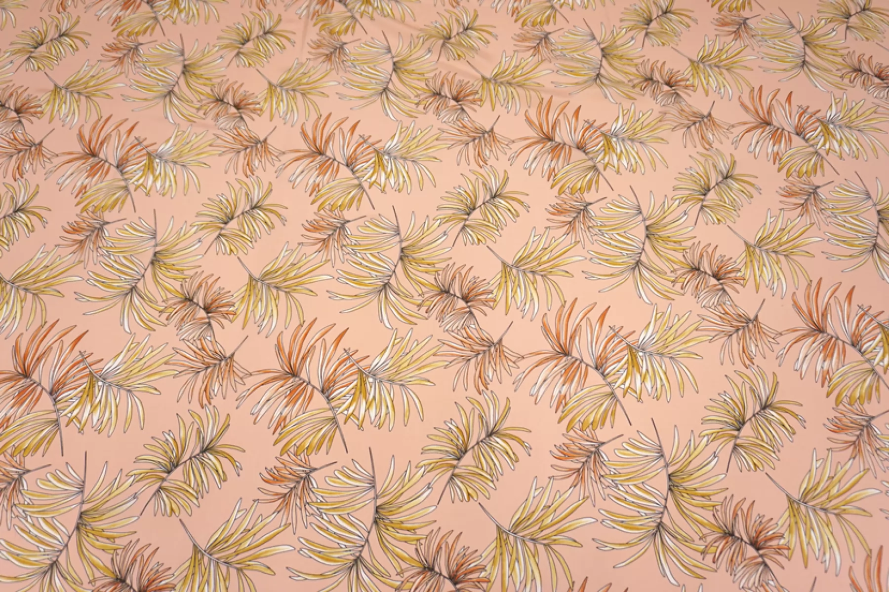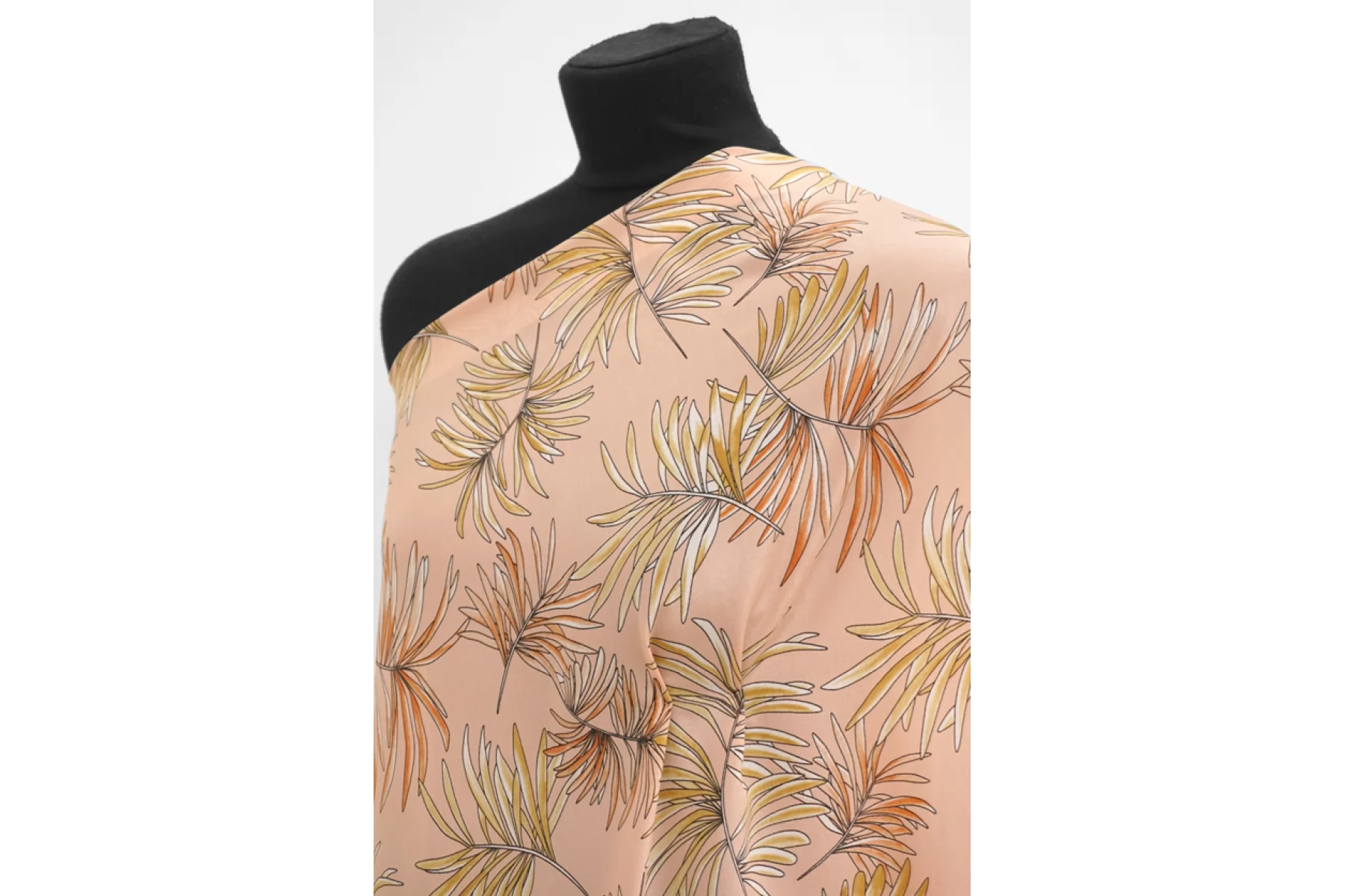 Шелковый крепдешин с принтом в виде листьев бледно-оранжевого и бледно-желтого оттенка на нежном персиковом фоне. Поверхность материала слегка шероховатая, как у крепдешина, но тем не менее скользящая. С очень красивым приятным блеском. Мягкий, приятный, легкий и летящий. Не тянется, но слегка пружинит за счет плетения. Струится. Просвечивает силуэт на просвет. Практически не мнется. Форму не держит, но красив в драпировке.Отличный вариант на платья, блузки и юбки. При необходимости используйте подкладочный материал. Уход, как и за любым шелком, деликатный.