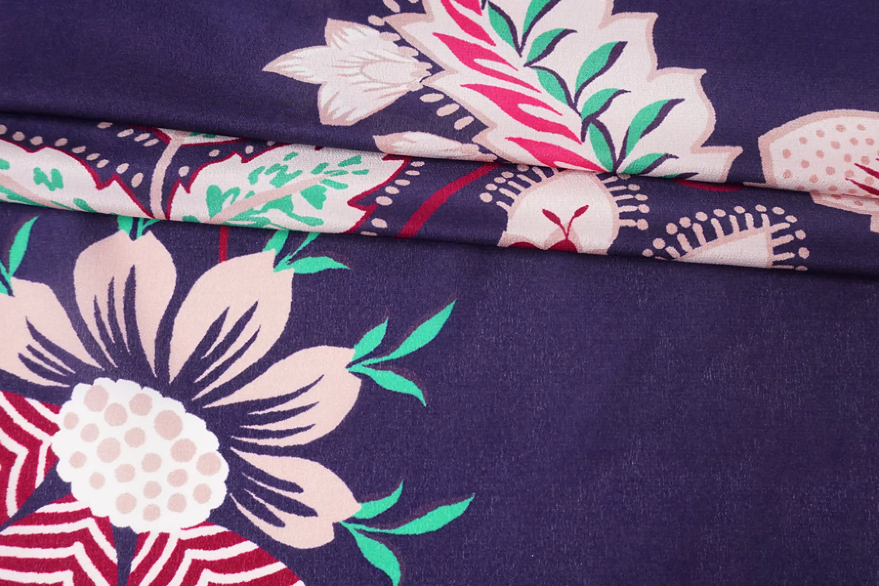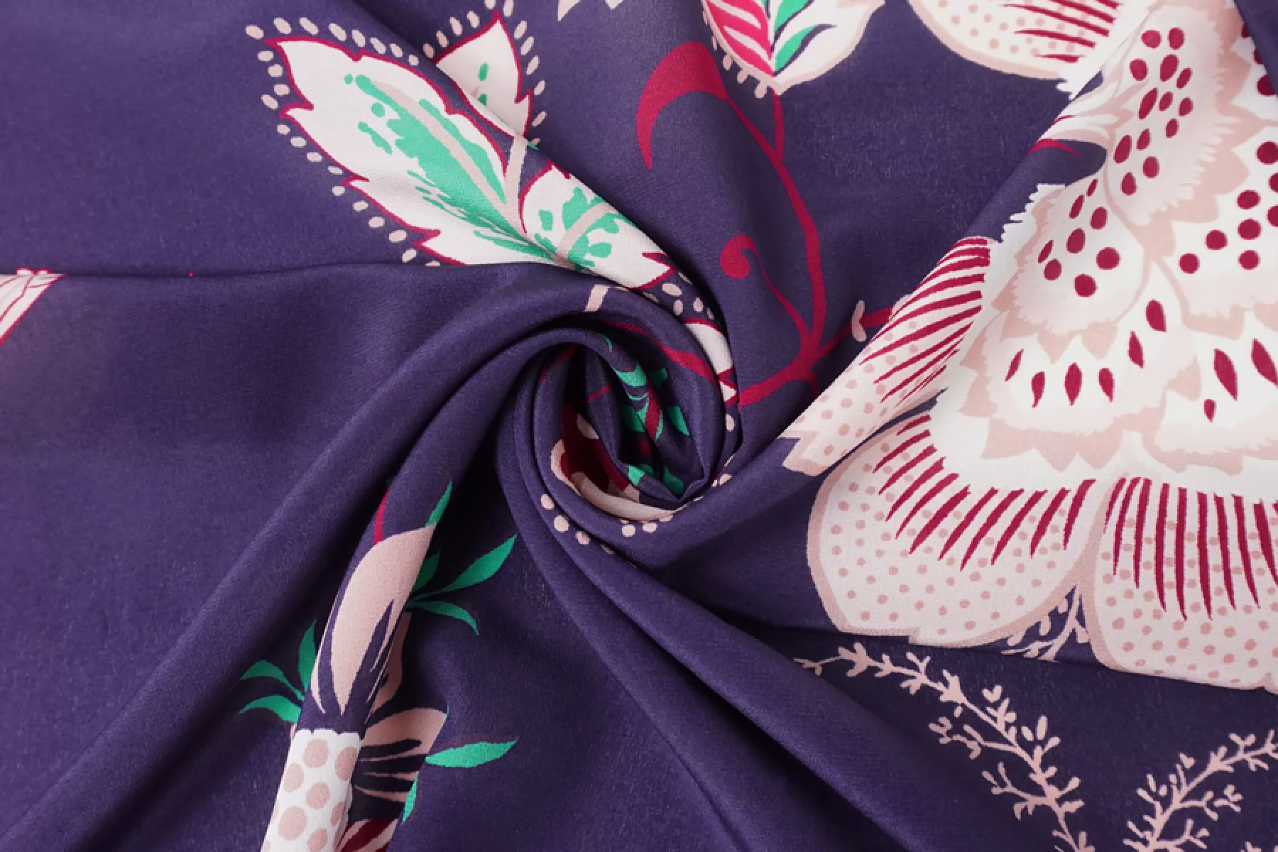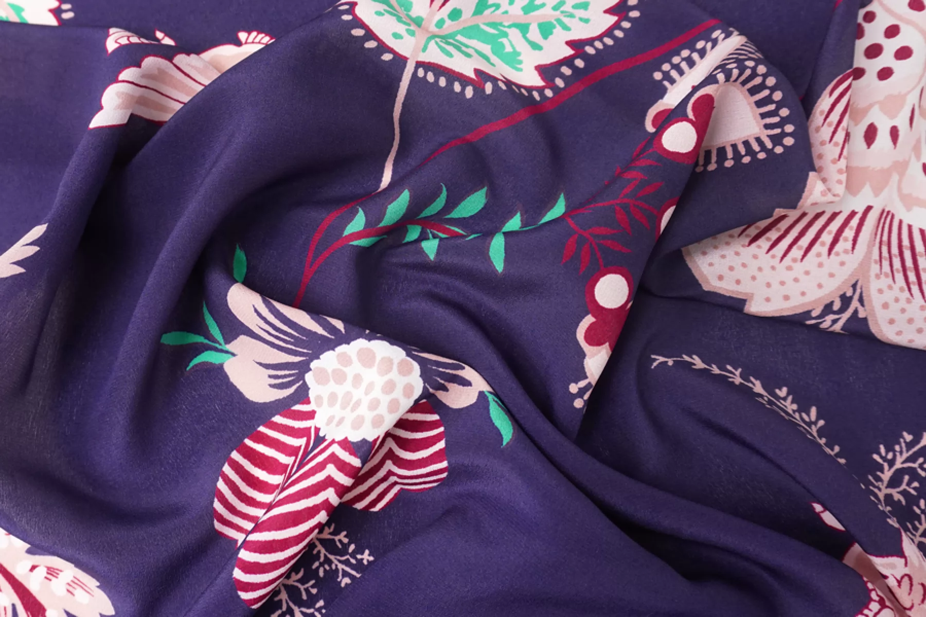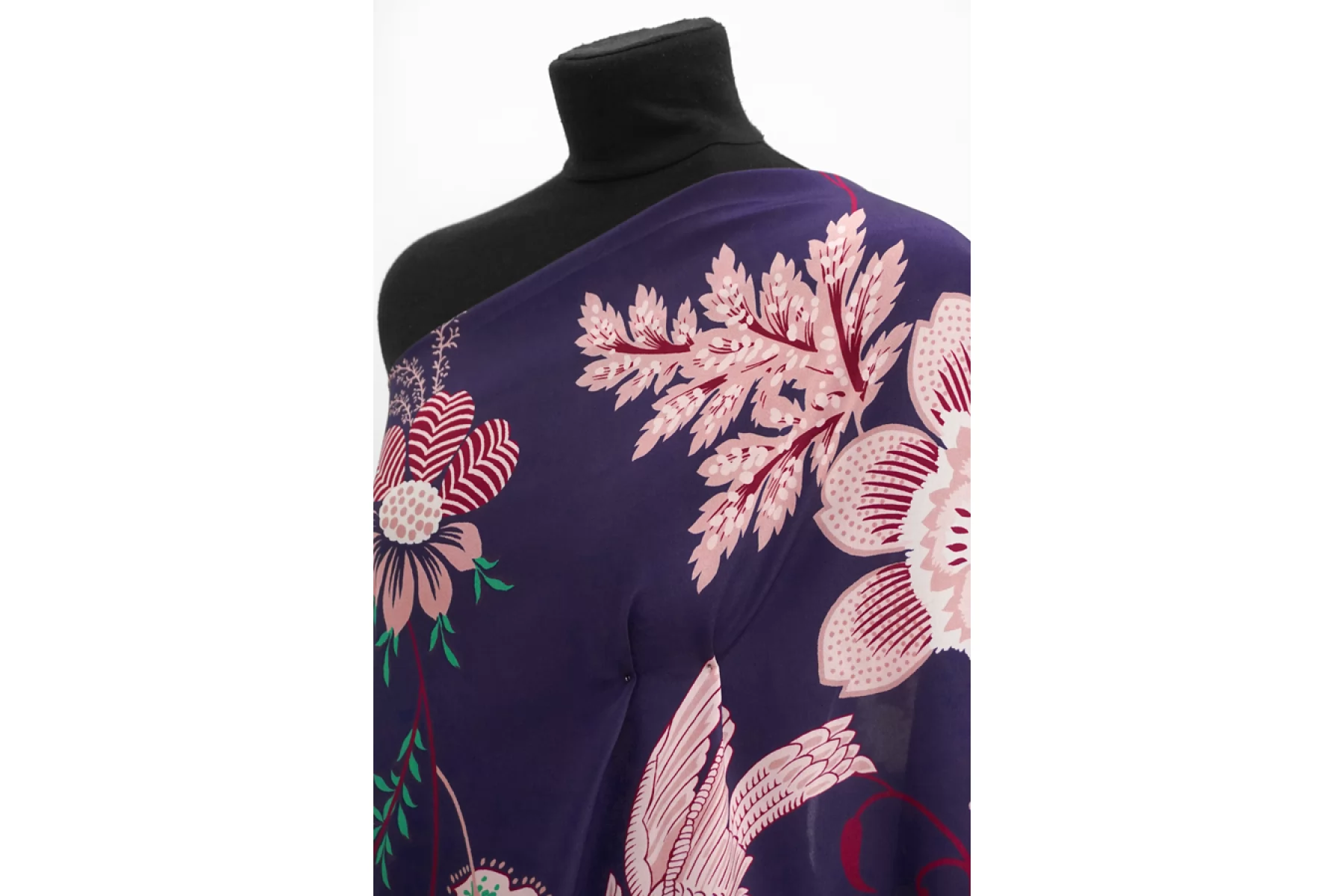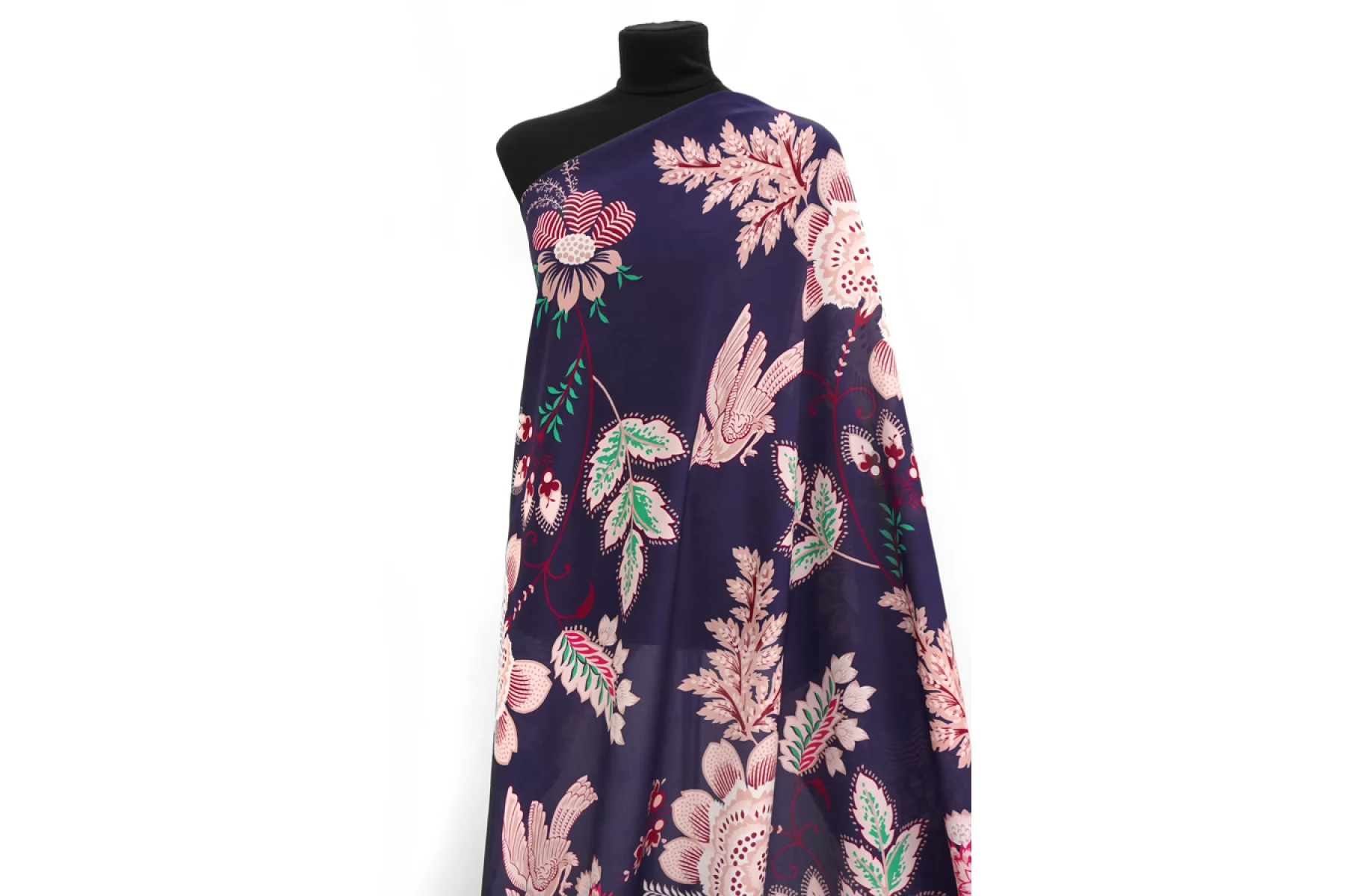 Крепдешин шелковый от MAX MARA темного сине-сиреневого оттенка с достаточно крупным принтом птиц и цветов в оттенках молочного, бледного пудрово-розового и винного. Мягкий, приятный, тонкий, легкий и струящийся. Пластичный. Просвечивает тень силуэта. Не тянется, но слегка пружинит за счет плетения. Не мнется. Красив в складках. Красивый вариант на платья, блузки, юбки и другие варианты. При необходимости используйте подкладочный материал.