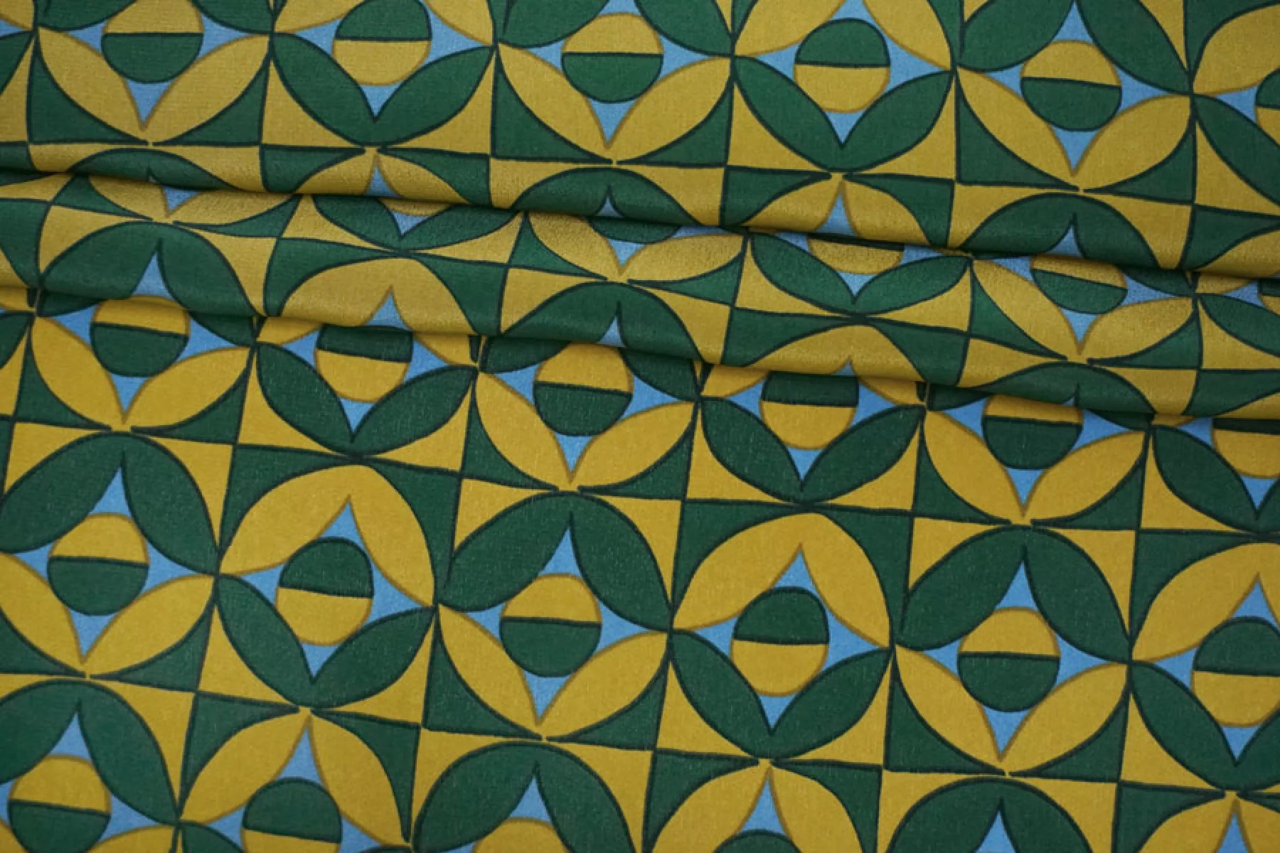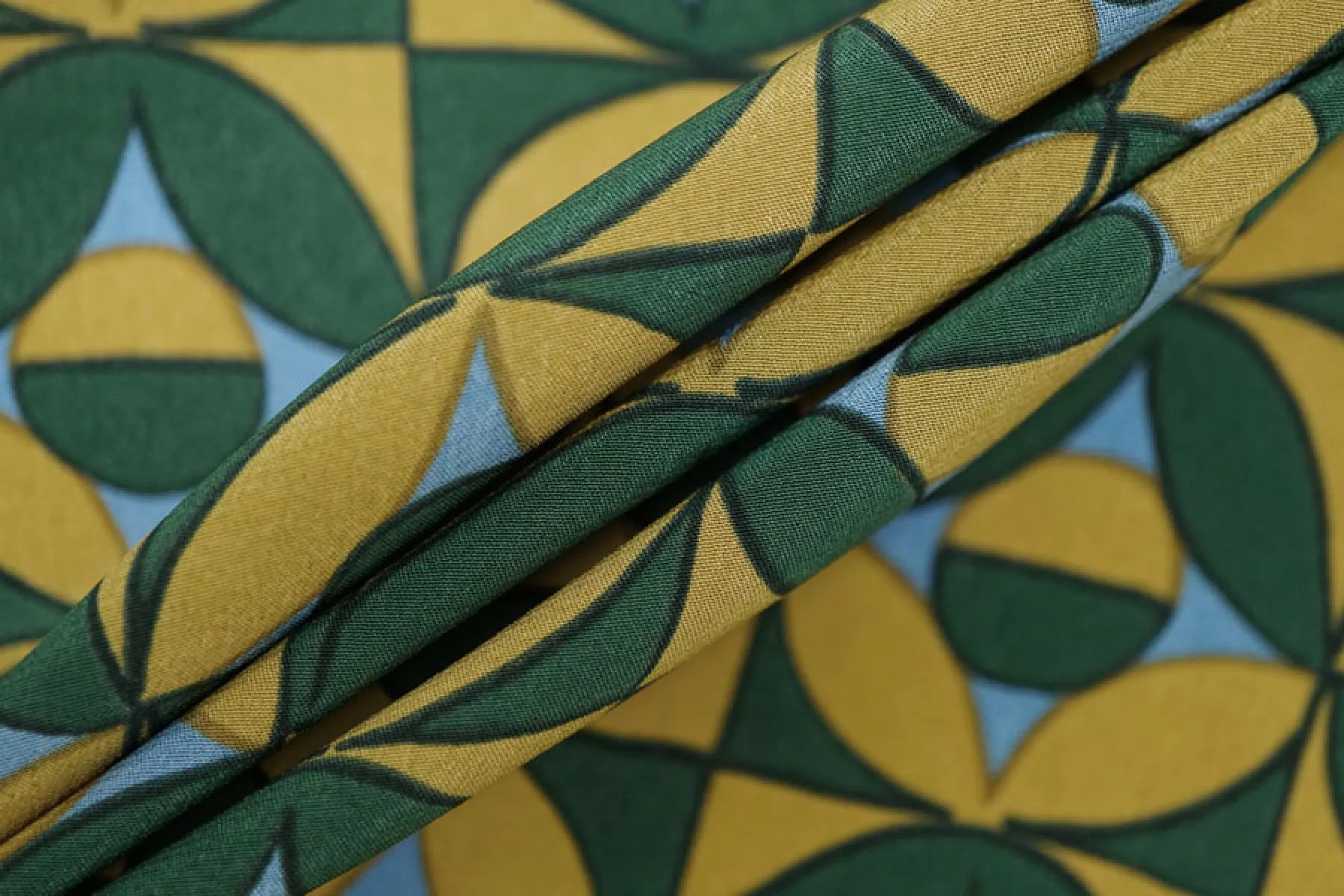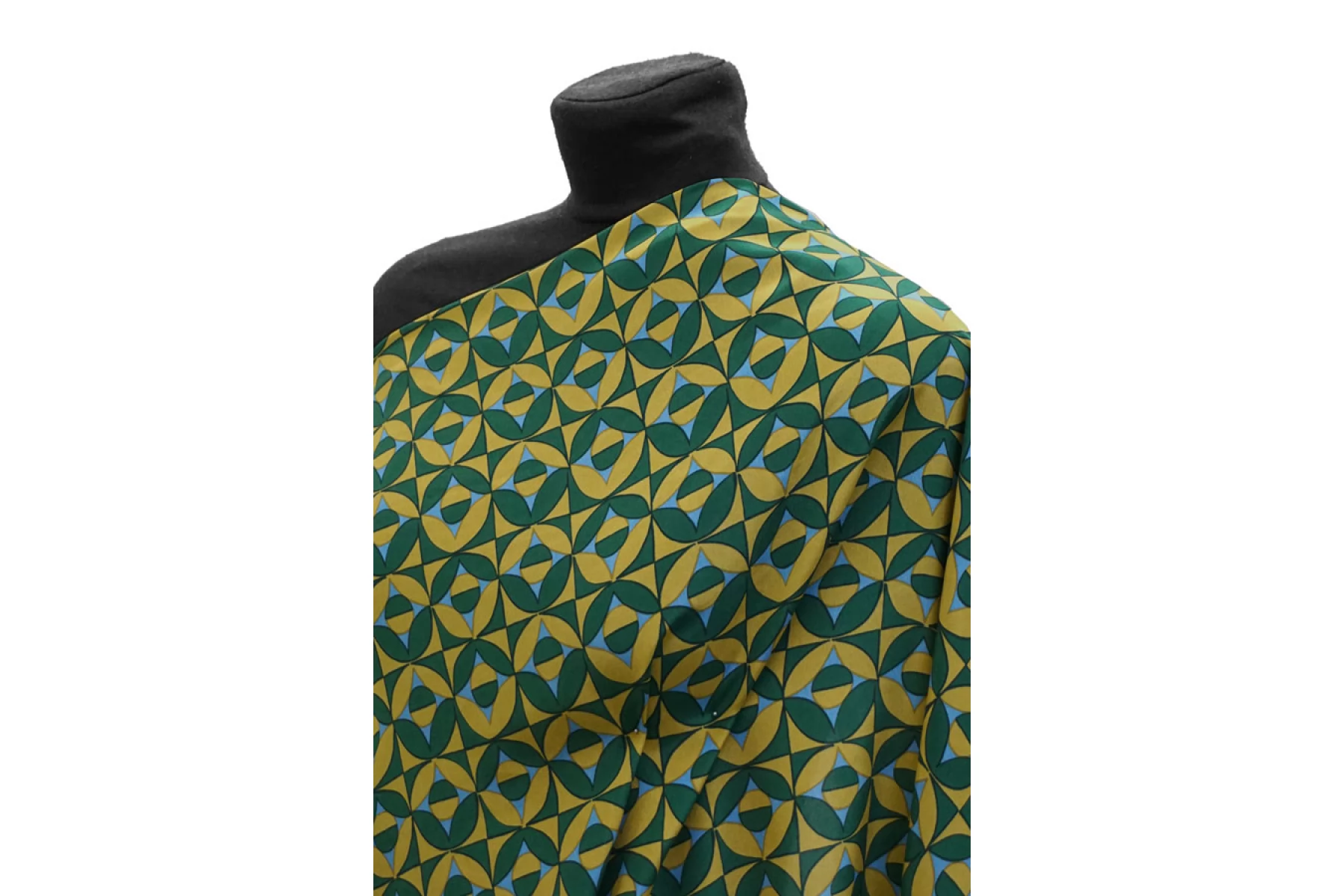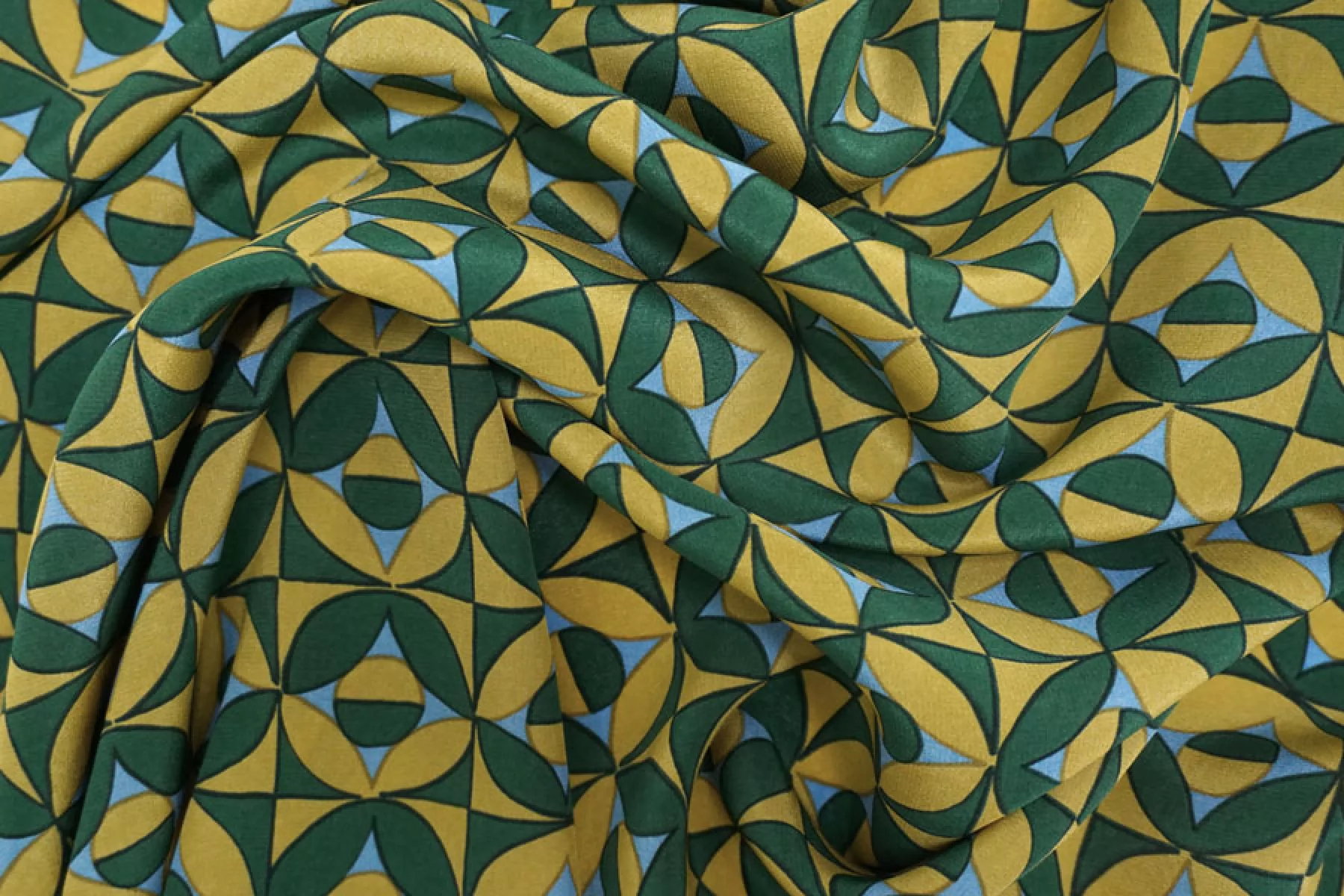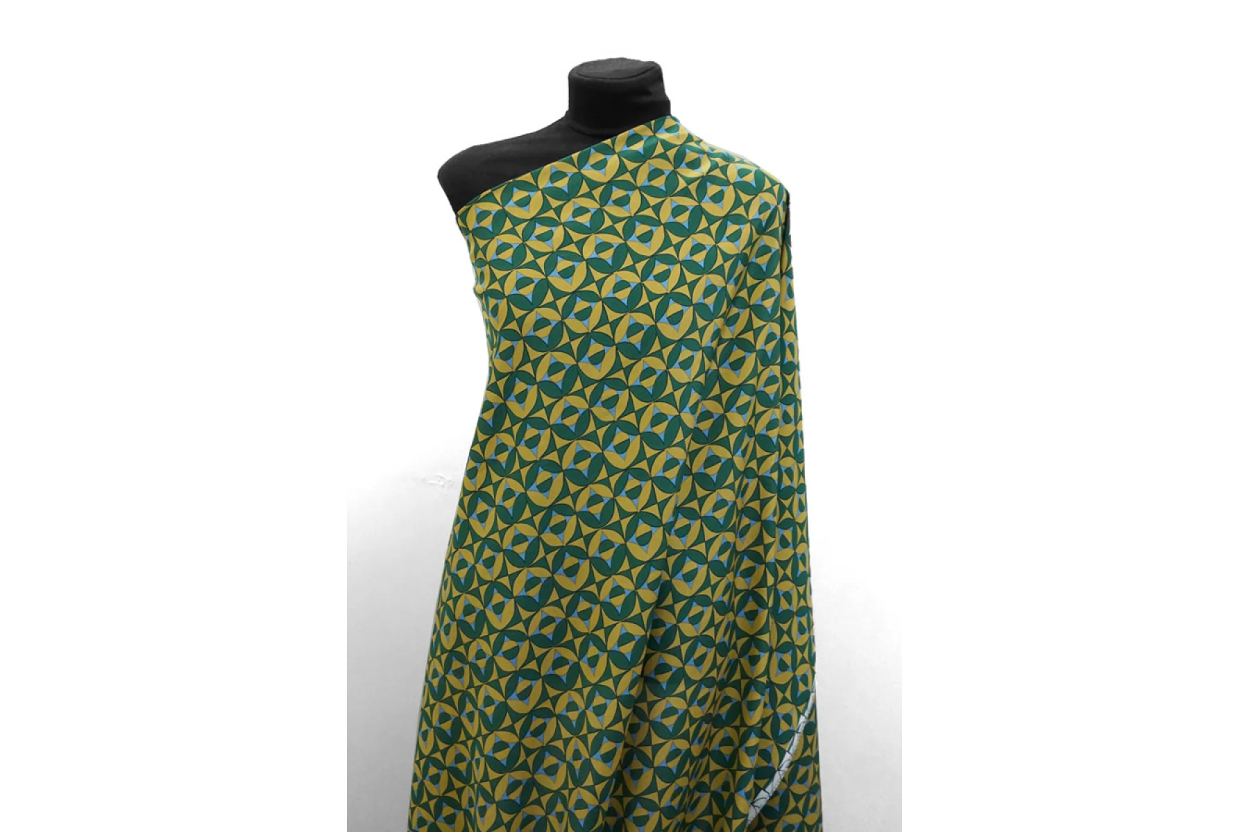 Крепдешин шелковый от MAX MARA с геометрическим принтом, сочетание зелёного, голубого и горчичного цвета. Приятный, тонкий, легкий. Пластичный. Просвечивает. Не тянется. Не мнется. Красив в складках. Шьем платья, блузки, юбки и другие варианты. При необходимости используйте подкладочный материал.