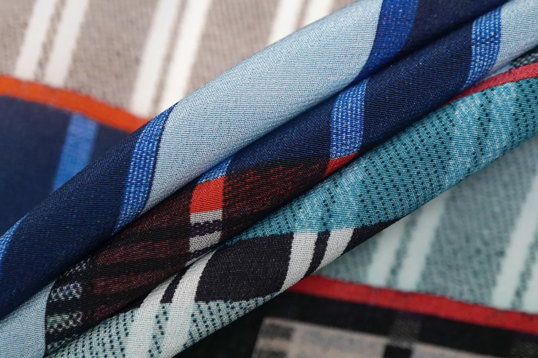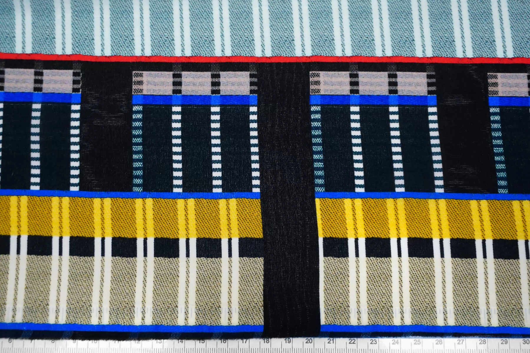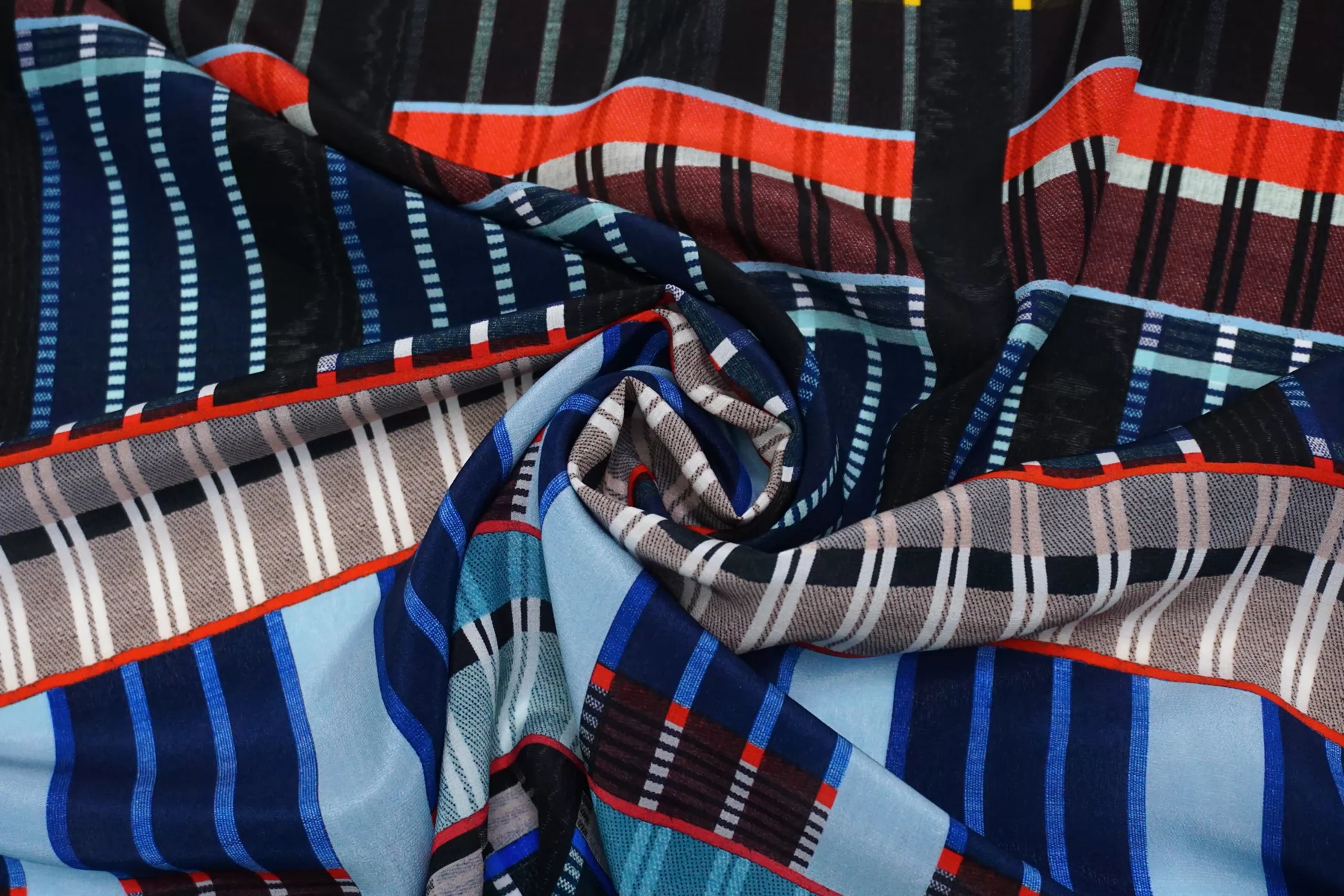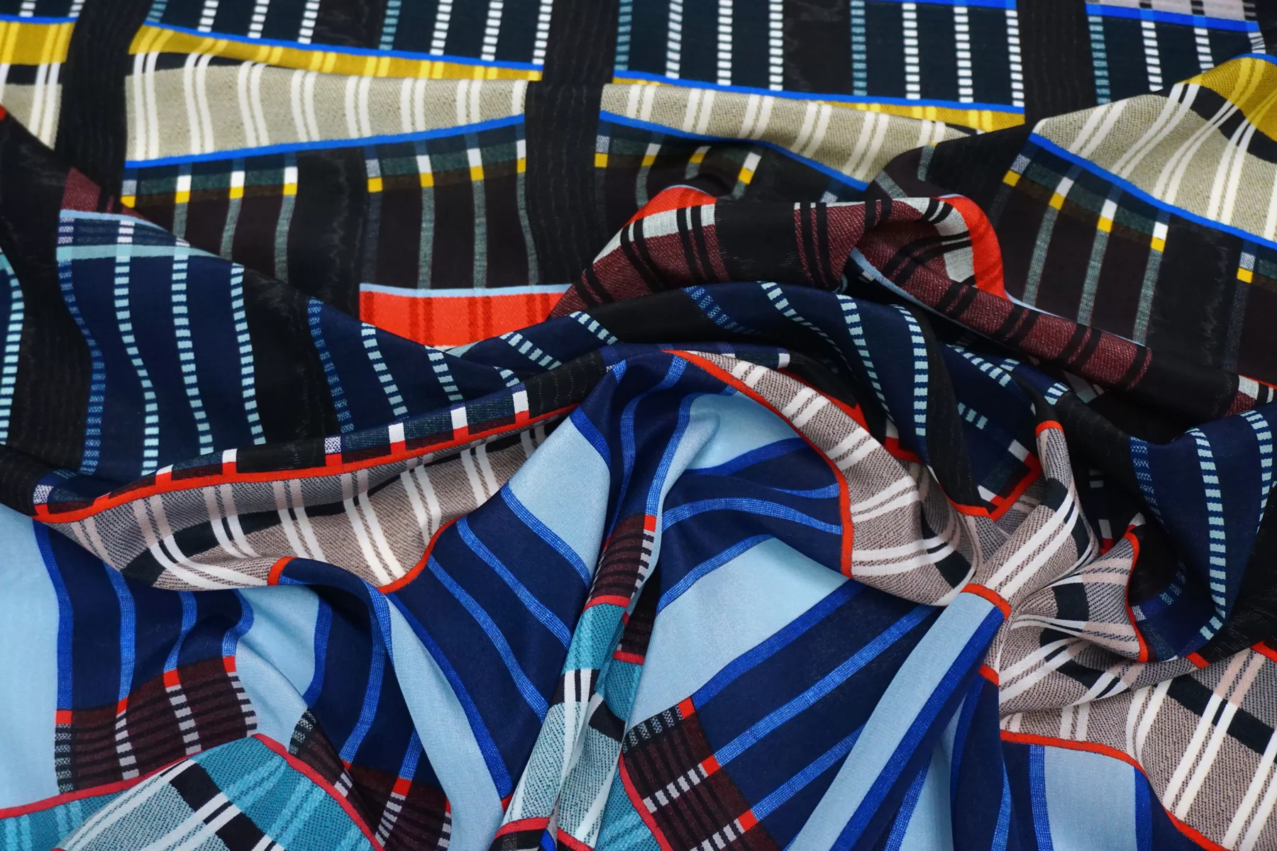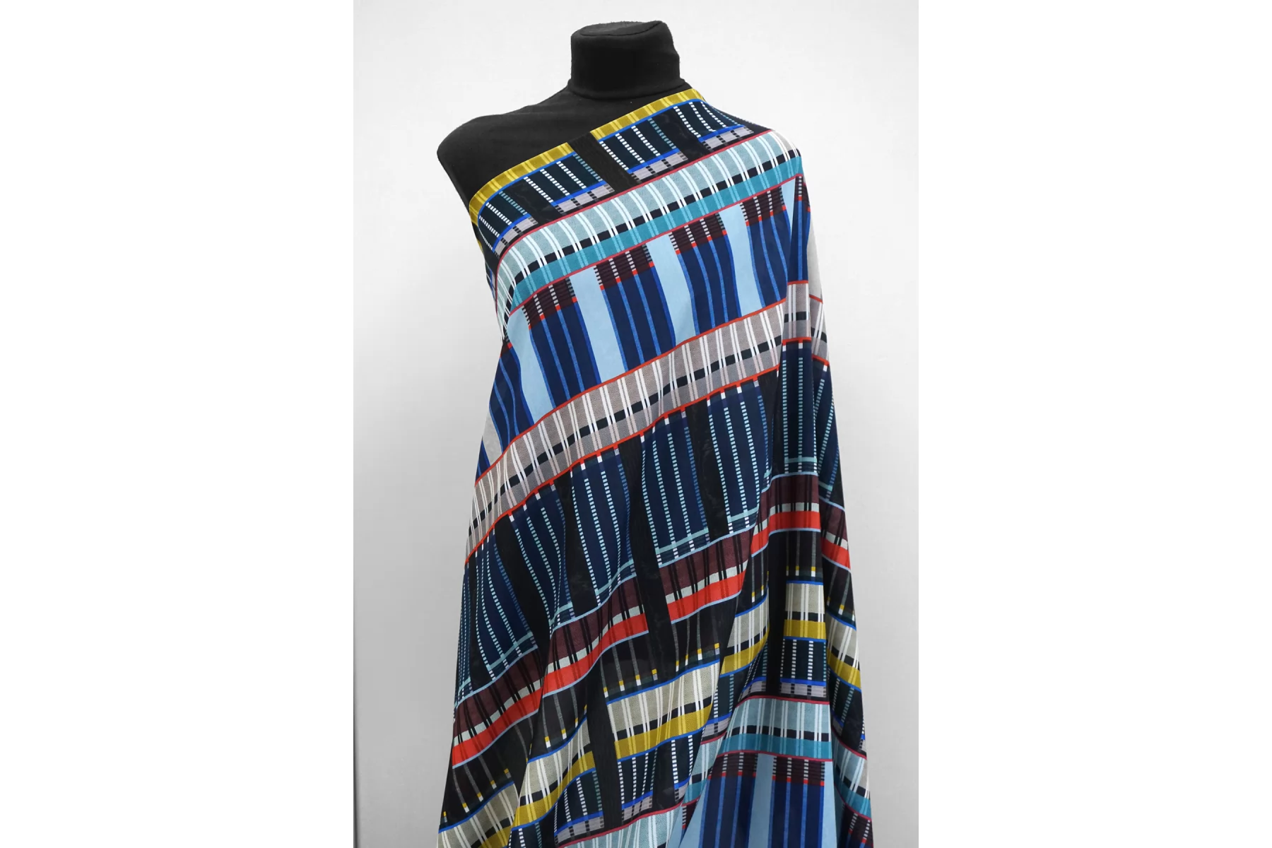 Раппорт 64 см. Крепдешин шелковый от MAX MARA с крупным геометрическим принтом, сочетание чёрного, тёмно-синего, красного, голубого, мятного, зелёного, бордового, жёлтого. Приятный, тонкий, легкий. Пластичный. Просвечивает. Не тянется. Не мнется. Красив в складках. Шьем платья, блузки, юбки и другие варианты. При необходимости используйте подкладочный материал.