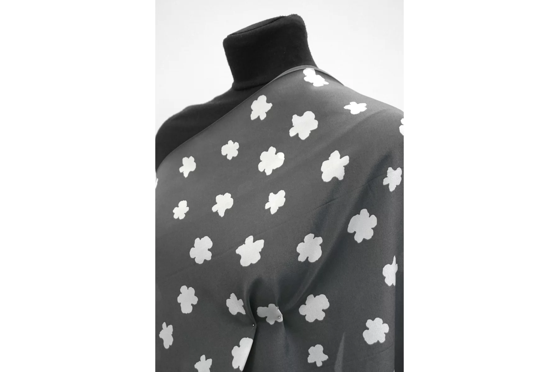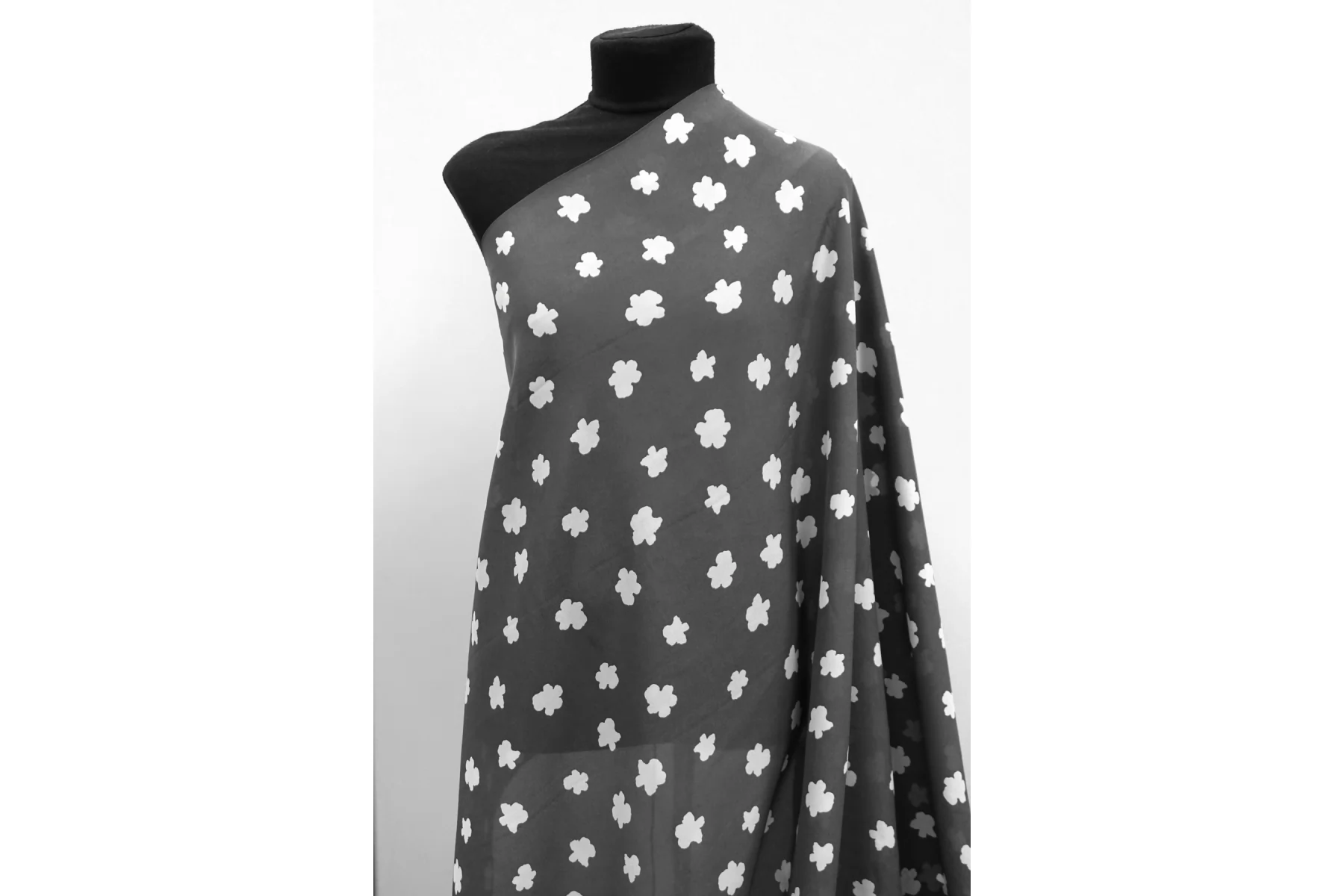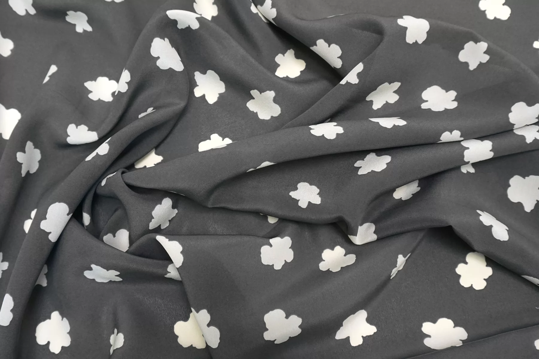 Крепдешин шелковый от MAX MARA серого цвета (не чистый, есть очень лёгкий желтовато-зеленоватый подтон) с принтом в виде молочных силуэтов цветов. Приятный, тонкий, легкий. Пластичный. Просвечивает. Не тянется. Не мнется. Красив в складках. Шьем платья, блузки, юбки и другие варианты. При необходимости используйте подкладочный материал.