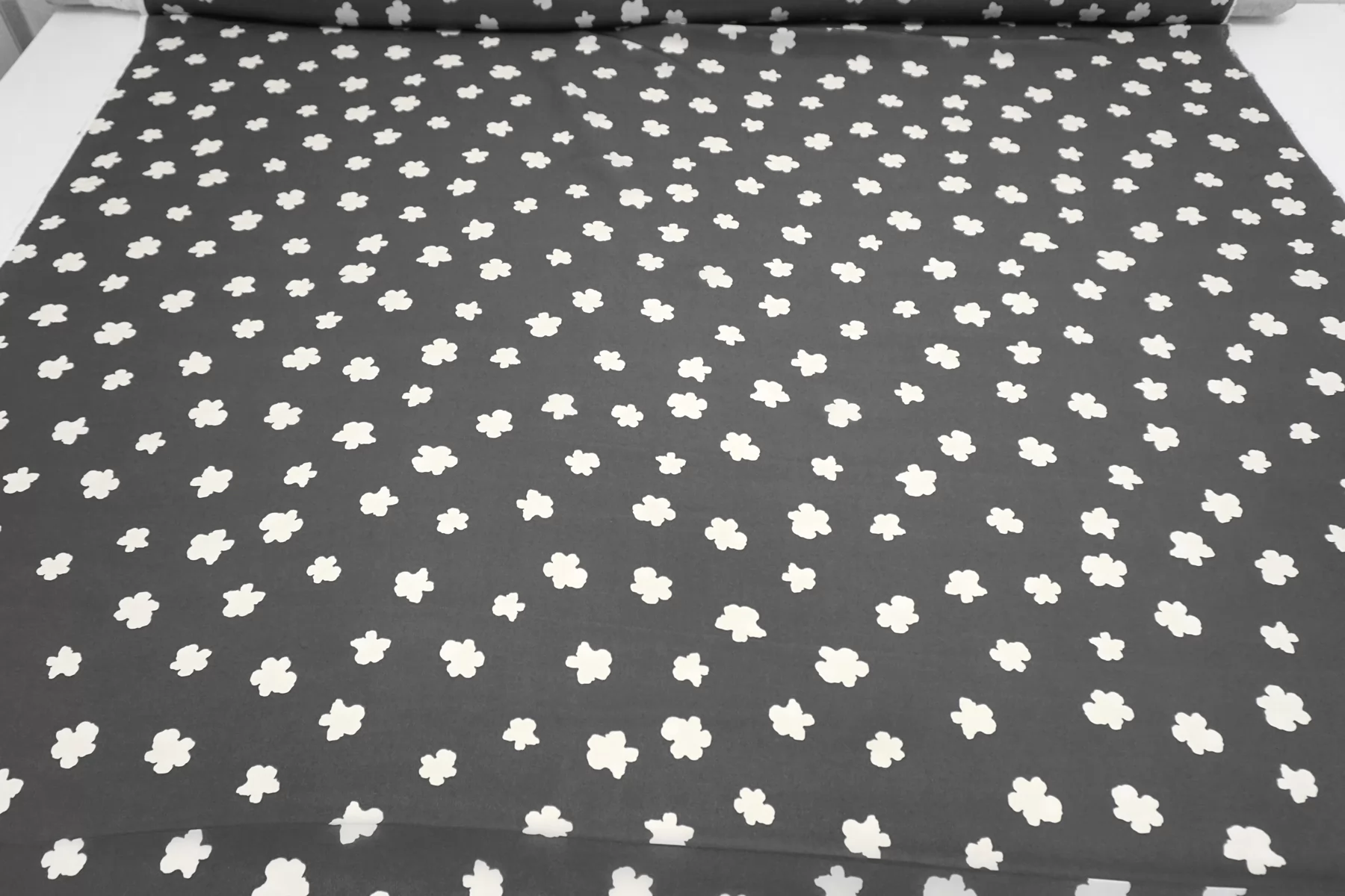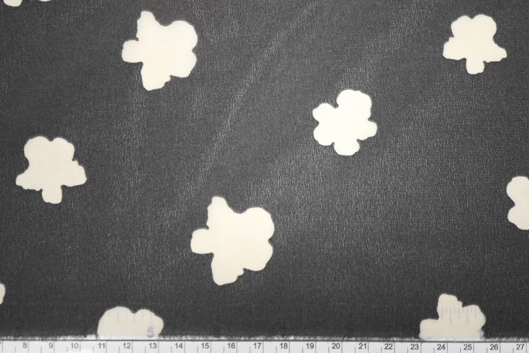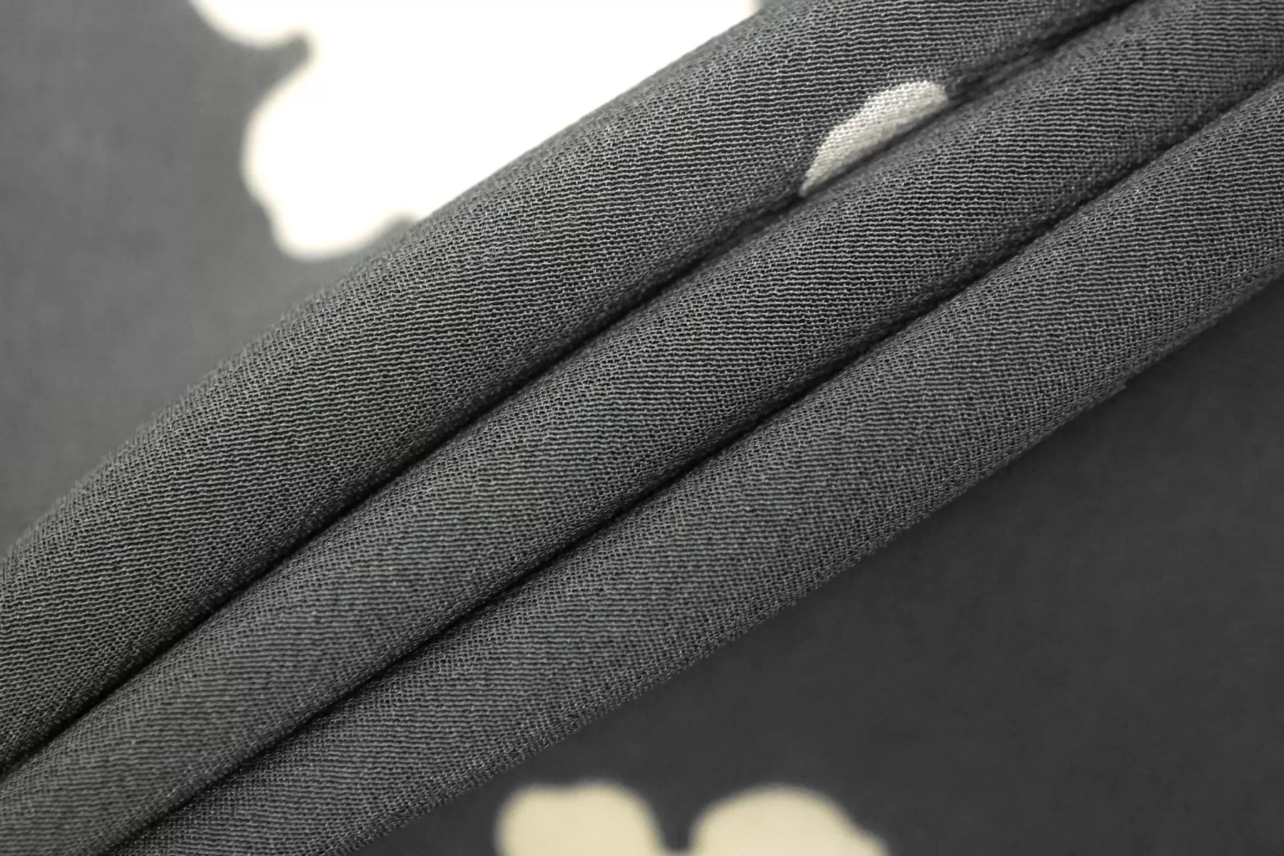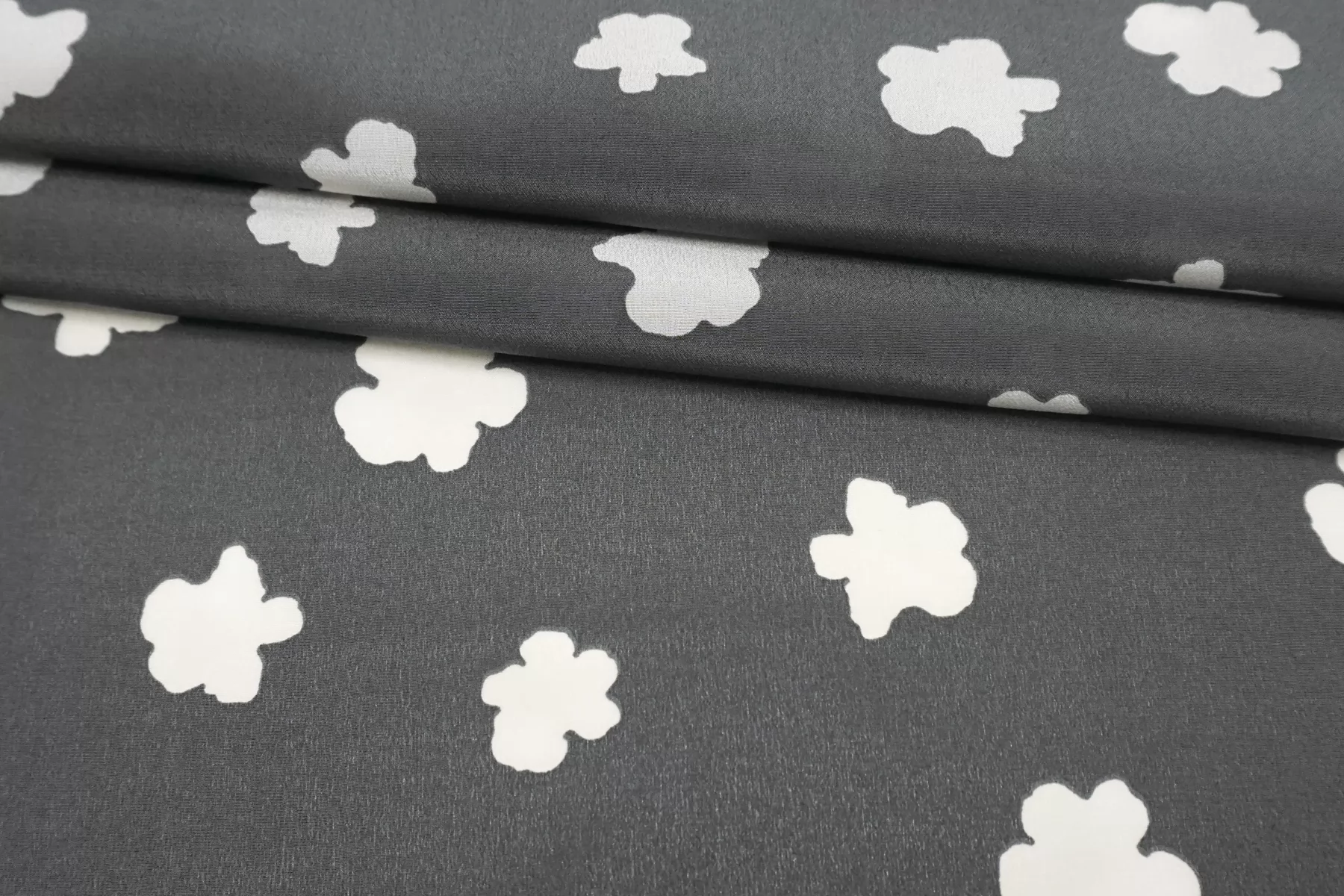 Крепдешин шелковый от MAX MARA серого цвета (не чистый, есть очень лёгкий желтовато-зеленоватый подтон) с принтом в виде молочных силуэтов цветов. Приятный, тонкий, легкий. Пластичный. Просвечивает. Не тянется. Не мнется. Красив в складках. Шьем платья, блузки, юбки и другие варианты. При необходимости используйте подкладочный материал.