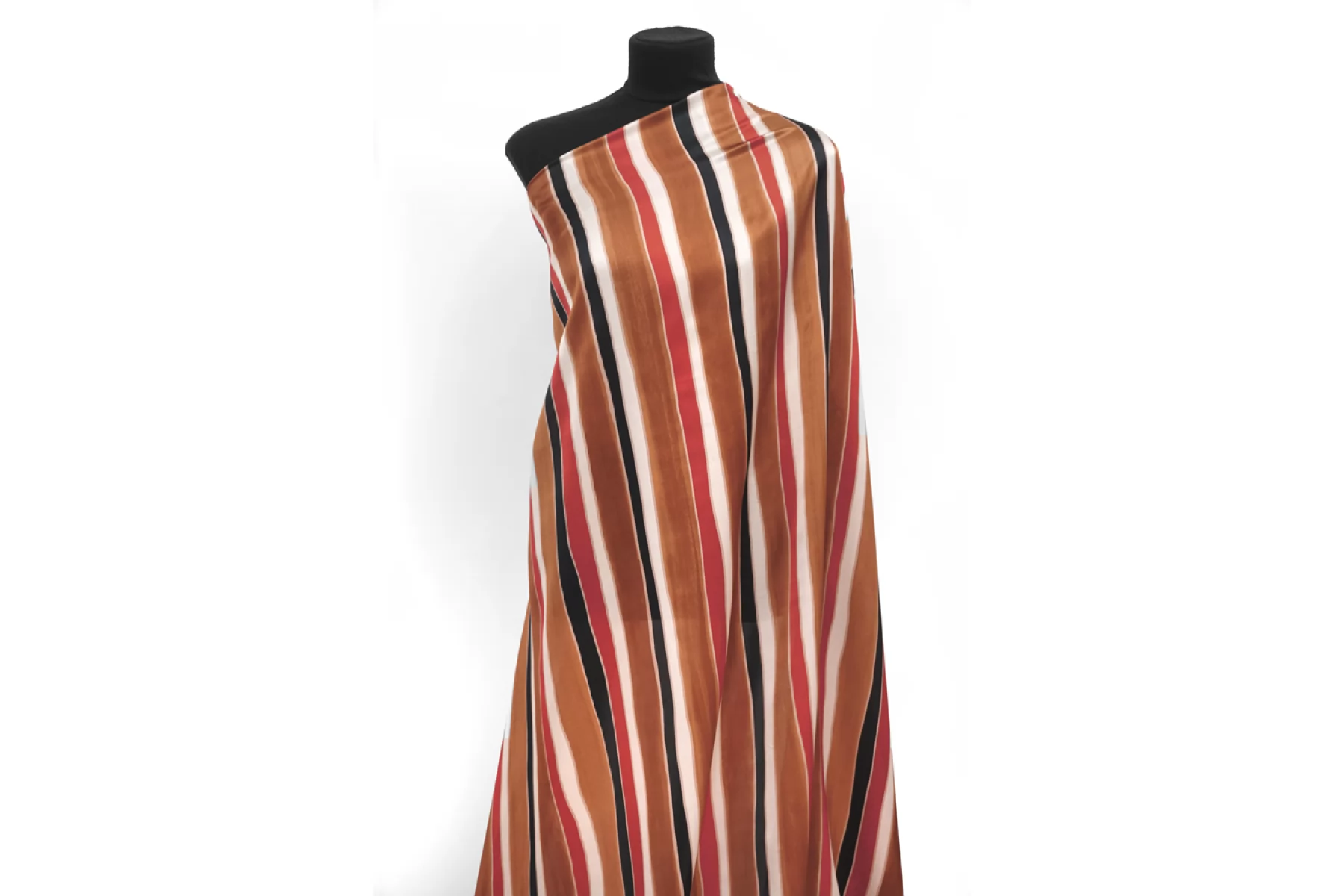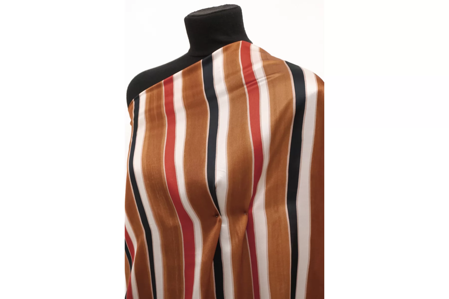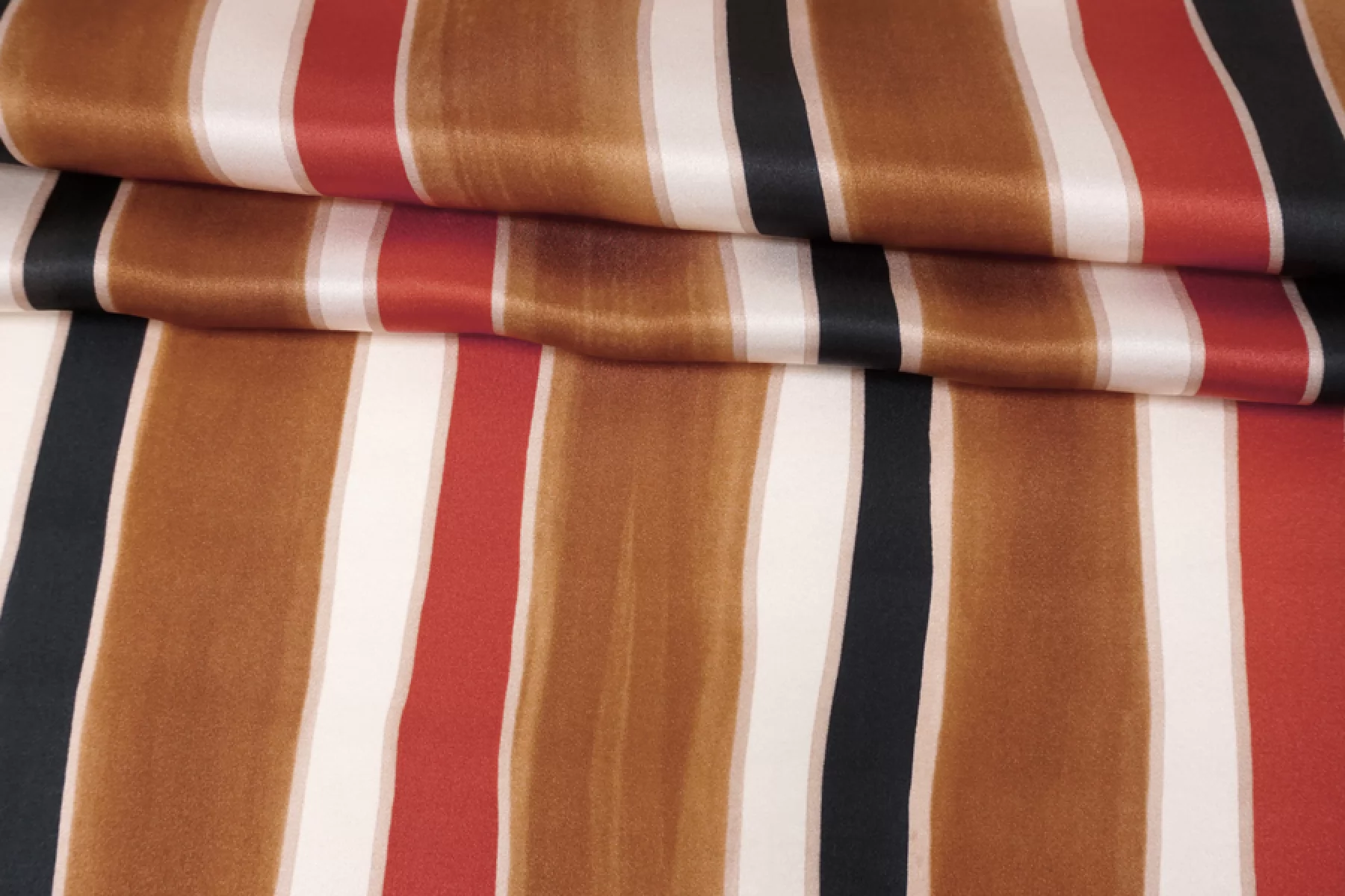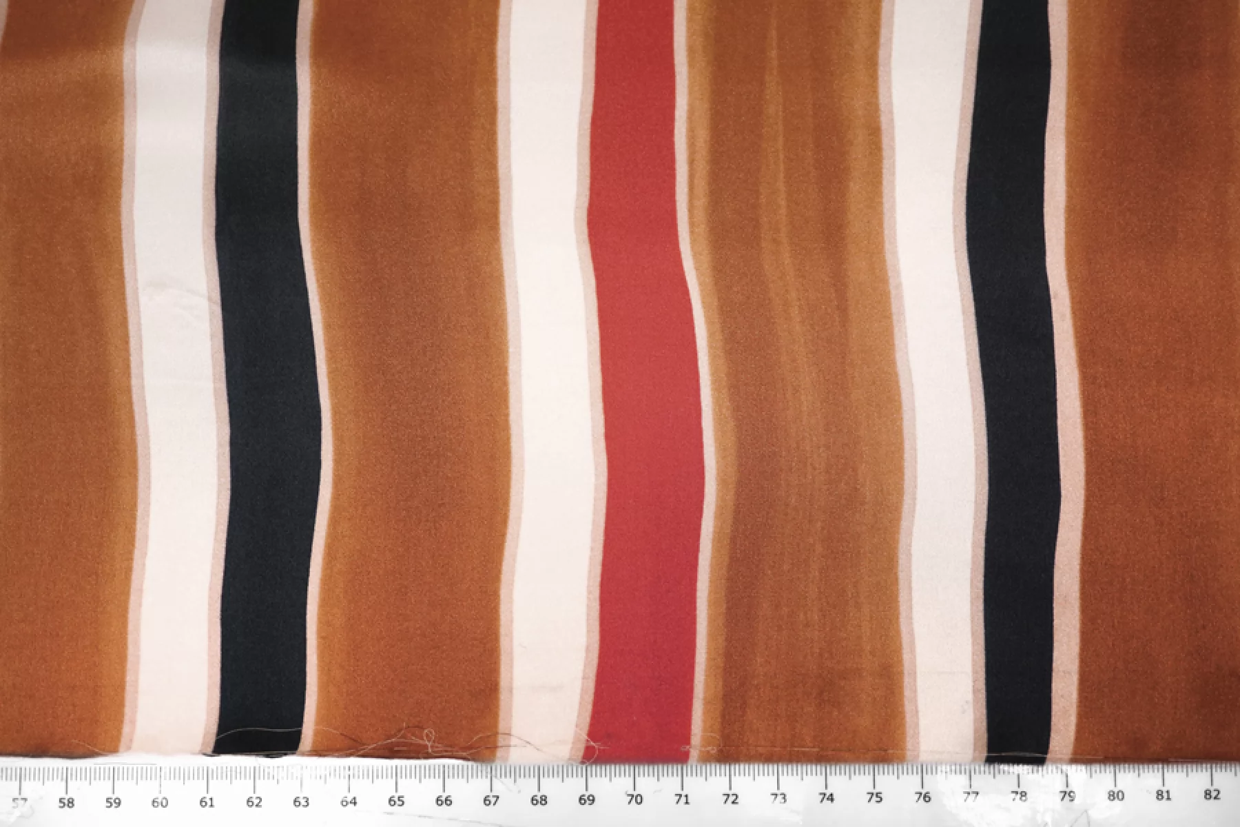 Итальянский шелковый атлас от Max Mara с принтом в полоску в коричневых и красных оттенках. Поверхность материала гладкая и скользящая. Ткань легкая и летящая. Форму не держит. Не тянется, но слегка пружинит за счет плетения. Красиво струится. Просвечивает силуэт на просвет. Сминается. Отличный вариант на летние платья, блузки и юбки. При необходимости используйте подкладочный материал. Уход, как и за любым шелком, деликатный.