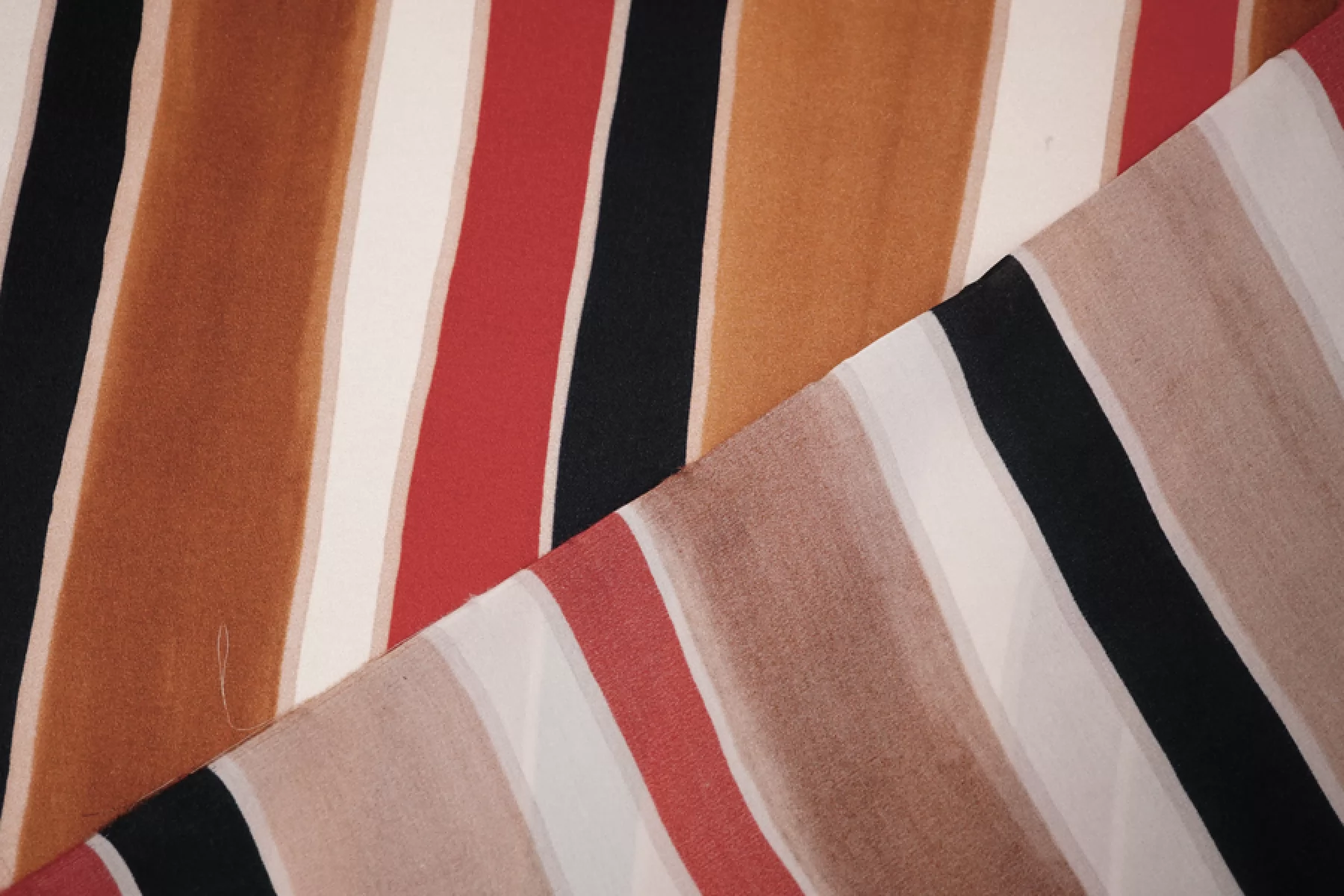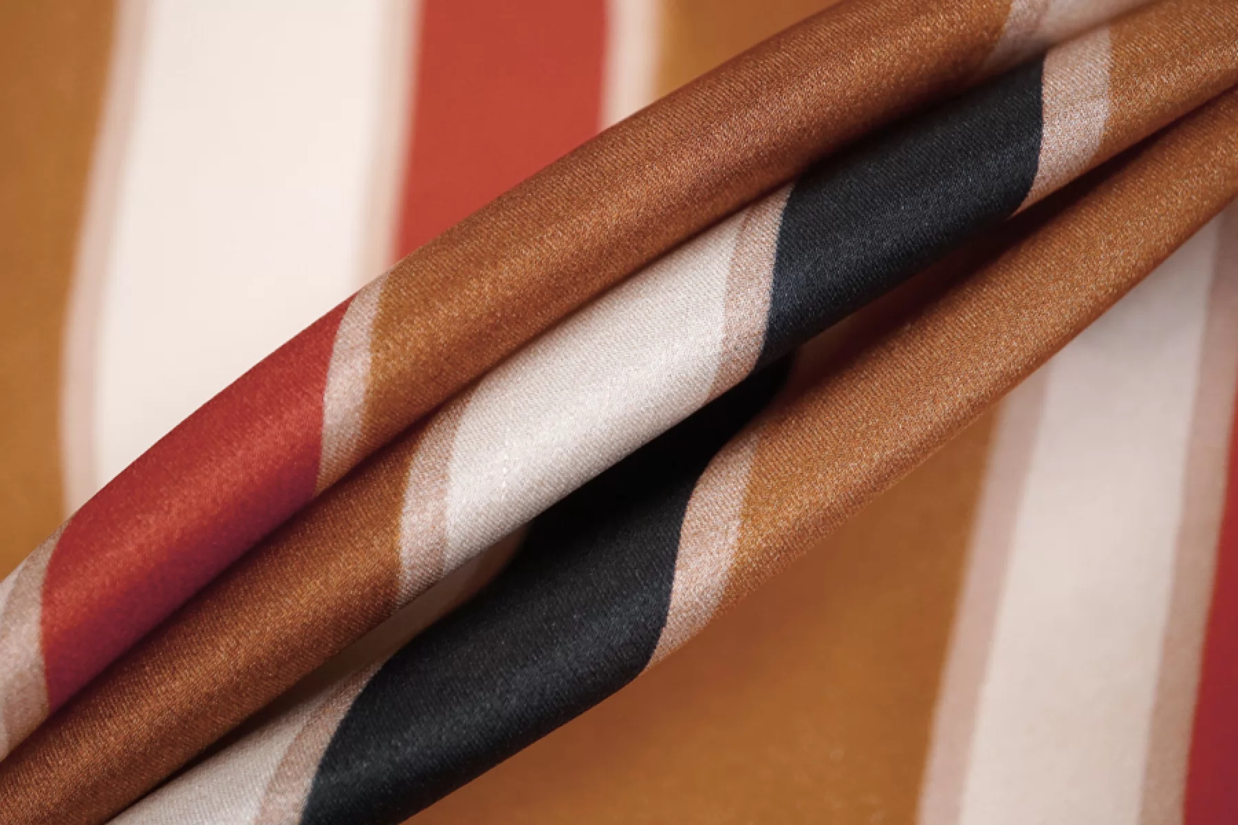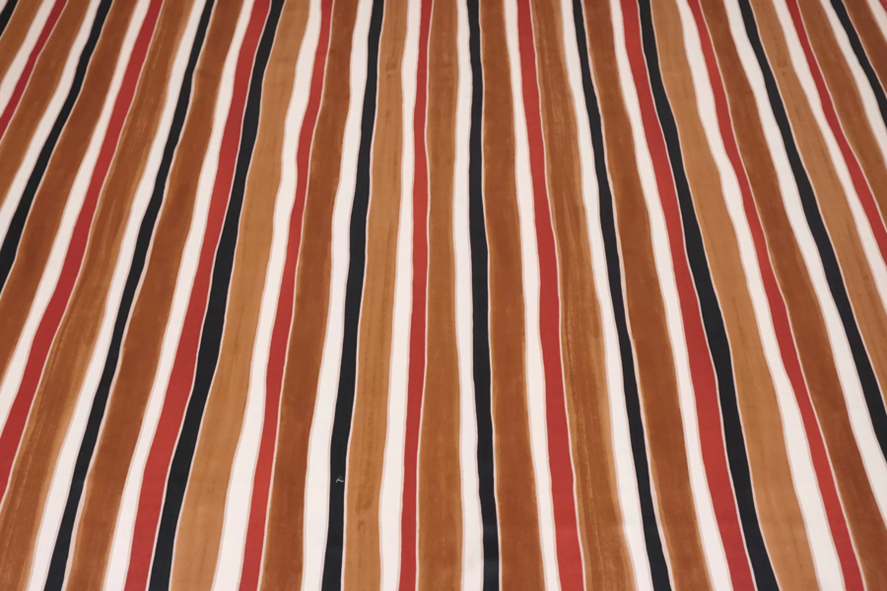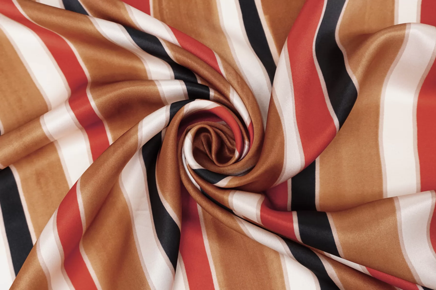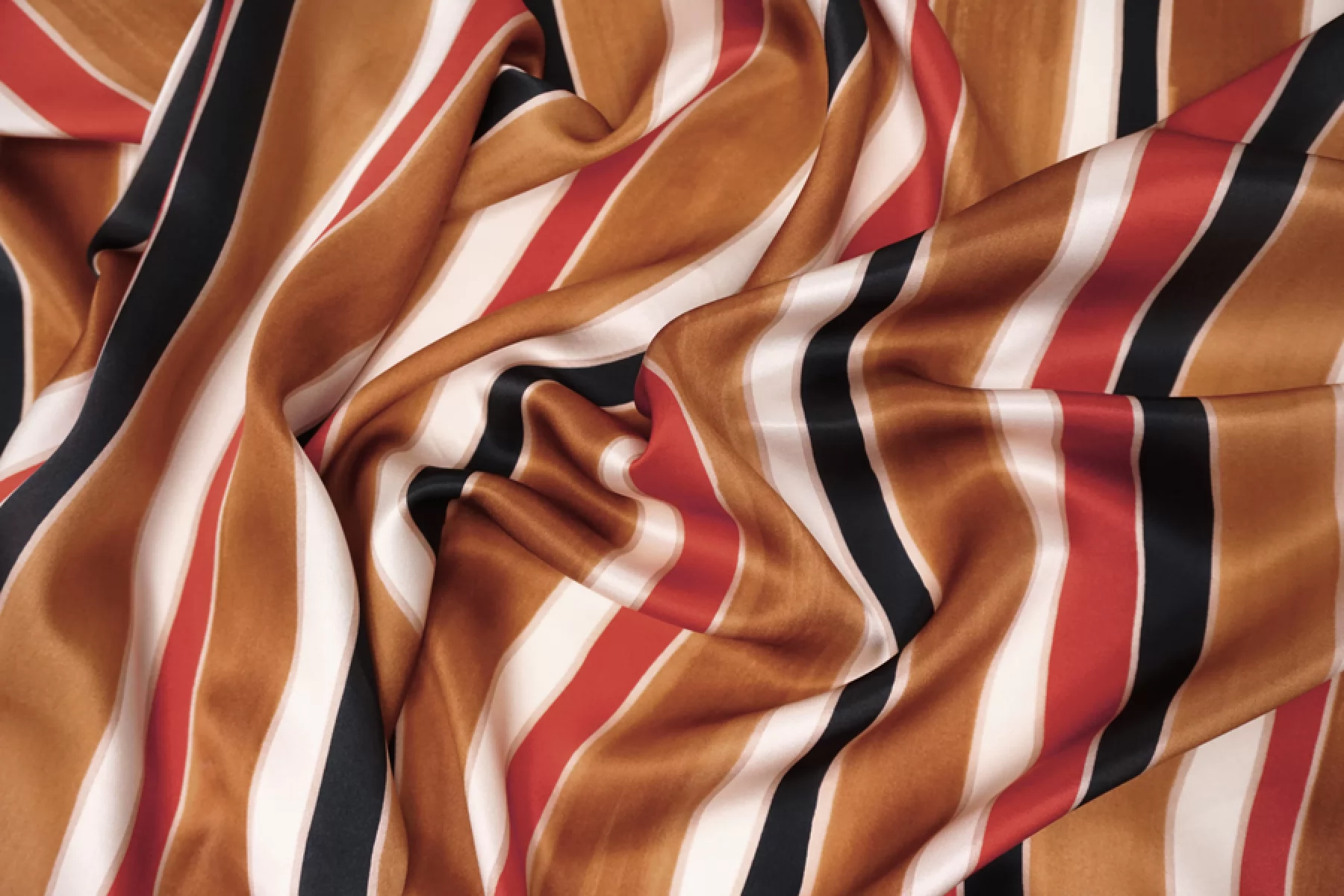 Итальянский шелковый атлас от Max Mara с принтом в полоску в коричневых и красных оттенках. Поверхность материала гладкая и скользящая. Ткань легкая и летящая. Форму не держит. Не тянется, но слегка пружинит за счет плетения. Красиво струится. Просвечивает силуэт на просвет. Сминается. Отличный вариант на летние платья, блузки и юбки. При необходимости используйте подкладочный материал. Уход, как и за любым шелком, деликатный.