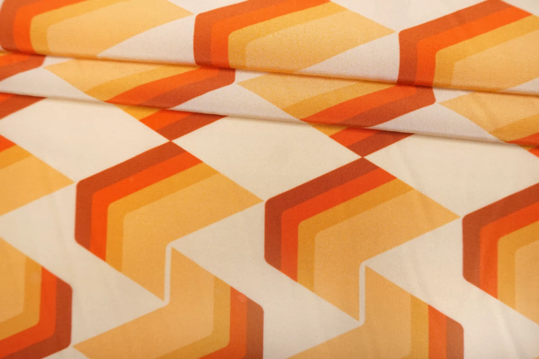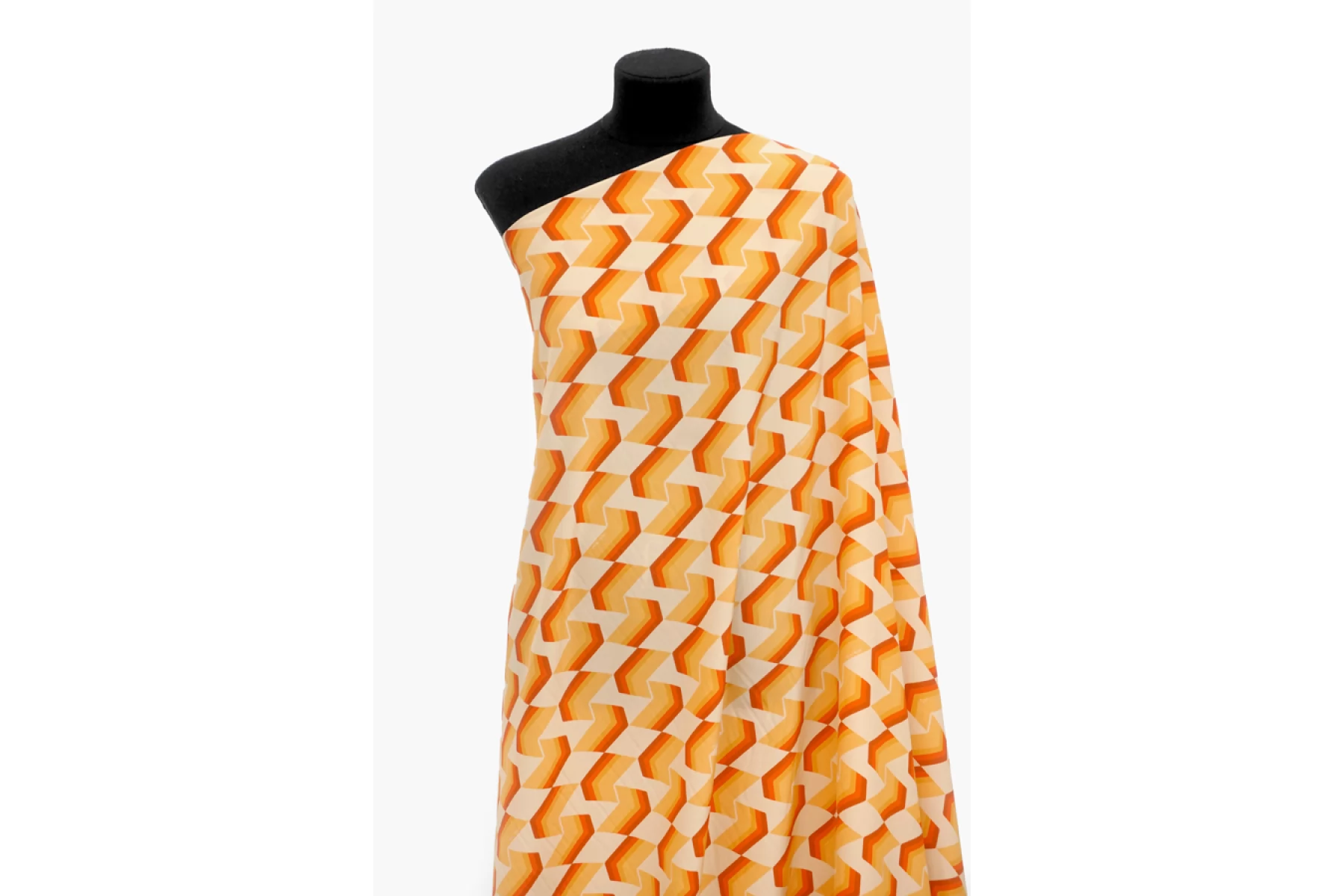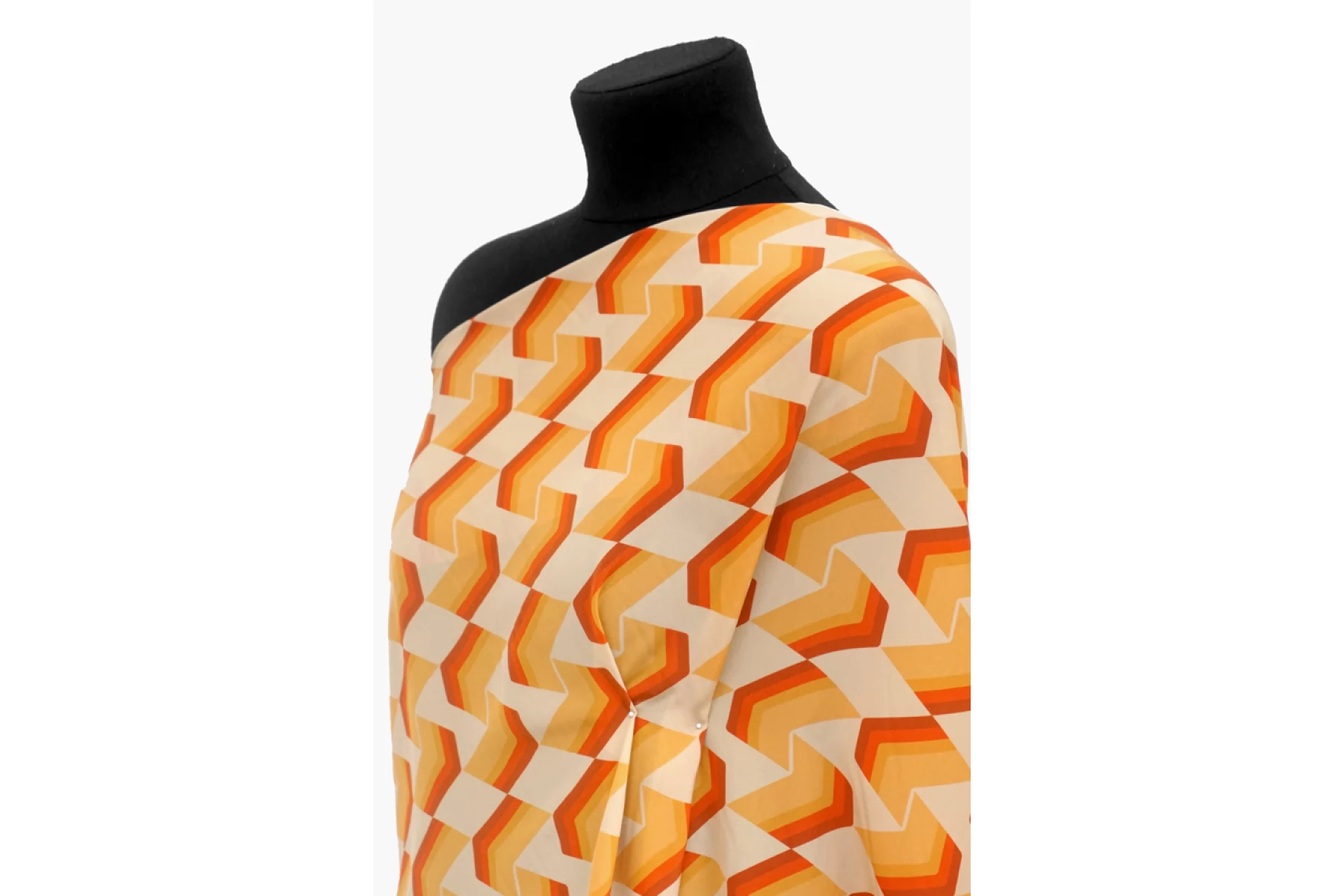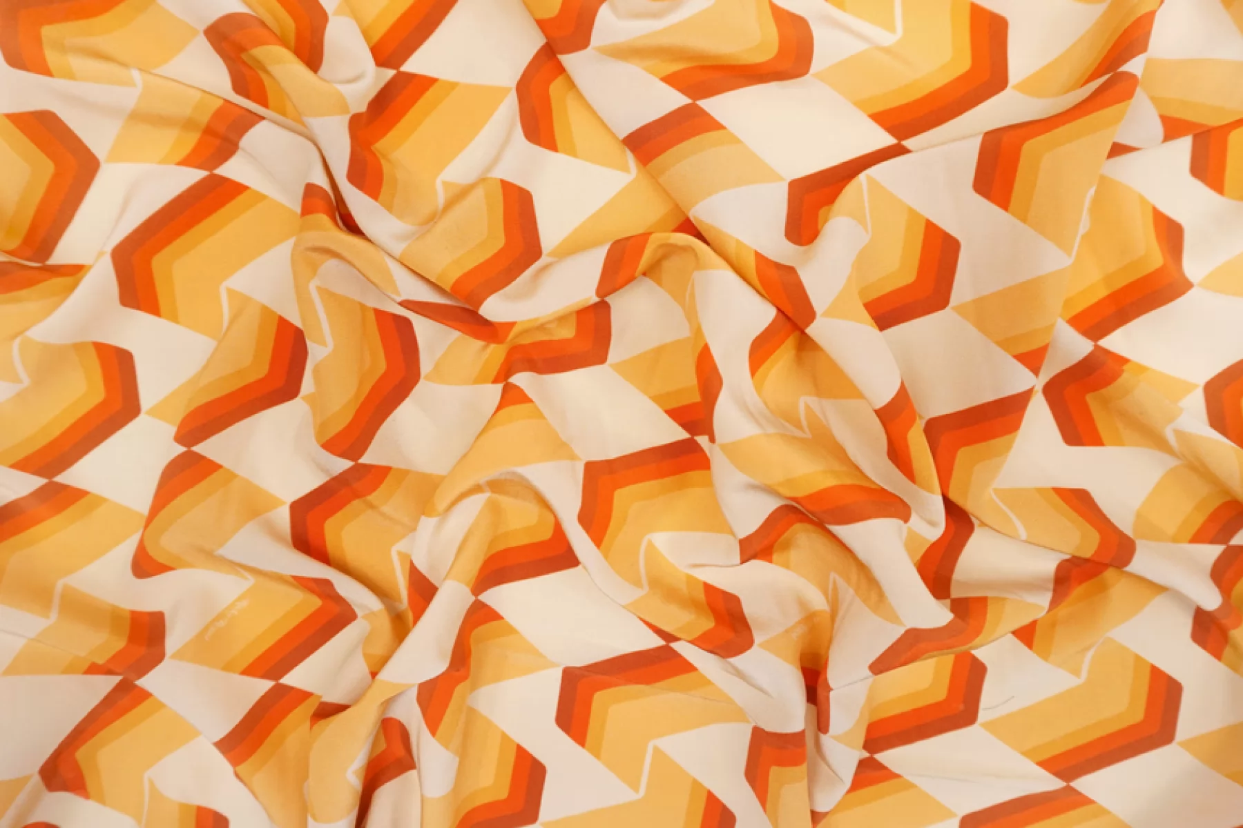 Плательно-блузочный шелковый крепдешин от Ricky Regal, в основе которого бежевый цвет с геометричными "стрелами" в оттенках от желтого до терракотового. Поверхность материала тактильно ощущается как слегка шероховатая. Не тянется. Ткань струящаяся, слегка держит форму, хорошо драпируется и красива в складках. Слегка просвечивает. Прекрасно подойдет на платья, блузки и юбки. При необходимости потребуется подкладочный материал. Уход, как и за любым шелком, деликатный.
