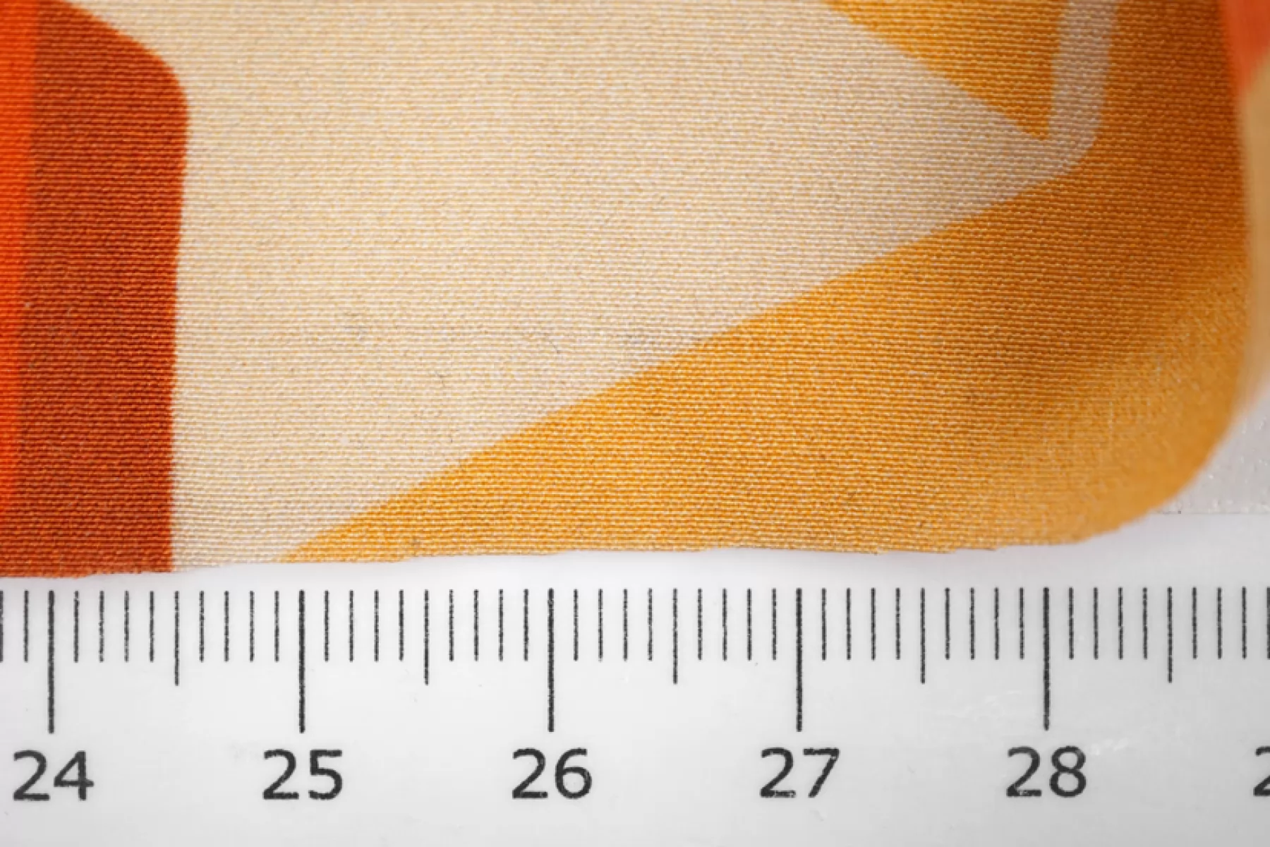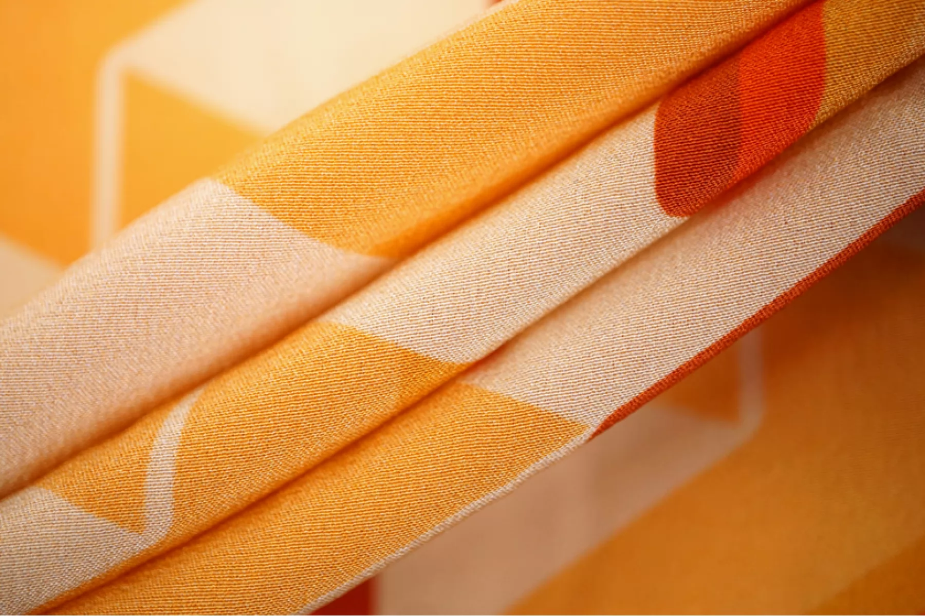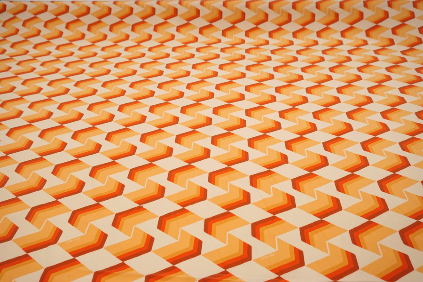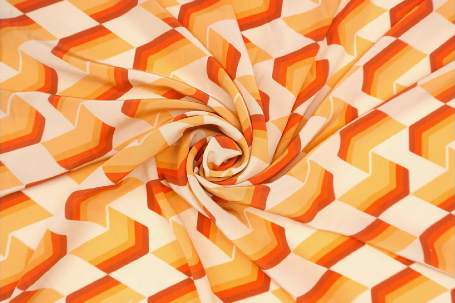 Плательно-блузочный шелковый крепдешин от Ricky Regal, в основе которого бежевый цвет с геометричными "стрелами" в оттенках от желтого до терракотового. Поверхность материала тактильно ощущается как слегка шероховатая. Не тянется. Ткань струящаяся, слегка держит форму, хорошо драпируется и красива в складках. Слегка просвечивает. Прекрасно подойдет на платья, блузки и юбки. При необходимости потребуется подкладочный материал. Уход, как и за любым шелком, деликатный.
