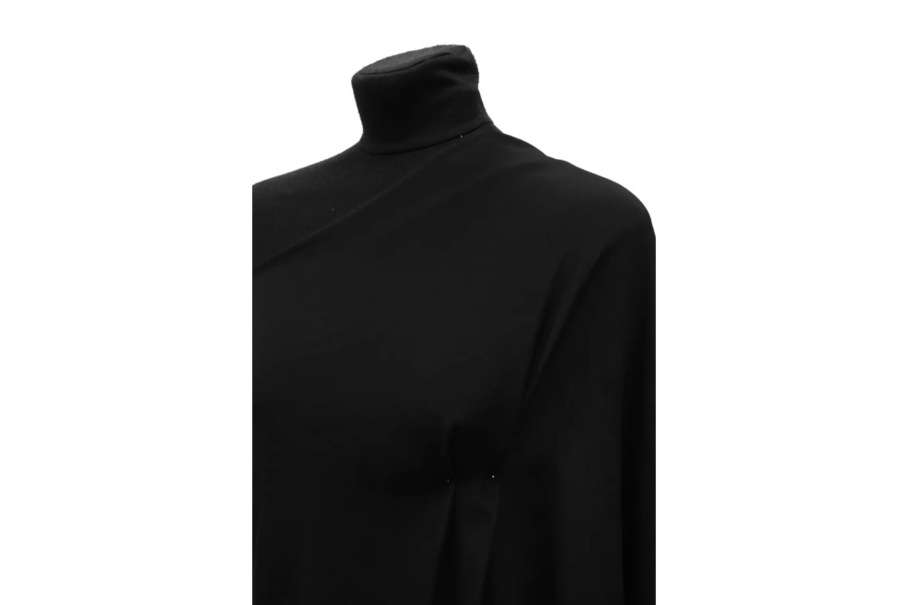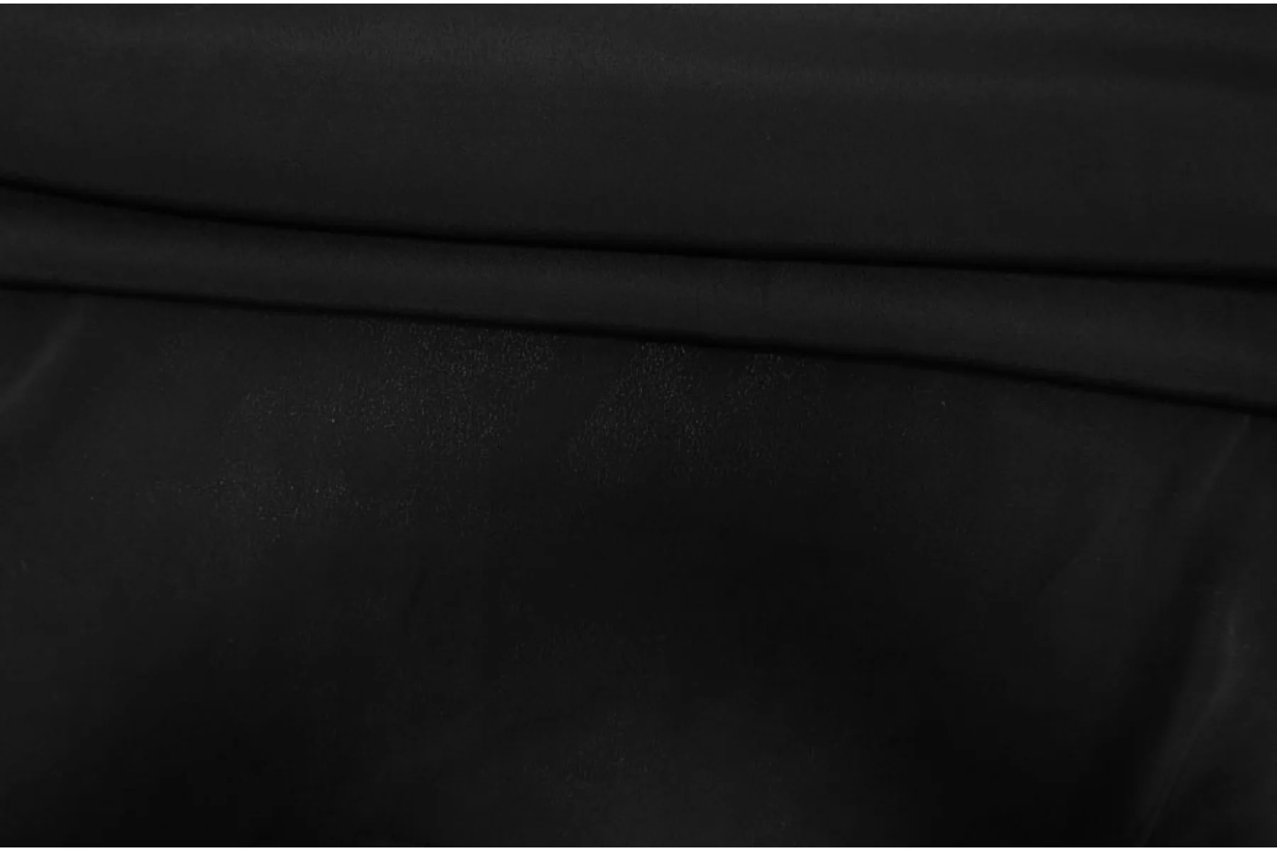 Крепдешин, плательно-блузочный по плотности, шелк с ацетатом в чёрном цвете. Тактильно слегка шероховатый, зернистый, легкий и воздушный. Не тянется. Красив в своей пластике и в складках. Просвечивает. Отлично подойдет на платья, юбки, туники и блузки. Уход - деликатный. Лучше шить вещи свободного кроя либо укреплять швы, т.к. материал склонен к раздвижке нитей основы.