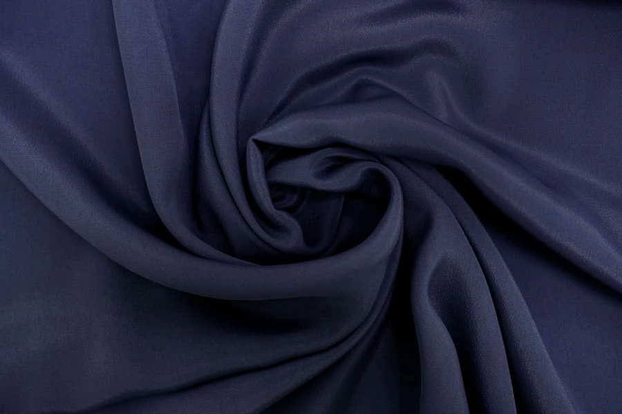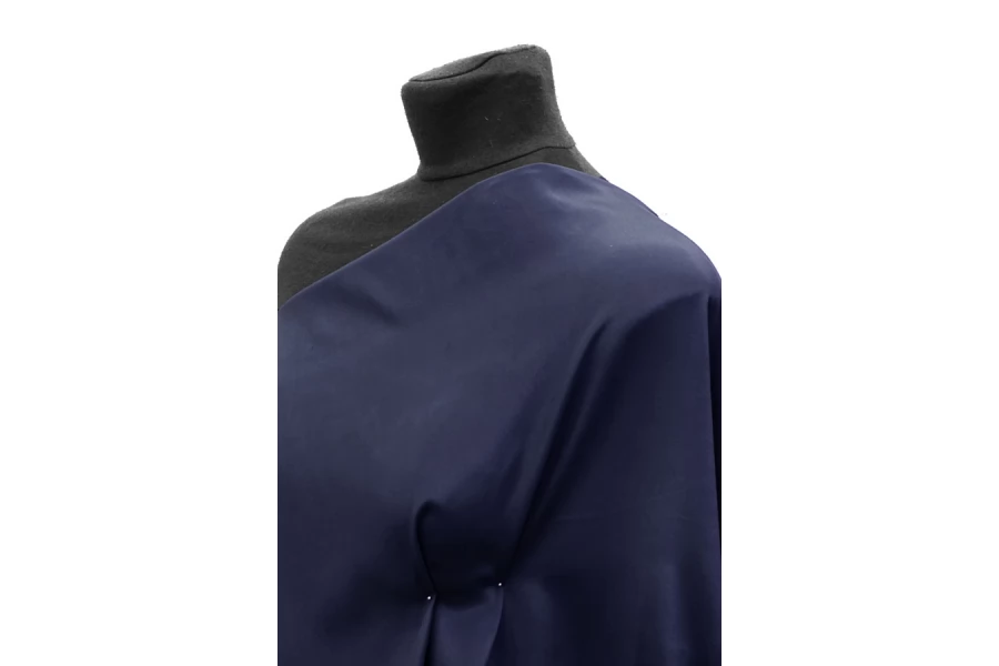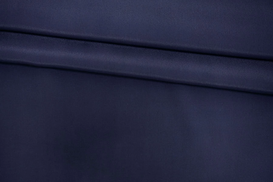 Плательно-блузочный по плотности, крепдешин из шёлка с ацетатом в тёмно-синем цвете. Тактильно слегка шероховатый, легкий и воздушный. Не тянется. Красив в своей пластике и в складках. Немного просвечивает в один слой. Отлично подойдет на платья, юбки, туники и блузки. Уход - деликатный.