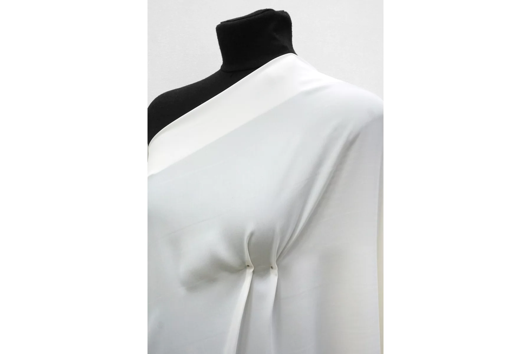 Крепдешин, плательно-блузочный по плотности, шёлк с ацетатом в молочно-белом цвете. Тактильно слегка шероховатый, легкий и воздушный. Не тянется, но немного пружинит за счет плетения. Красив в своей пластике и в складках. Немного просвечивает. Отлично подойдет на платья, юбки, туники и блузки. Уход - деликатный.