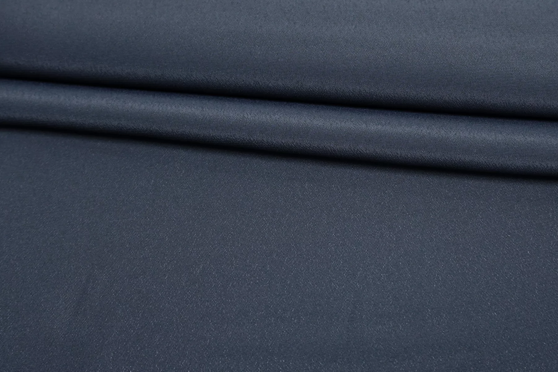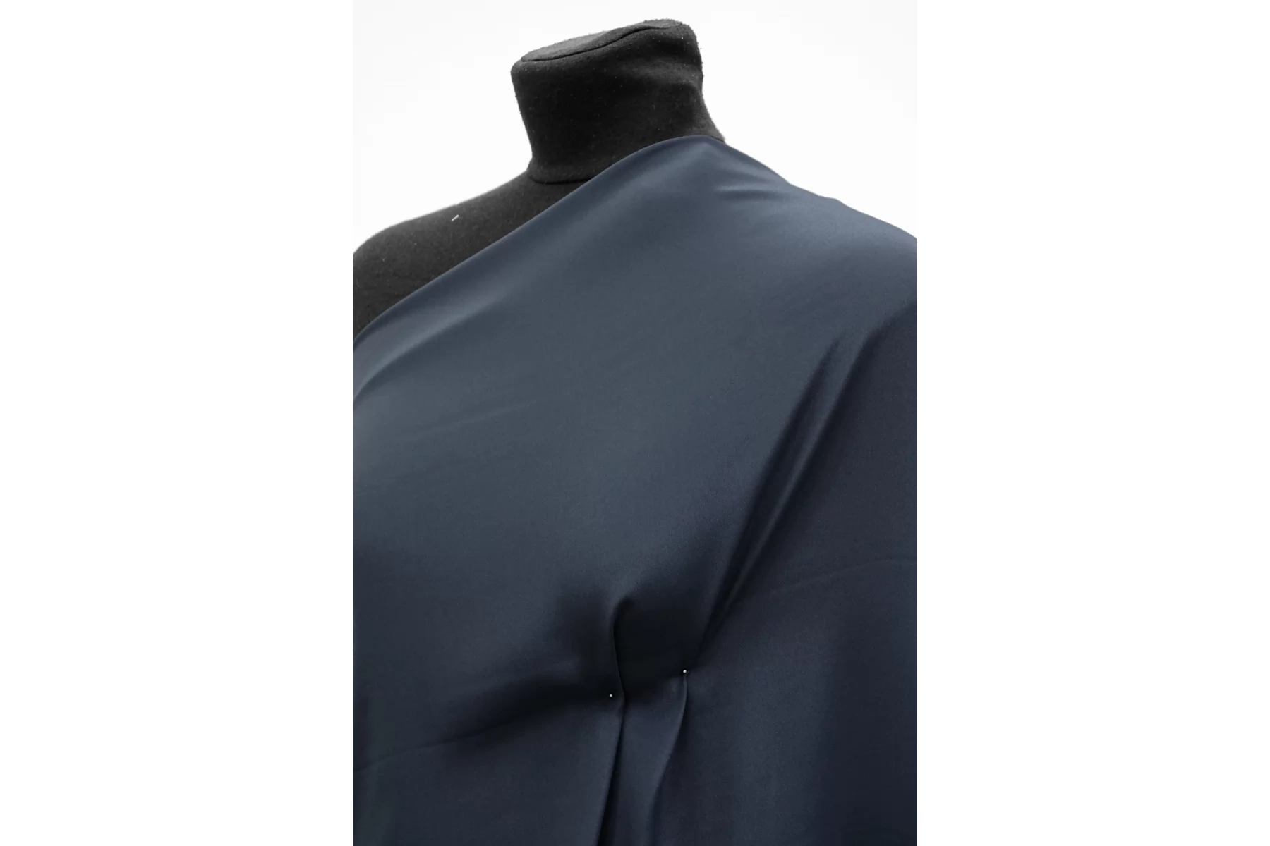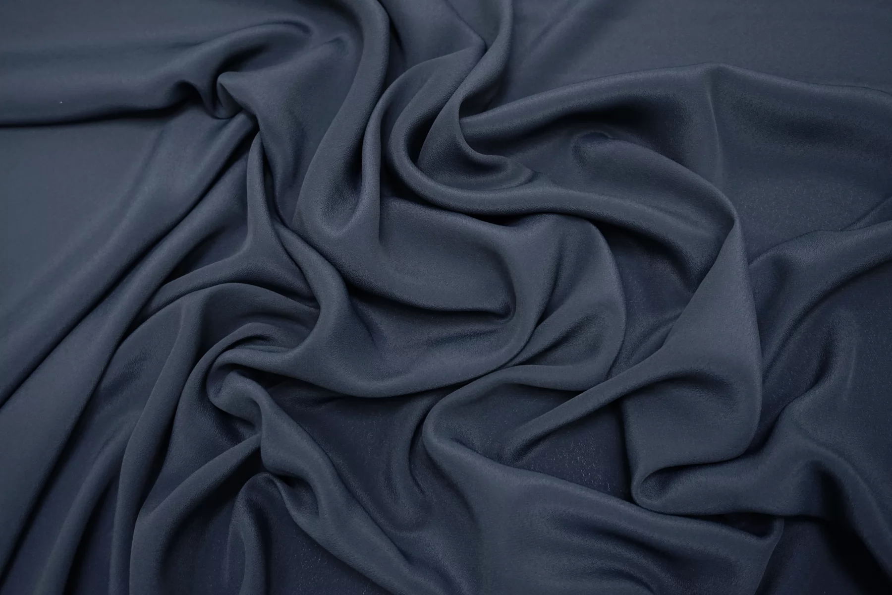 Крепдешин, плательно-блузочный по плотности, шёлк с ацетатом в синевато-сером цвете. Тактильно слегка шероховатый, легкий и воздушный. Не тянется, но немного пружинит за счет плетения. Красив в своей пластике и в складках. Немного просвечивает. Отлично подойдет на платья, юбки, туники и блузки. Уход - деликатный.