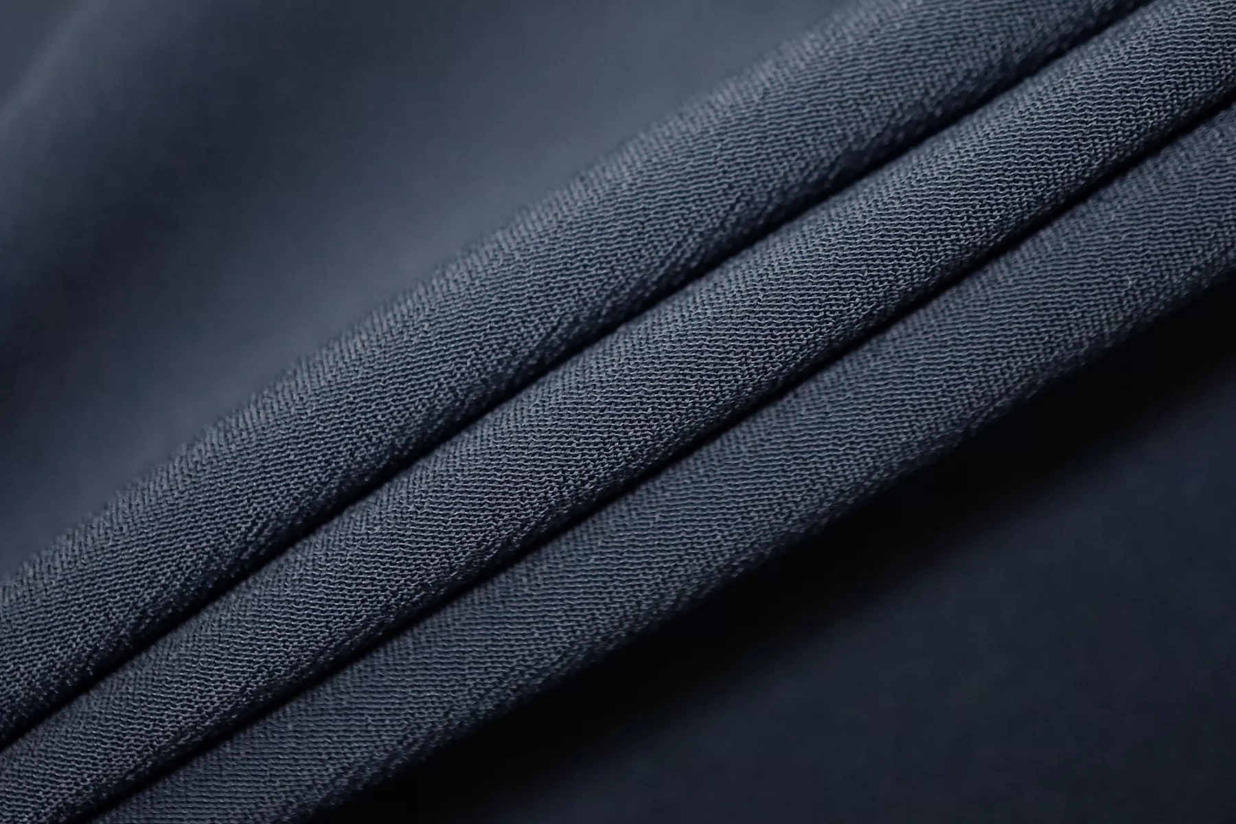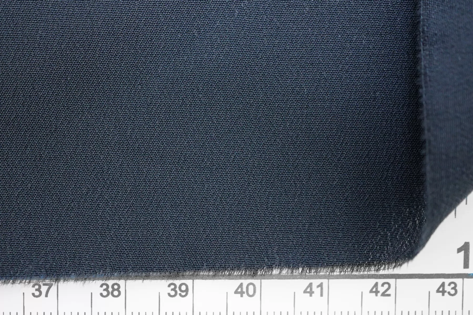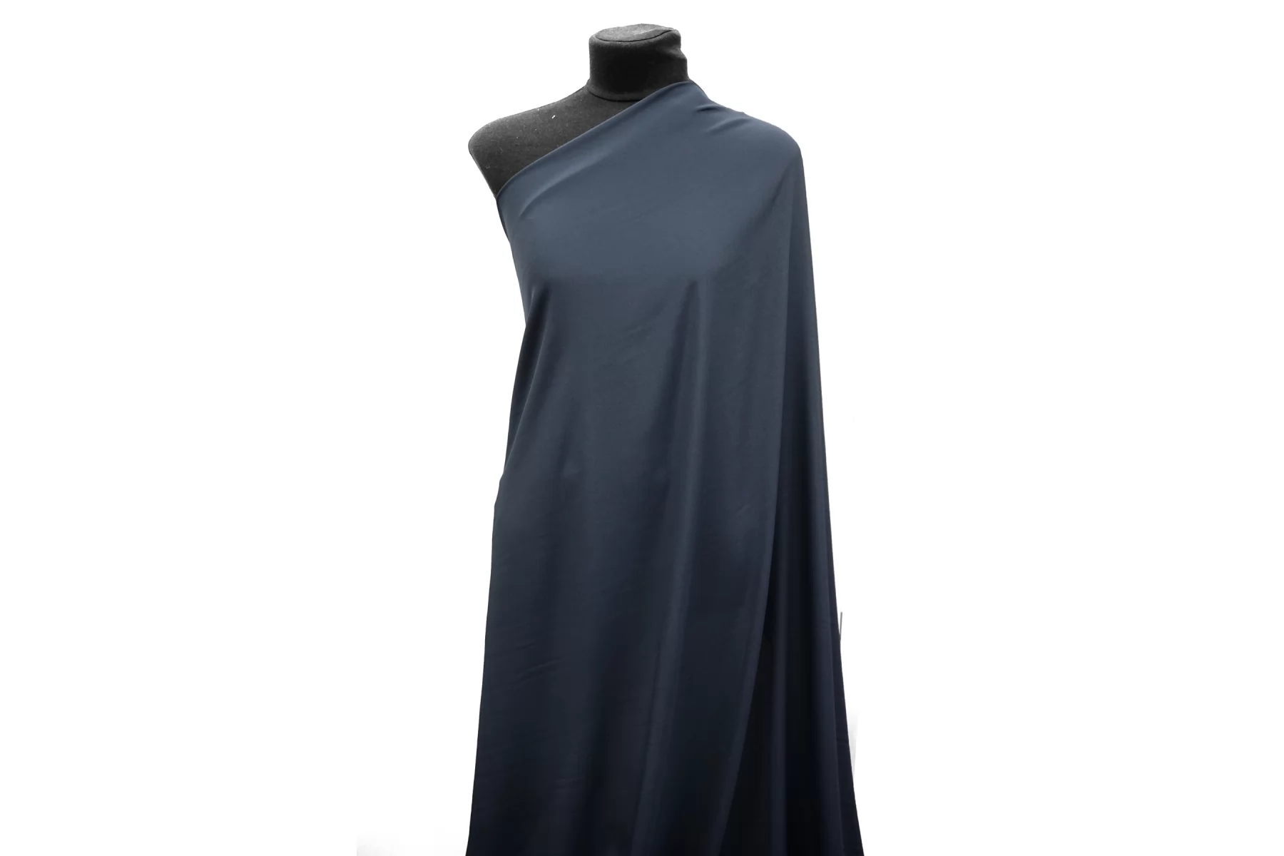 Крепдешин, плательно-блузочный по плотности, шёлк с ацетатом в синевато-сером цвете. Тактильно слегка шероховатый, легкий и воздушный. Не тянется, но немного пружинит за счет плетения. Красив в своей пластике и в складках. Немного просвечивает. Отлично подойдет на платья, юбки, туники и блузки. Уход - деликатный.