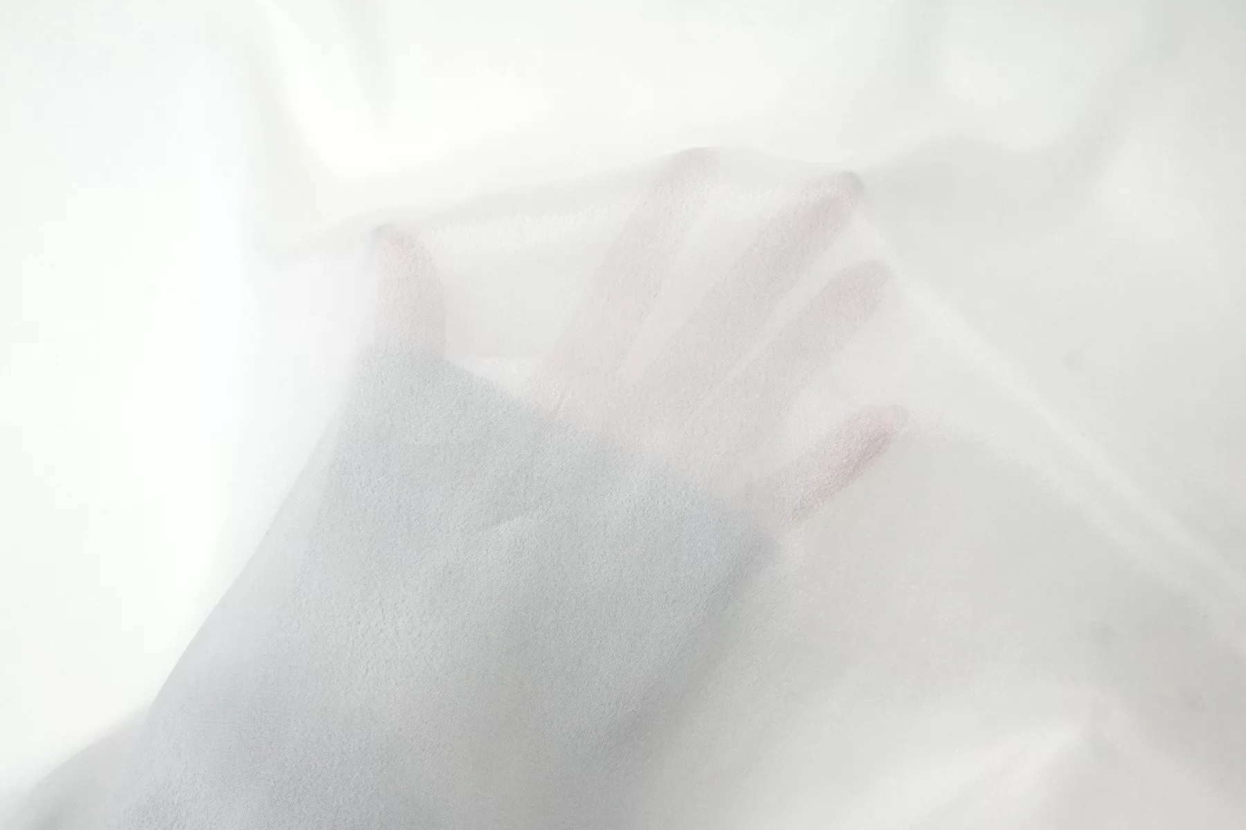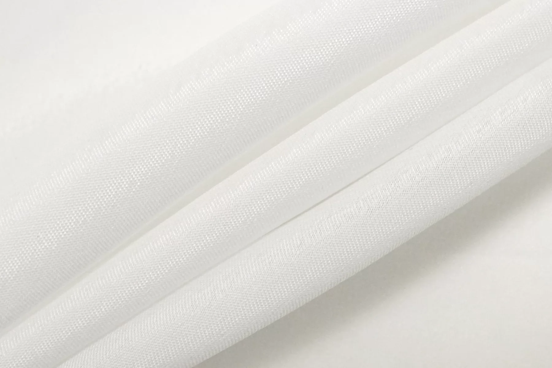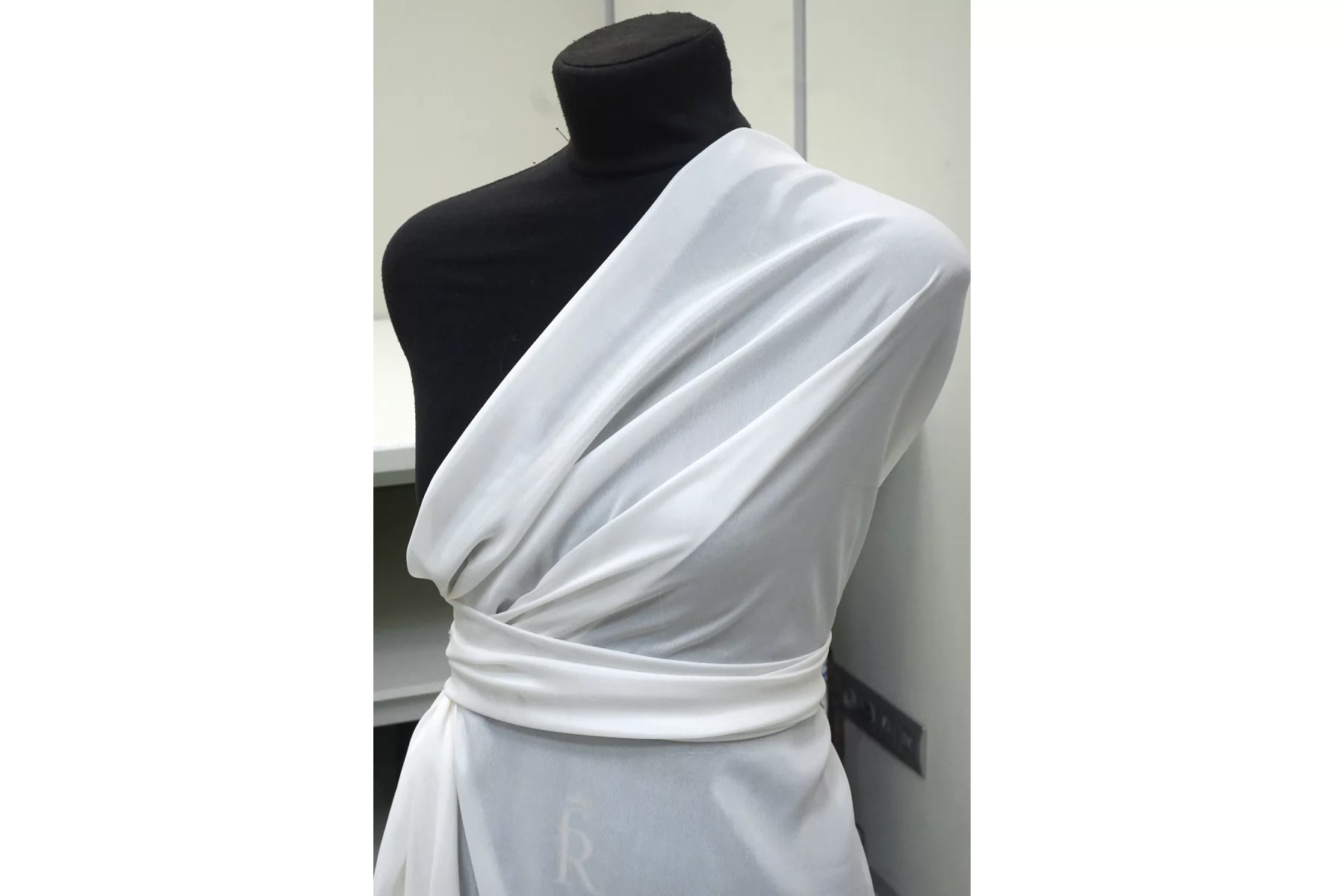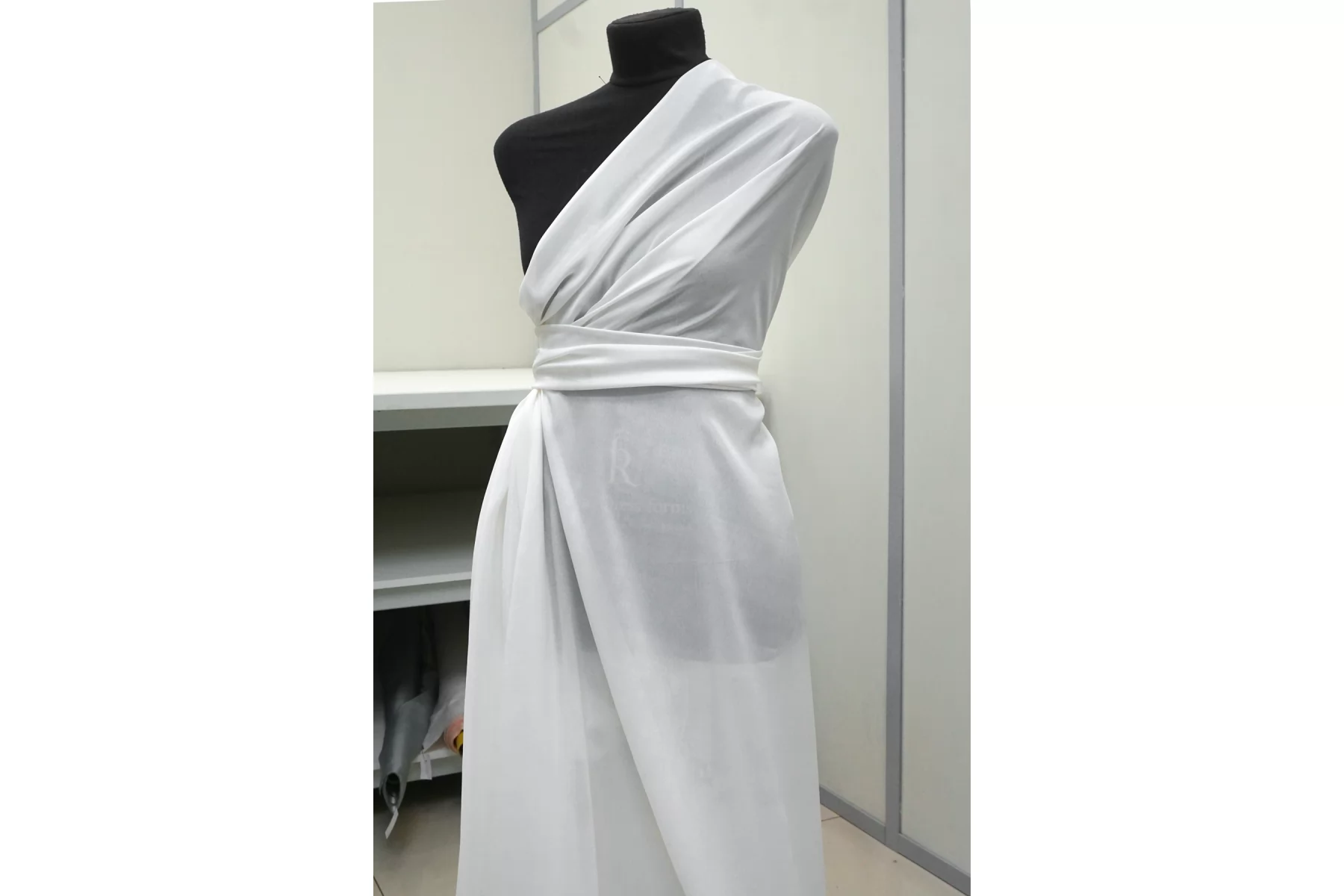Крепдешин, плательно-блузочный по плотности, шёлк с вискозой и небольшой добавкой ацетата, цвет белый. Тактильно слегка шероховатый, легкий и воздушный. Не тянется, но немного пружинит за счет плетения. Красив в своей пластике и в складках. Немного просвечивает. Отлично подойдет на платья, юбки, туники и блузки. Уход - деликатный.