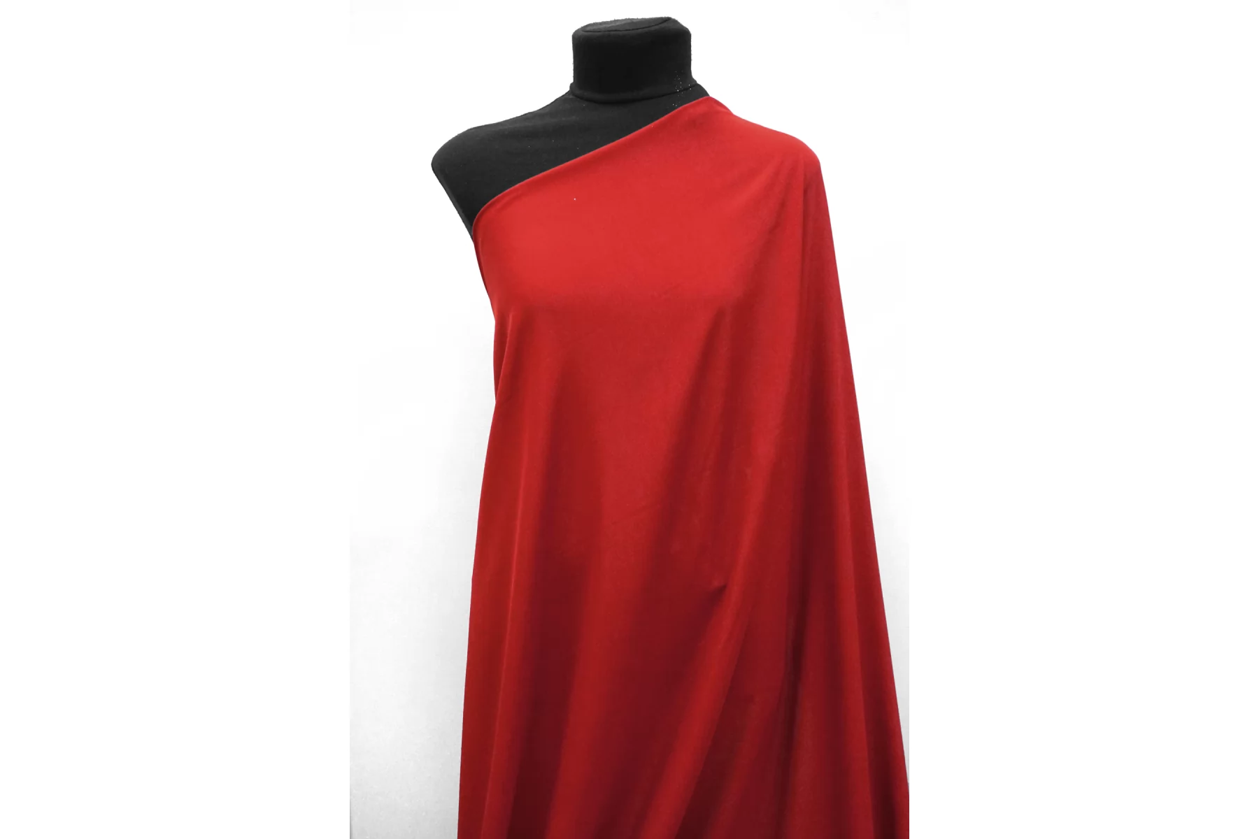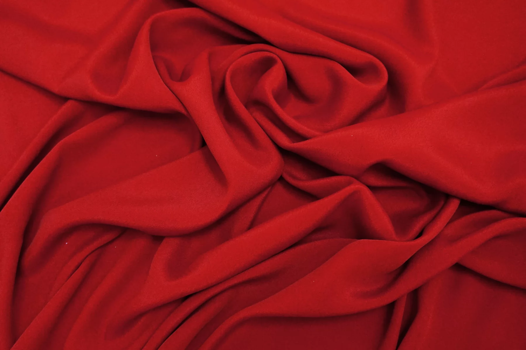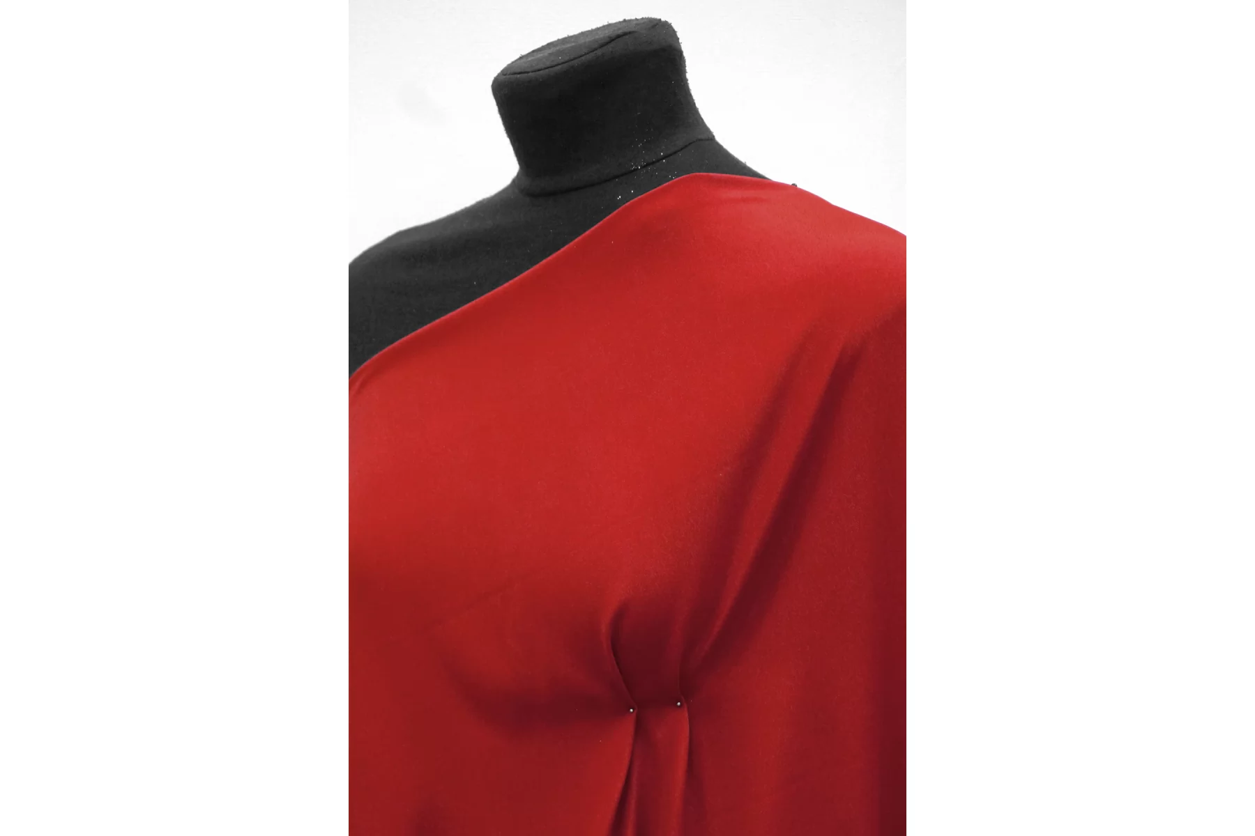 Крепдешин, плательно-блузочный по плотности, шёлк с вискозой в чуть приглушённом оттенке красного. Тактильно слегка шероховатый, легкий и воздушный. Не тянется, но немного пружинит за счет плетения. Красив в своей пластике и в складках. Немного просвечивает в один слой. Отлично подойдет на платья, юбки, туники и блузки. Уход - деликатный.