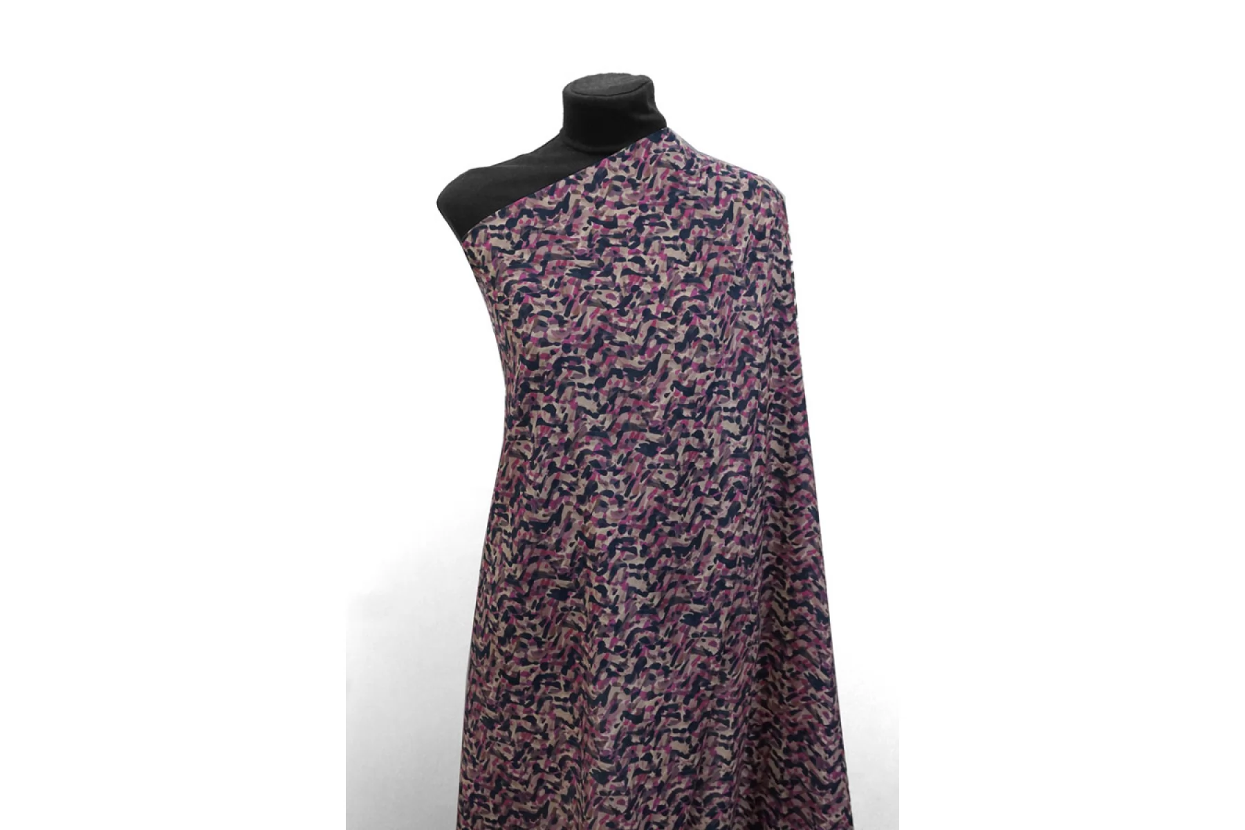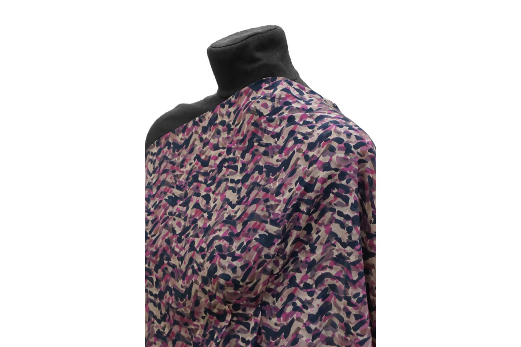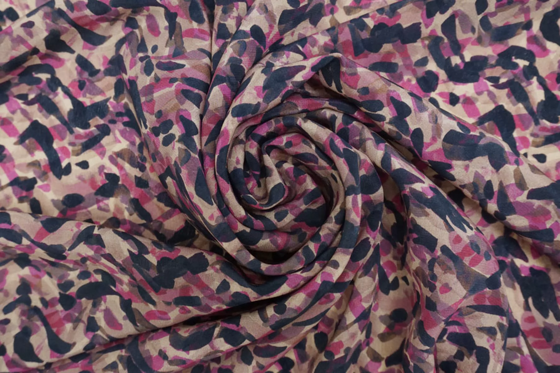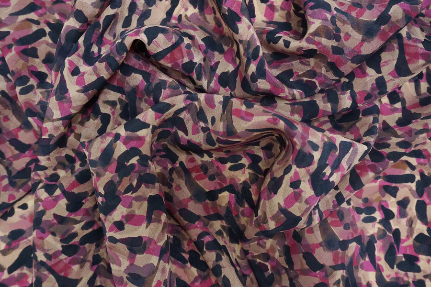 Итальянский шёлковый крепдешин от Max Mara с абстрактным принтом, сочетание бежевого, тёмно-синего цвета и фуксии. Поверхность материала гладкая и скользящая, с легкой шероховатостью присущей крепдешину. Ткань легкая и летящая. Не тянется. Струится. Просвечивает в один слой. Не мнется. Форму не держит, но красив в драпировке. Отличный вариант на летние платья, блузки и юбки. При необходимости используйте подкладочный материал. Уход, как и за любым шелком, деликатный.