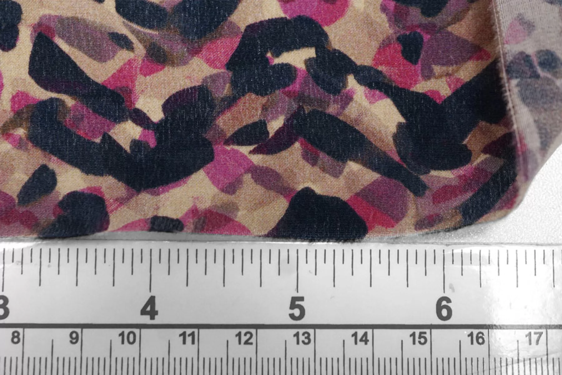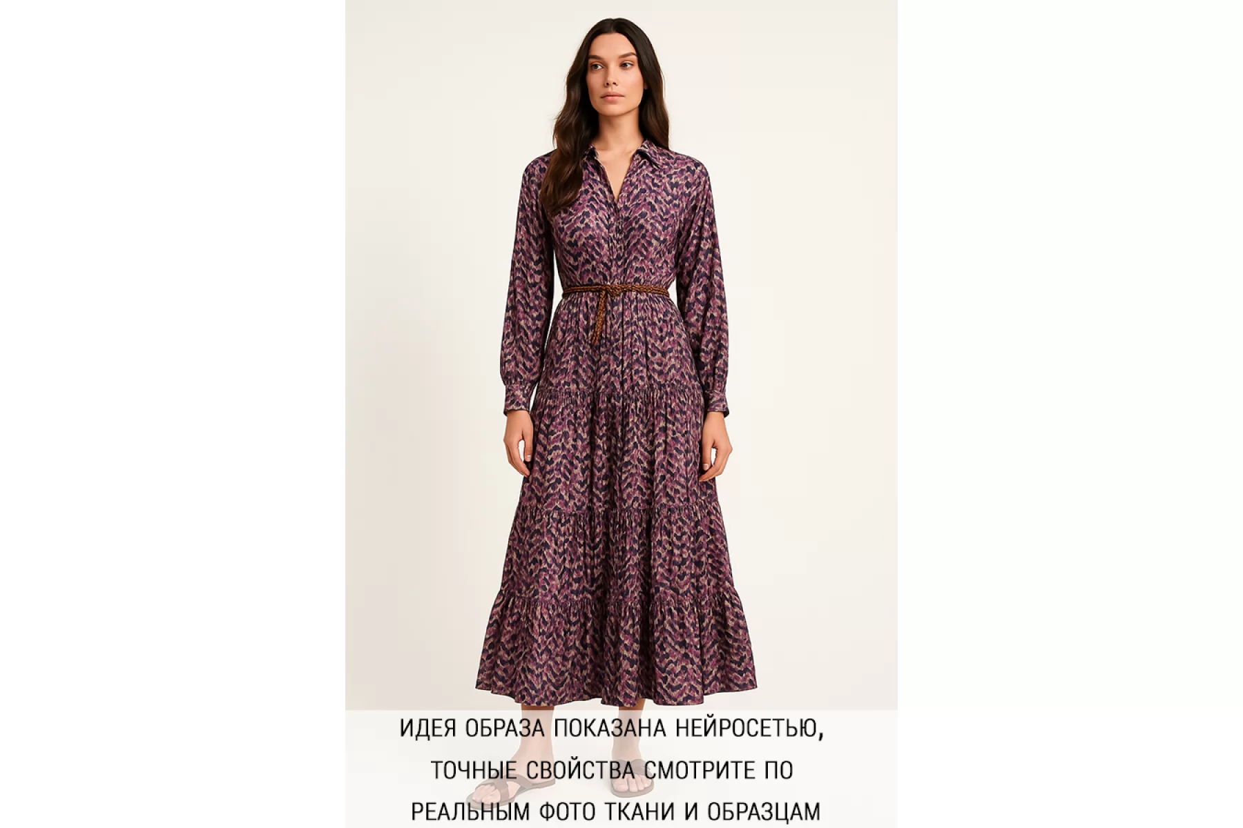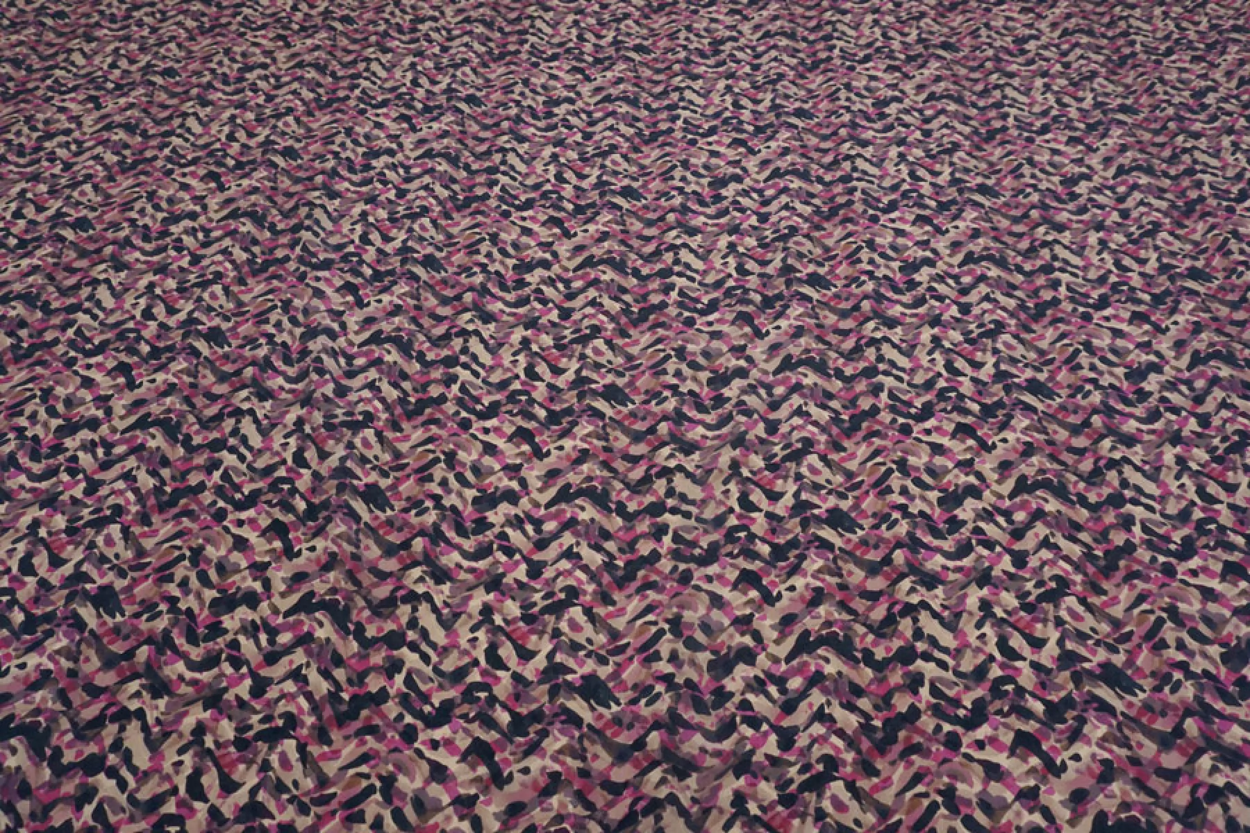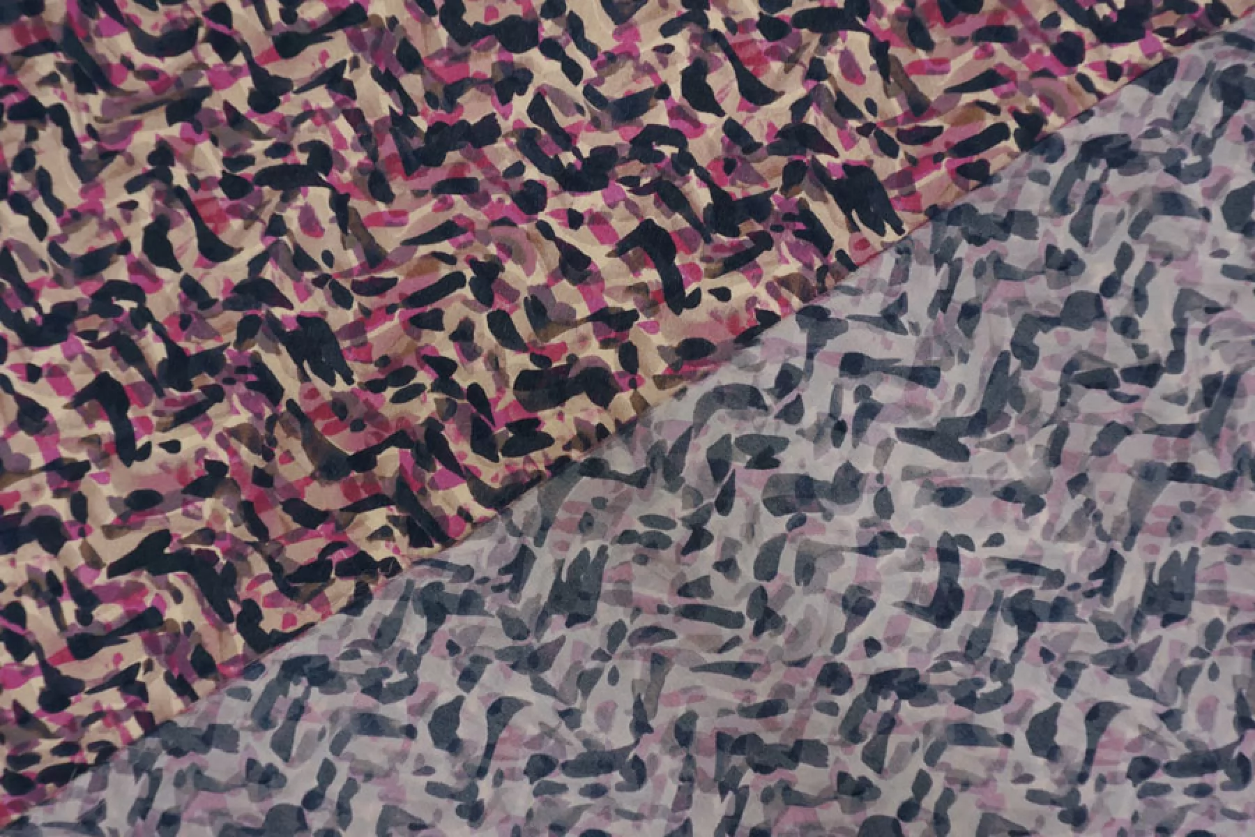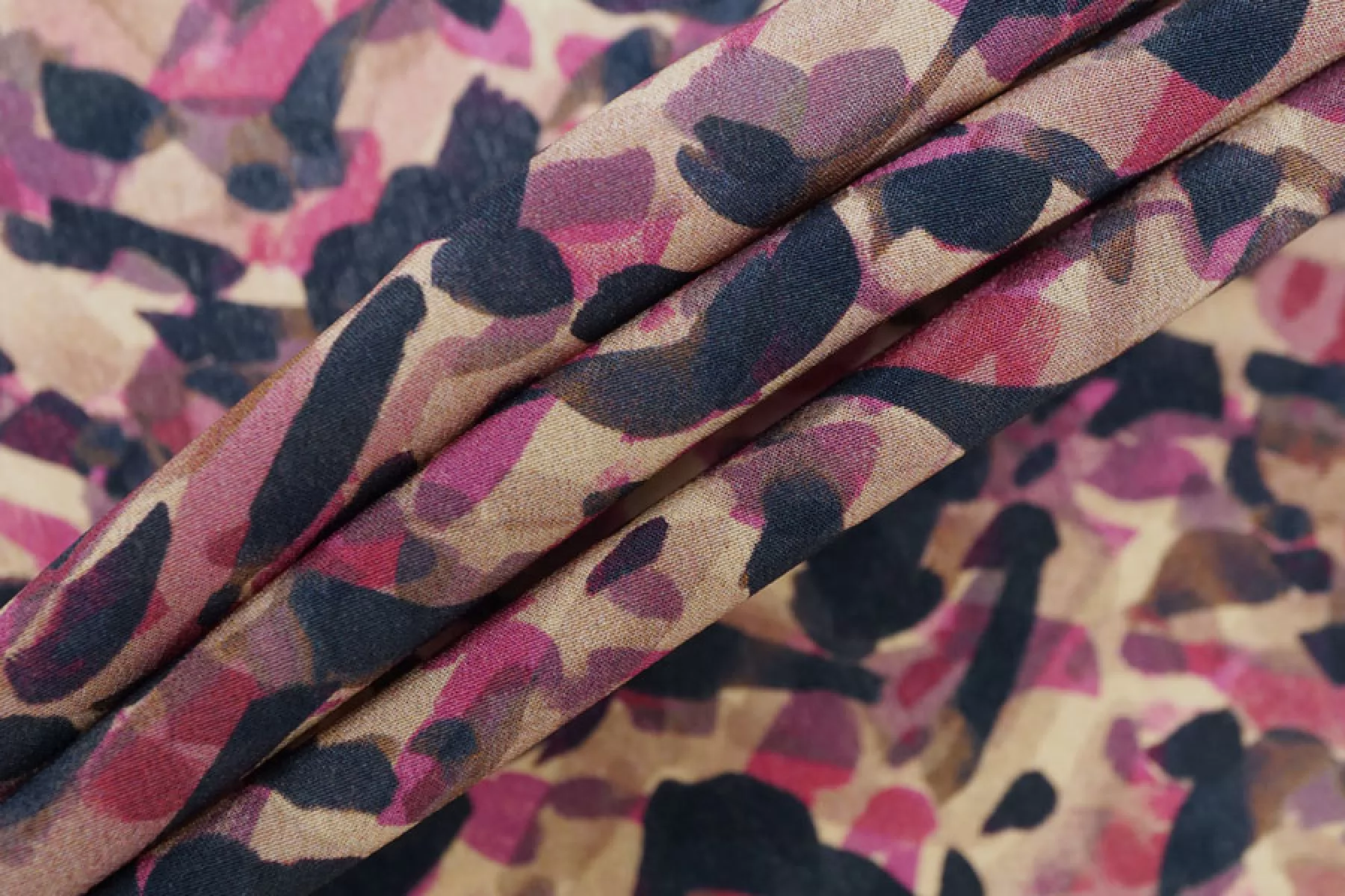Итальянский шёлковый крепдешин от Max Mara с абстрактным принтом, сочетание бежевого, тёмно-синего цвета и фуксии. Поверхность материала гладкая и скользящая, с легкой шероховатостью присущей крепдешину. Ткань легкая и летящая. Не тянется. Струится. Просвечивает в один слой. Не мнется. Форму не держит, но красив в драпировке. Отличный вариант на летние платья, блузки и юбки. При необходимости используйте подкладочный материал. Уход, как и за любым шелком, деликатный.