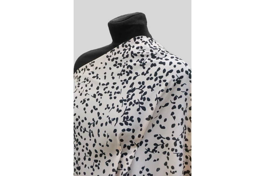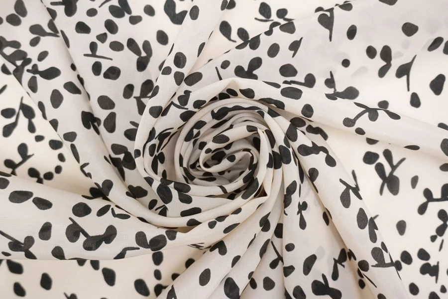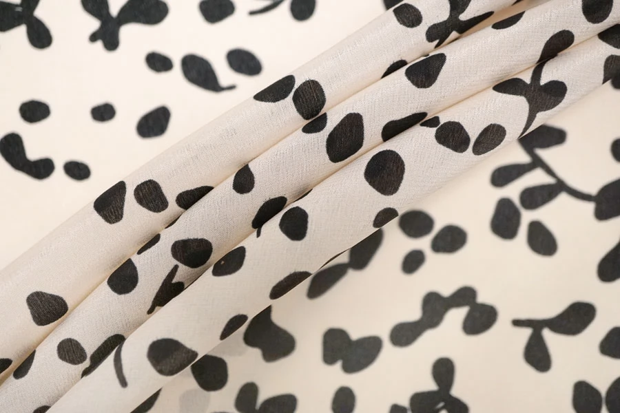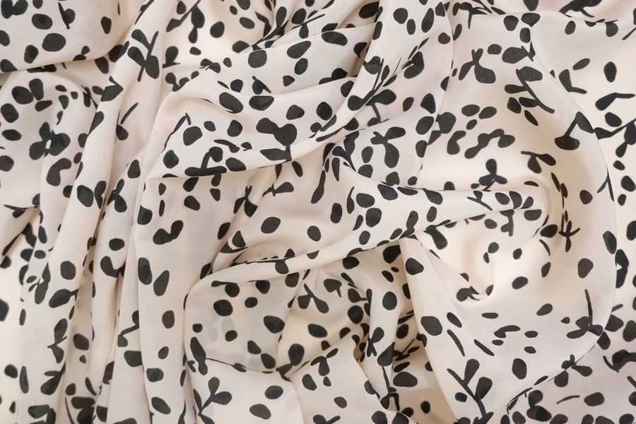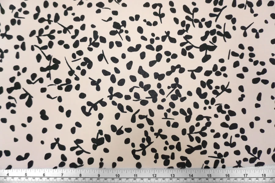 Итальянский шёлковый крепдешин от Max Mara с абстрактным чёрным принтом на нежном, неярком, разбелённом персиковом фоне (можно еще назвать пудрово-бежевым). Поверхность материала гладкая и скользящая, с легкой шероховатостью присущей крепдешину. Ткань легкая и летящая. Не тянется, но плетение немного пружинит. Струится. Просвечивает. Не мнется. Форму не держит, но красив в драпировке. Отличный вариант на летние платья, блузки и юбки. При необходимости используйте подкладочный материал. Уход, как и за любым шелком, деликатный.
