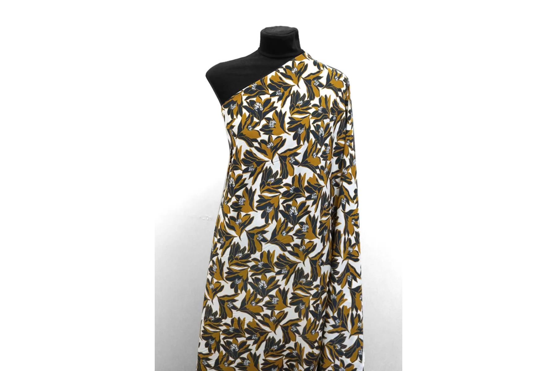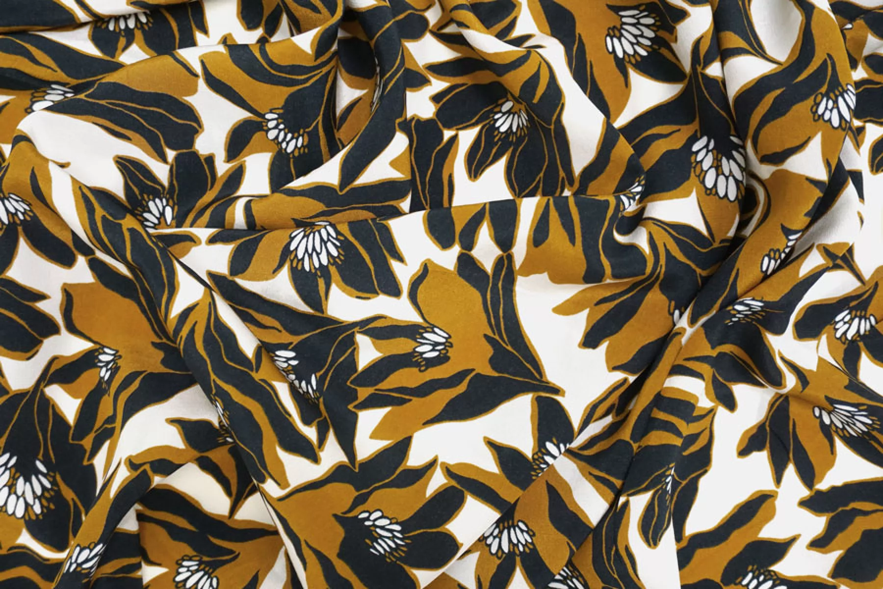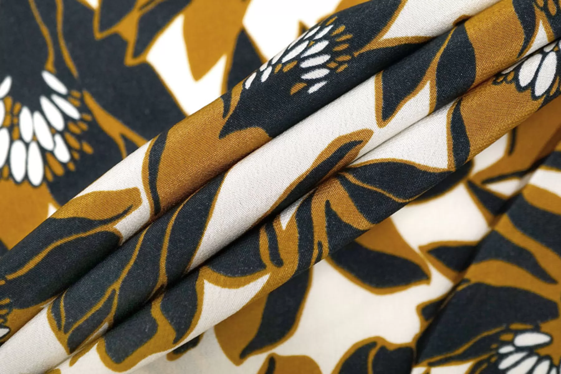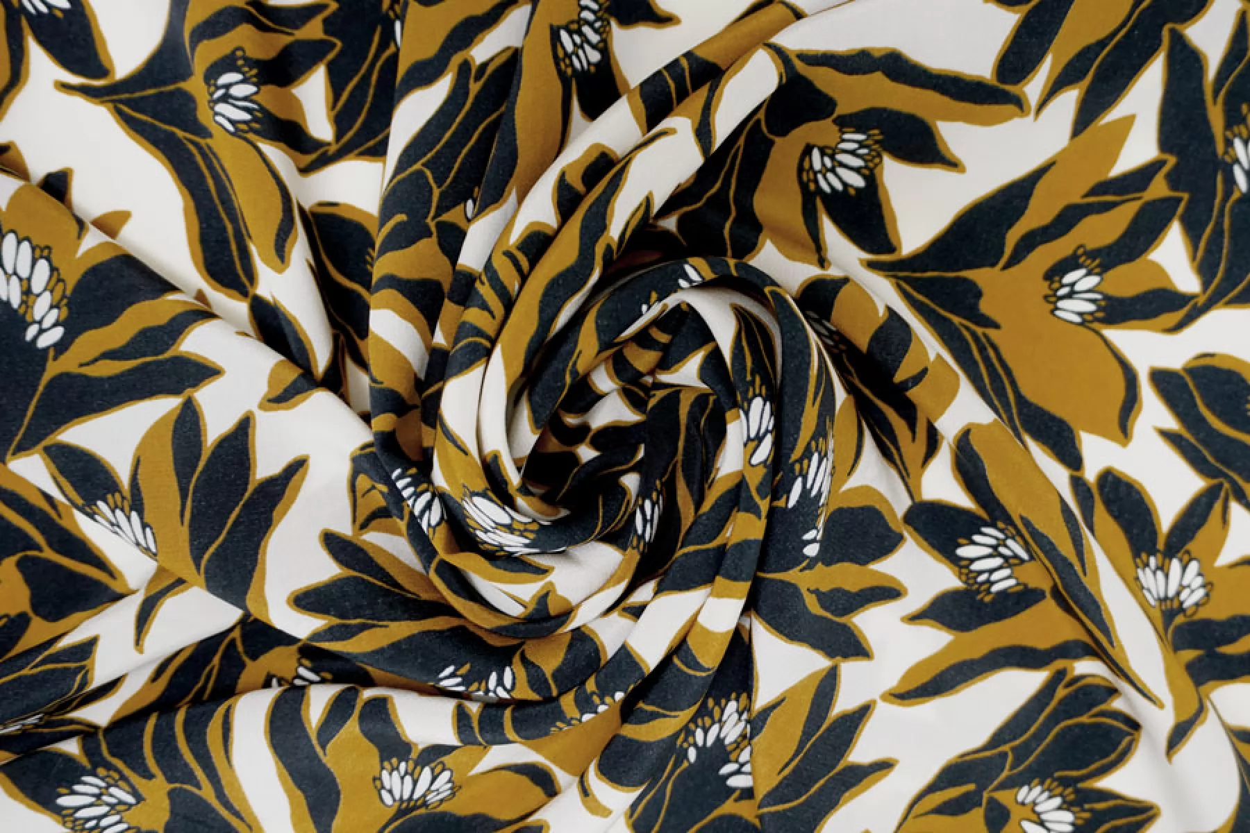 Итальянский шёлковый крепдешин от Max Mara со стилизованным цветочным принтом на молочном фоне, цвета принта чёрный и тёмный охристо-горчичный. Поверхность материала гладкая и скользящая, с легкой шероховатостью присущей крепдешину. Ткань легкая и летящая. Не тянется, но плетение немного пружинит. Струится. Просвечивает в один слой. Не мнется. Форму не держит, но красив в драпировке. Отличный вариант на летние платья, блузки и юбки. При необходимости используйте подкладочный материал. Уход, как и за любым шелком, деликатный.