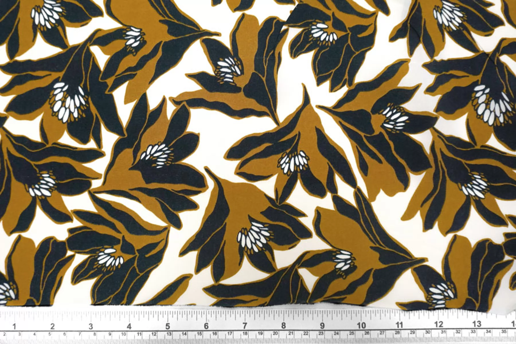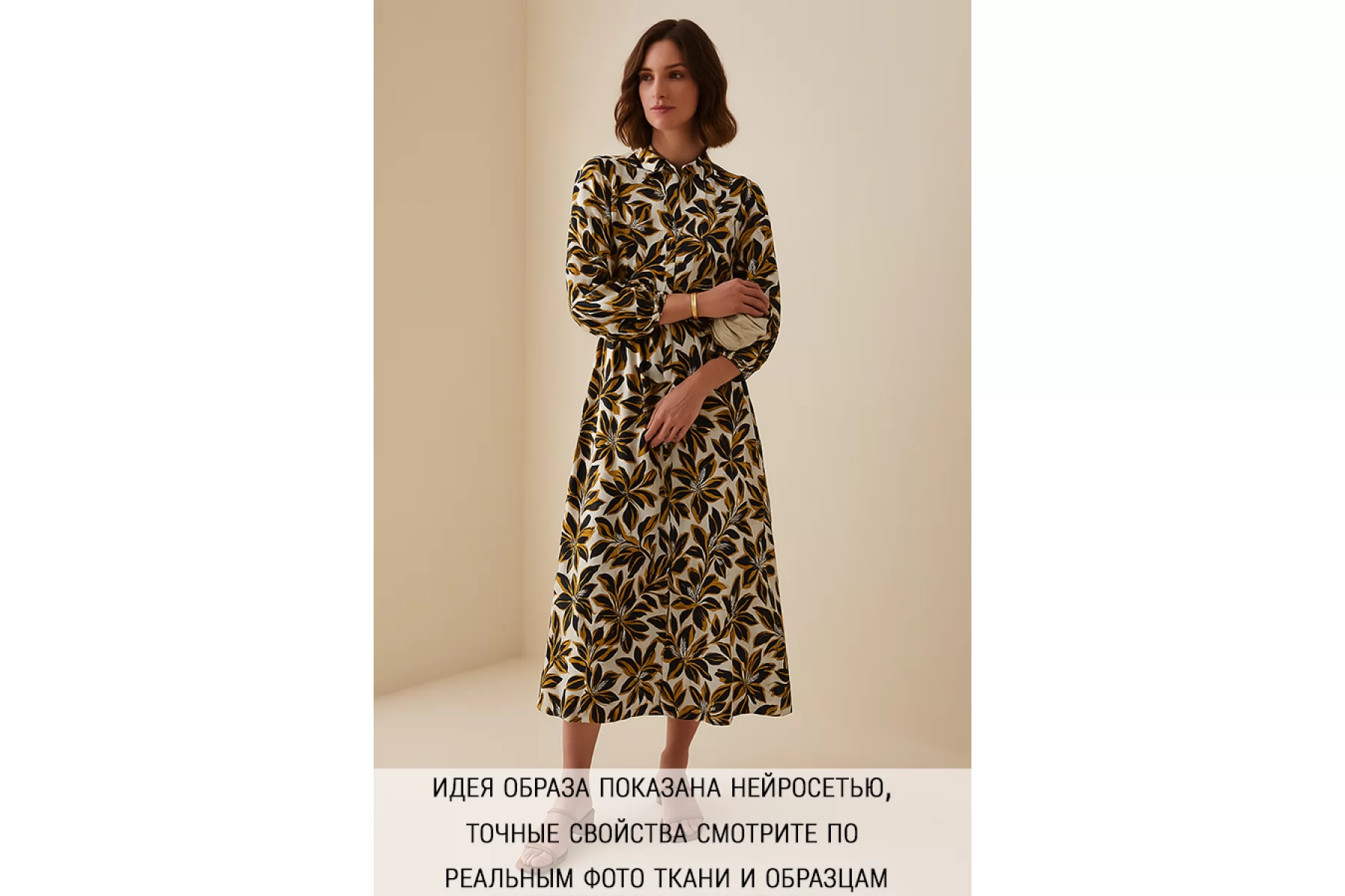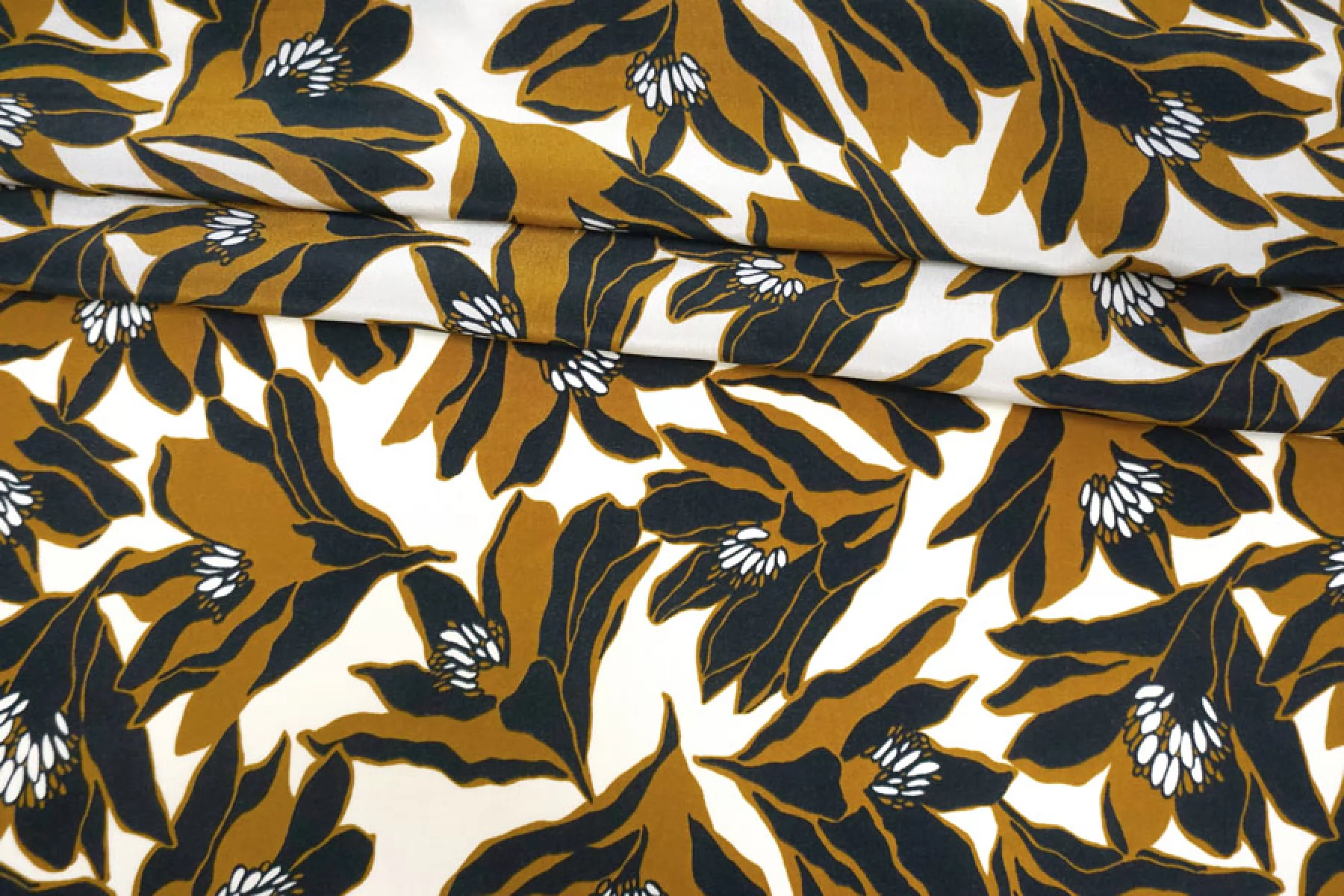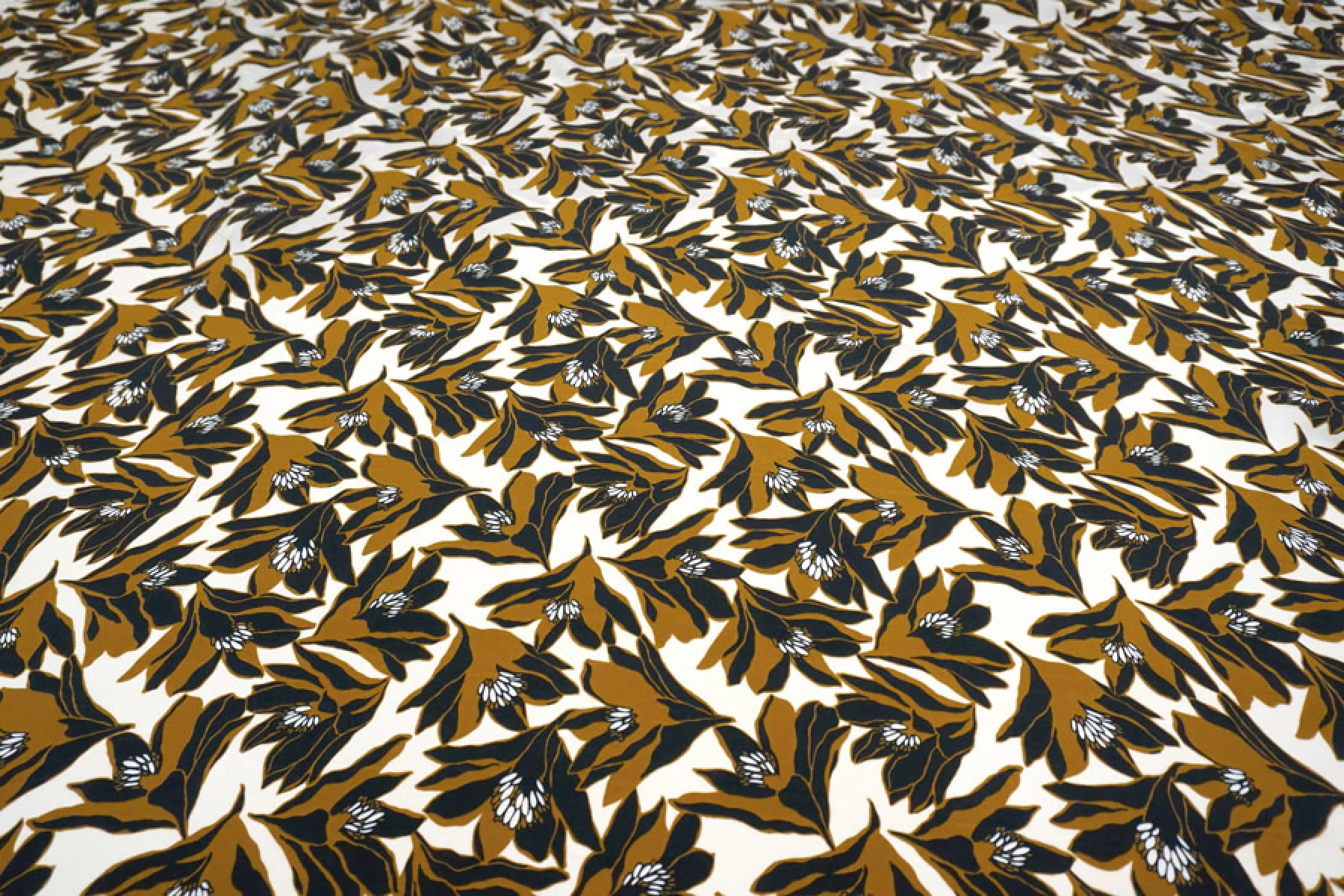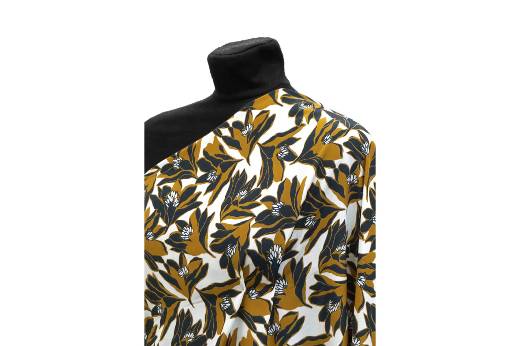 Итальянский шёлковый крепдешин от Max Mara со стилизованным цветочным принтом на молочном фоне, цвета принта чёрный и тёмный охристо-горчичный. Поверхность материала гладкая и скользящая, с легкой шероховатостью присущей крепдешину. Ткань легкая и летящая. Не тянется, но плетение немного пружинит. Струится. Просвечивает в один слой. Не мнется. Форму не держит, но красив в драпировке. Отличный вариант на летние платья, блузки и юбки. При необходимости используйте подкладочный материал. Уход, как и за любым шелком, деликатный.