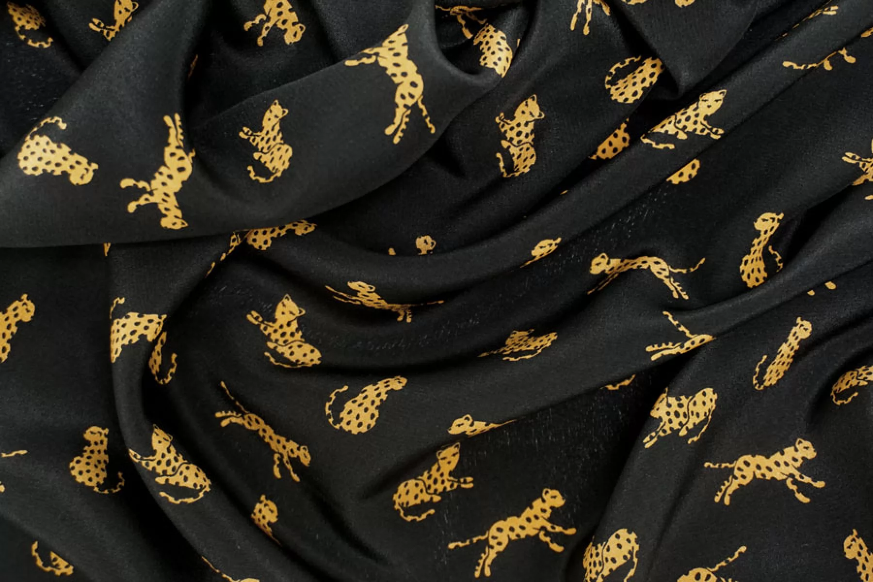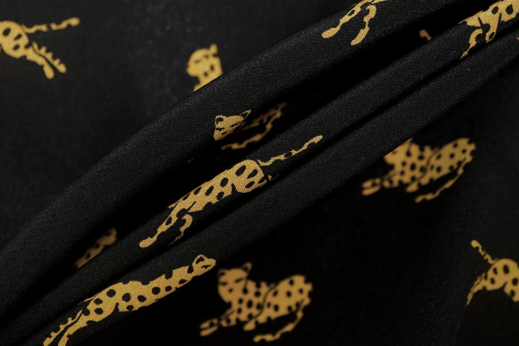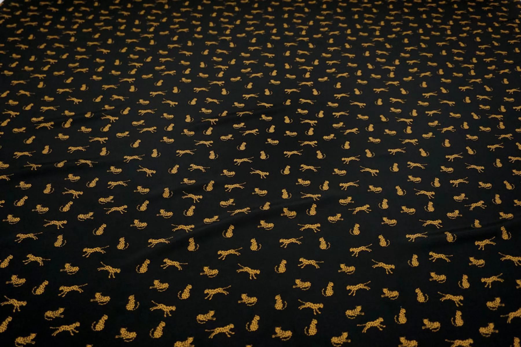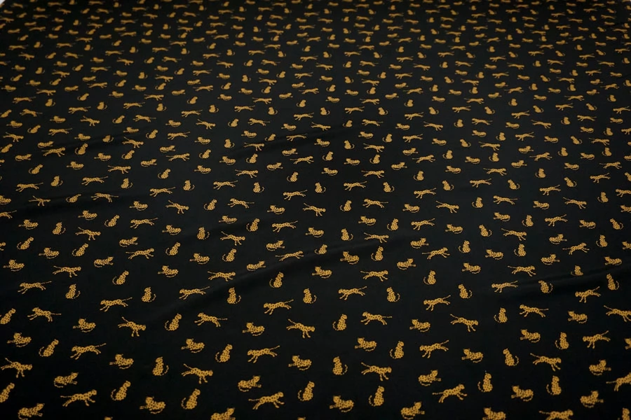 Итальянский шёлковый крепдешин от Max Mara с принтом в виде маленьких стилизованных гепардов на чёрном фоне. Поверхность материала гладкая и скользящая, с легкой шероховатостью присущей крепдешину. Ткань легкая и летящая. Не тянется. Струится. Немного просвечивает в один слой. Не мнется. Форму не держит, но красив в драпировке. Отличный вариант на летние платья, блузки и юбки. При необходимости используйте подкладочный материал. Уход, как и за любым шелком, деликатный.