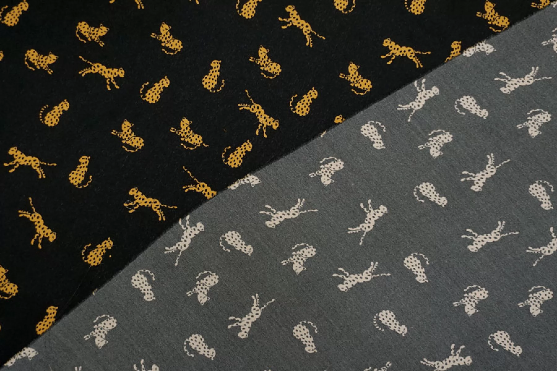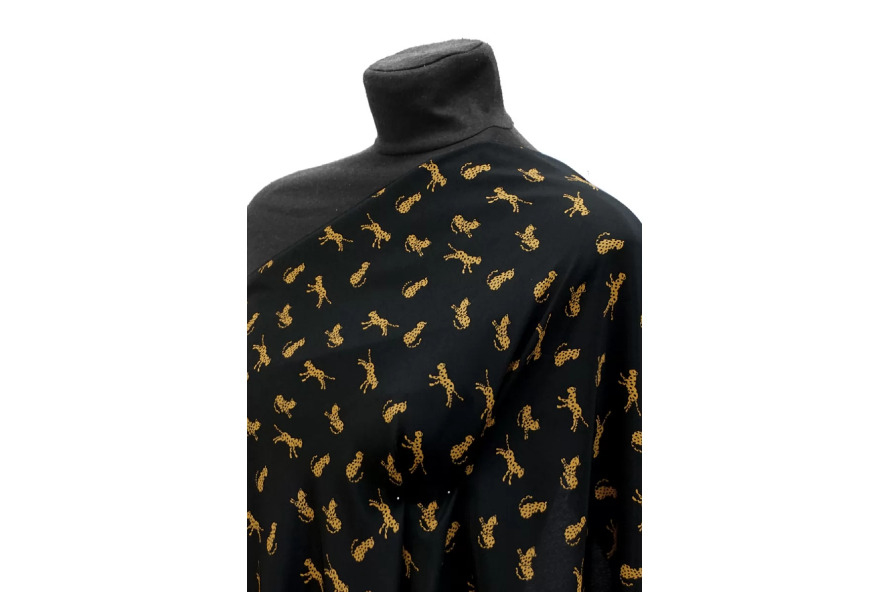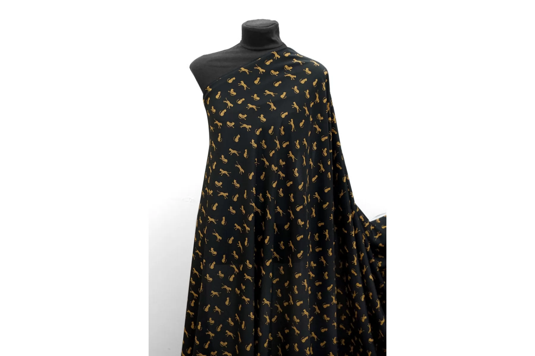 Итальянский шёлковый крепдешин от Max Mara с принтом в виде маленьких стилизованных гепардов на чёрном фоне. Поверхность материала гладкая и скользящая, с легкой шероховатостью присущей крепдешину. Ткань легкая и летящая. Не тянется. Струится. Немного просвечивает в один слой. Не мнется. Форму не держит, но красив в драпировке. Отличный вариант на летние платья, блузки и юбки. При необходимости используйте подкладочный материал. Уход, как и за любым шелком, деликатный.