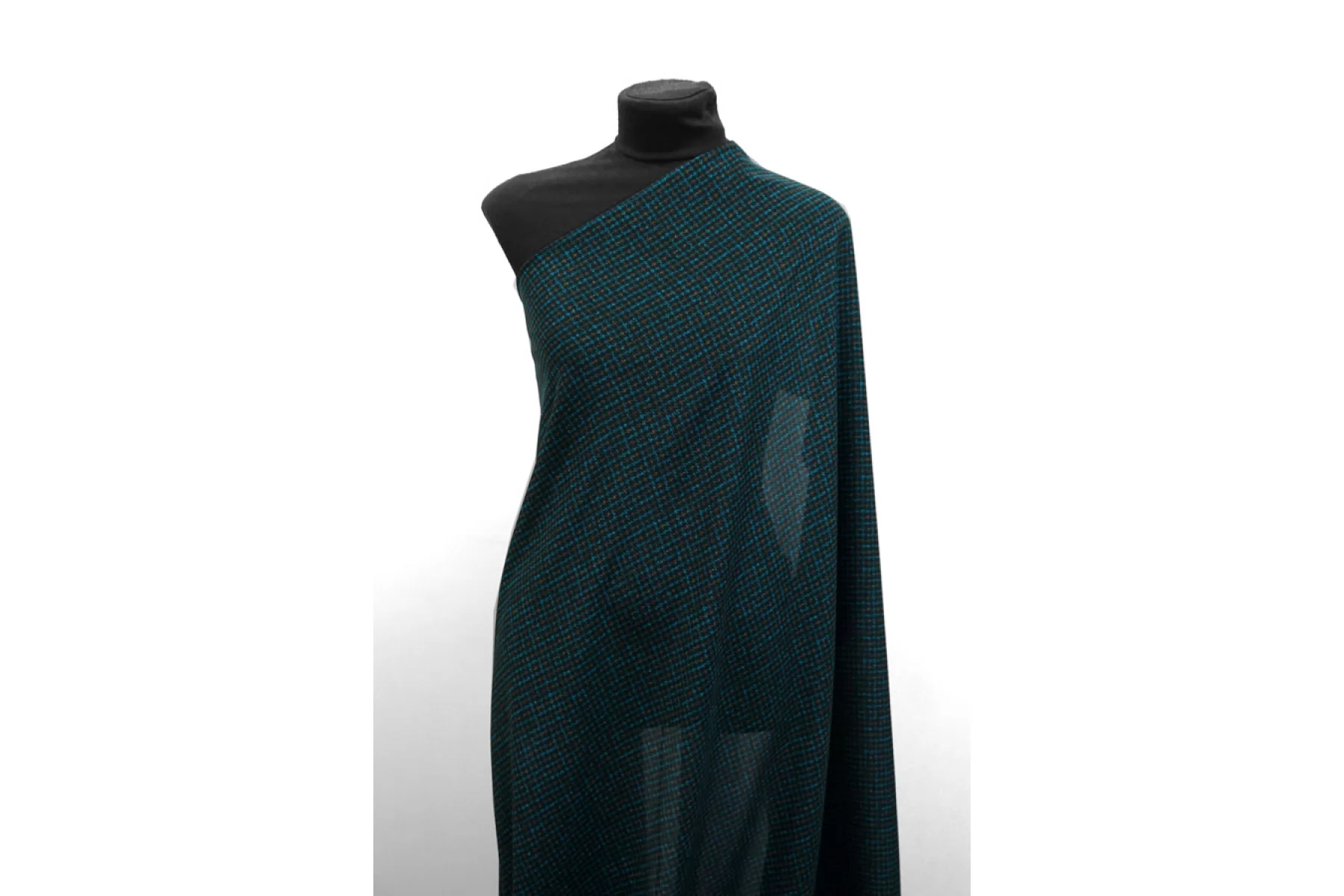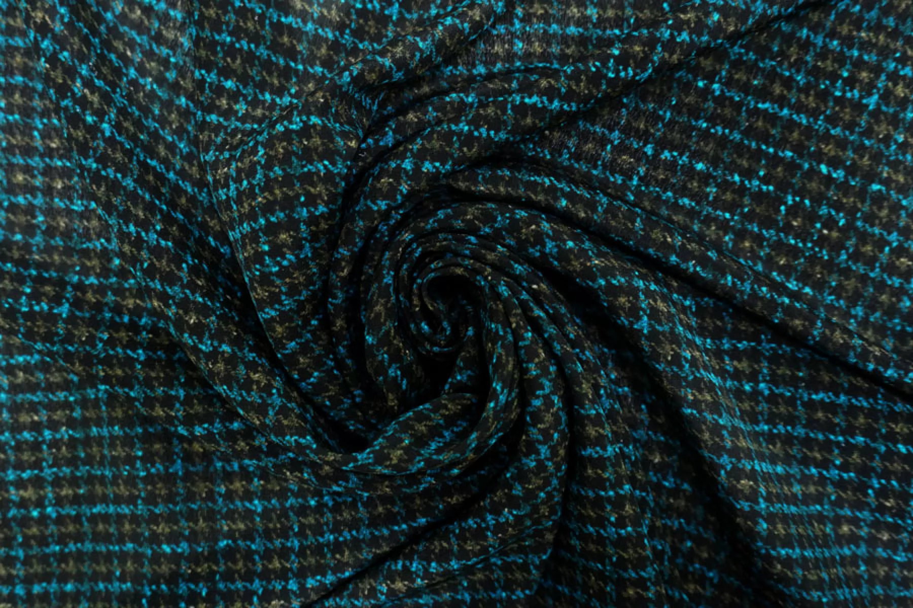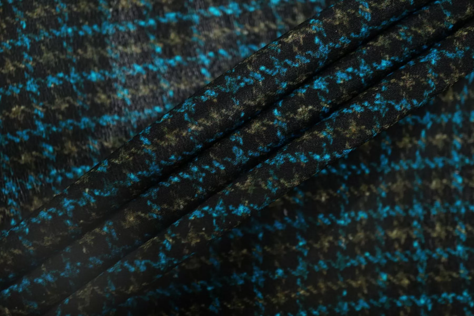Итальянский шёлковый крепдешин от Max Mara с принтом в виде нечёткой гусиной лапки, сочетание чёрного, сине-голубого и защитно-зелёного цвета. Поверхность материала гладкая и скользящая, с легкой шероховатостью присущей крепдешину. Ткань легкая и летящая. Не тянется. Струится. Немного просвечивает в один слой. Не мнется. Форму не держит, но красив в драпировке. Отличный вариант на летние платья, блузки и юбки. При необходимости используйте подкладочный материал. Уход, как и за любым шелком, деликатный.