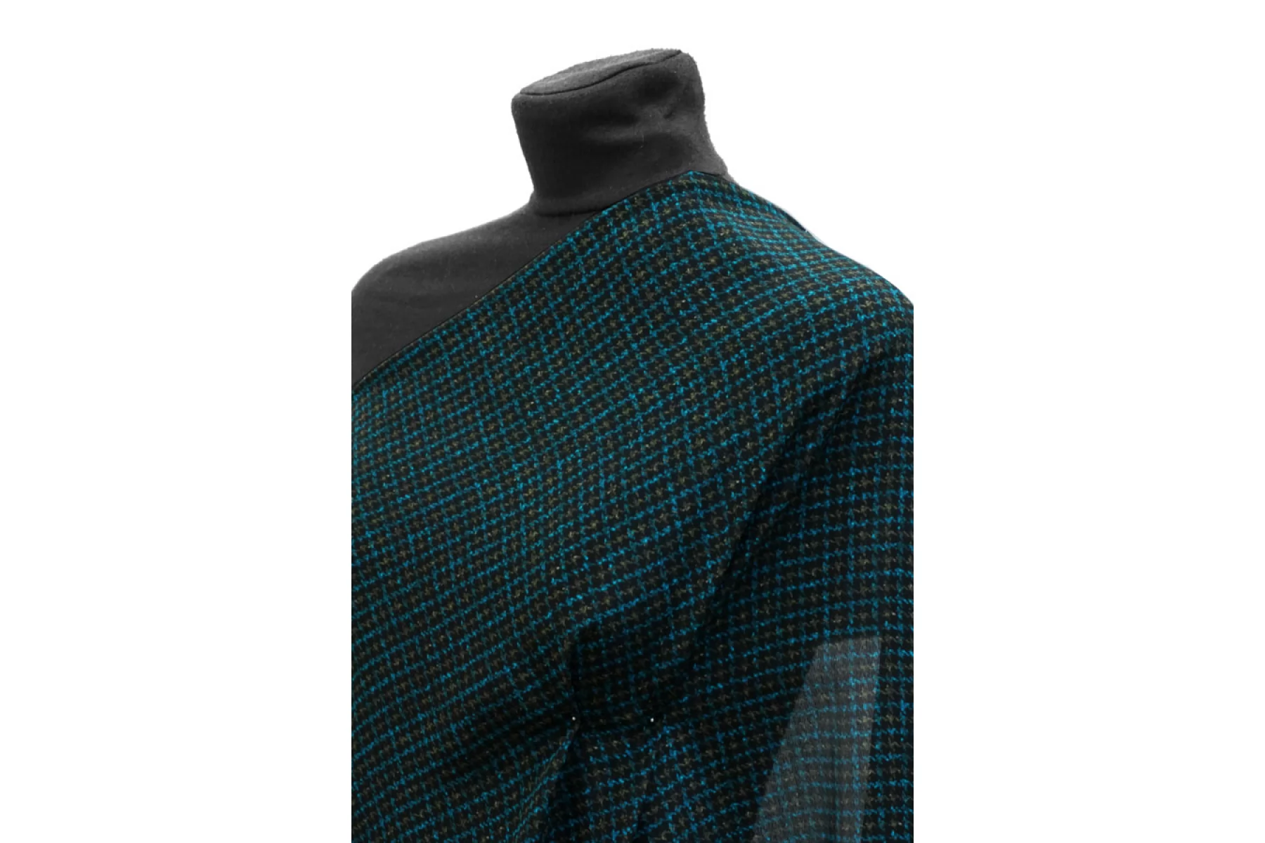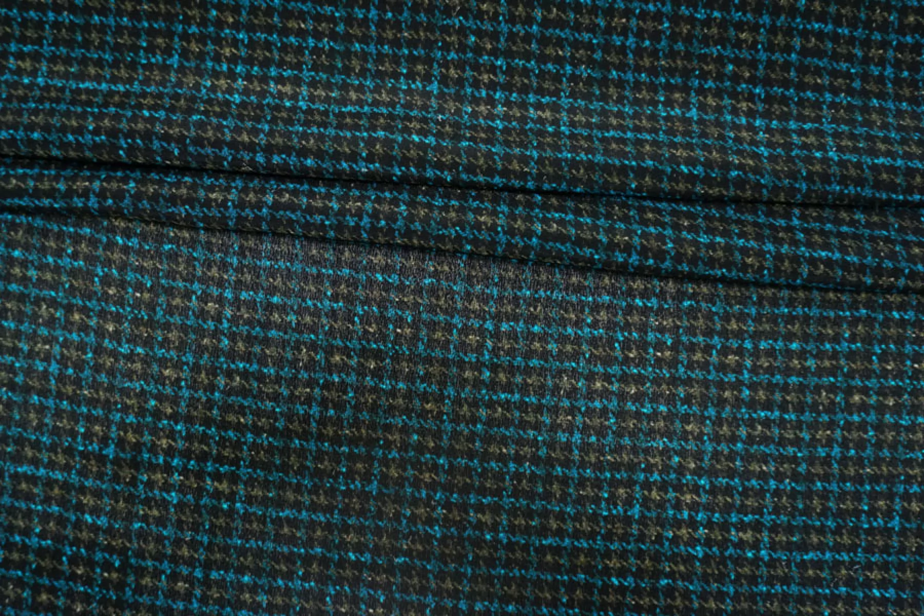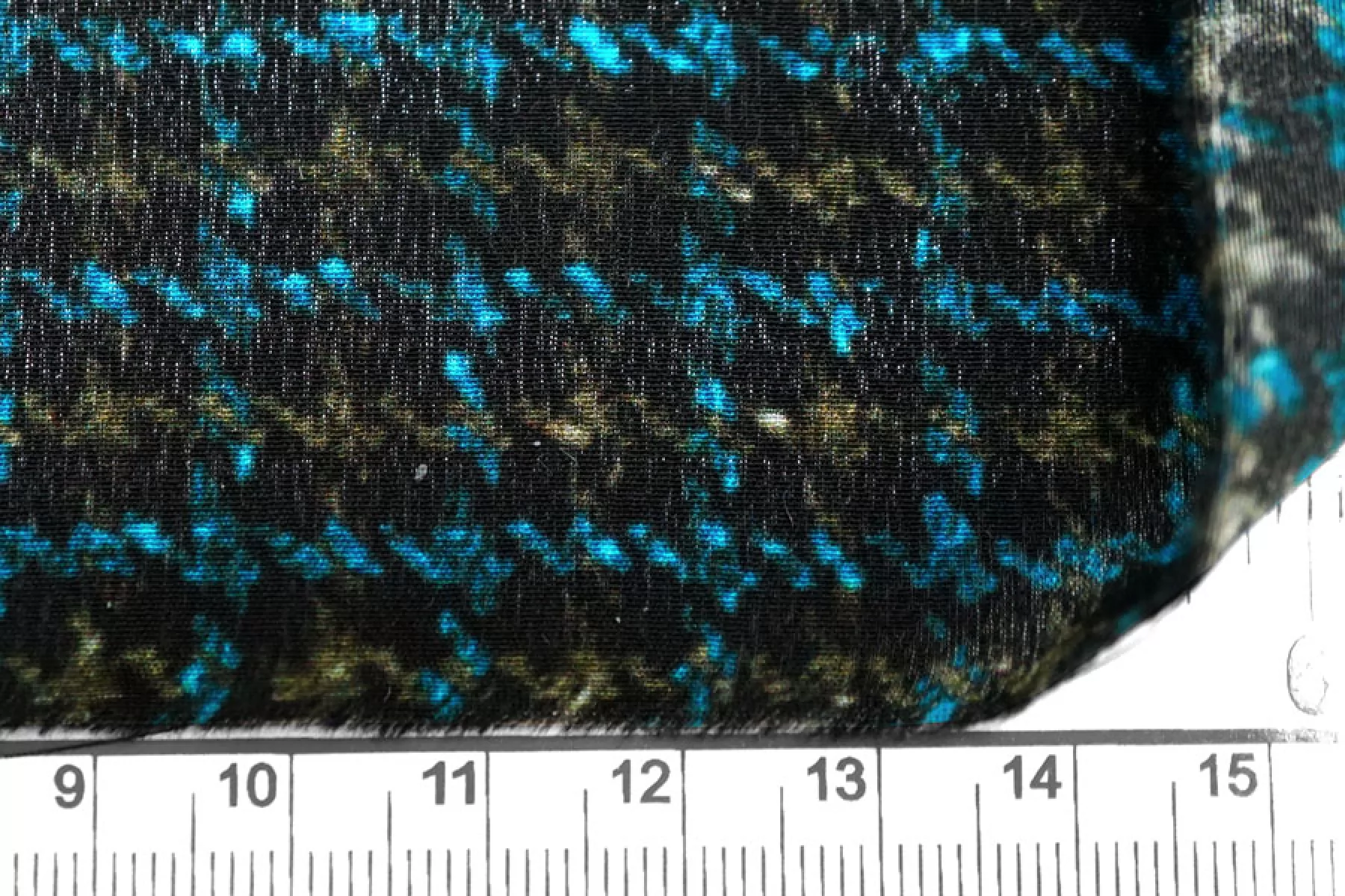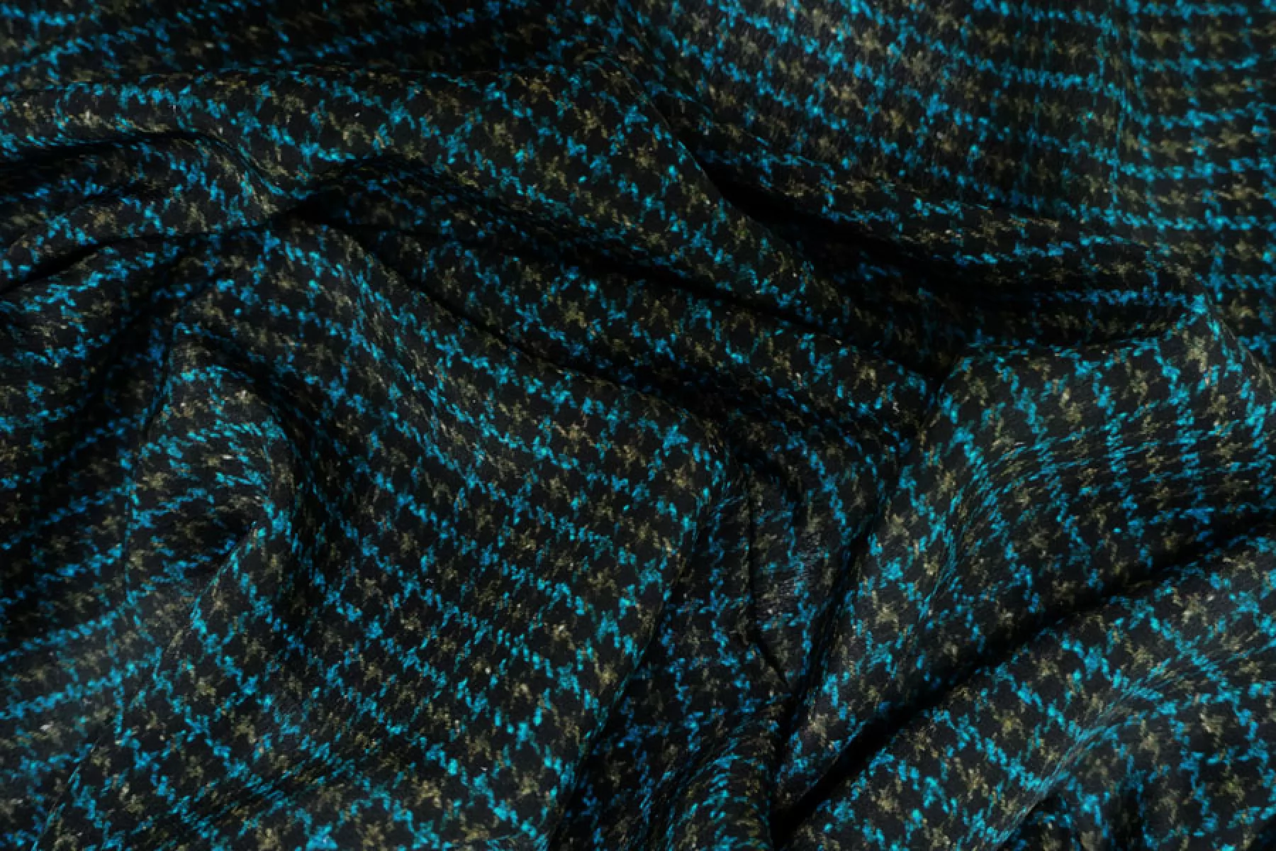 Итальянский шёлковый крепдешин от Max Mara с принтом в виде нечёткой гусиной лапки, сочетание чёрного, сине-голубого и защитно-зелёного цвета. Поверхность материала гладкая и скользящая, с легкой шероховатостью присущей крепдешину. Ткань легкая и летящая. Не тянется. Струится. Немного просвечивает в один слой. Не мнется. Форму не держит, но красив в драпировке. Отличный вариант на летние платья, блузки и юбки. При необходимости используйте подкладочный материал. Уход, как и за любым шелком, деликатный.