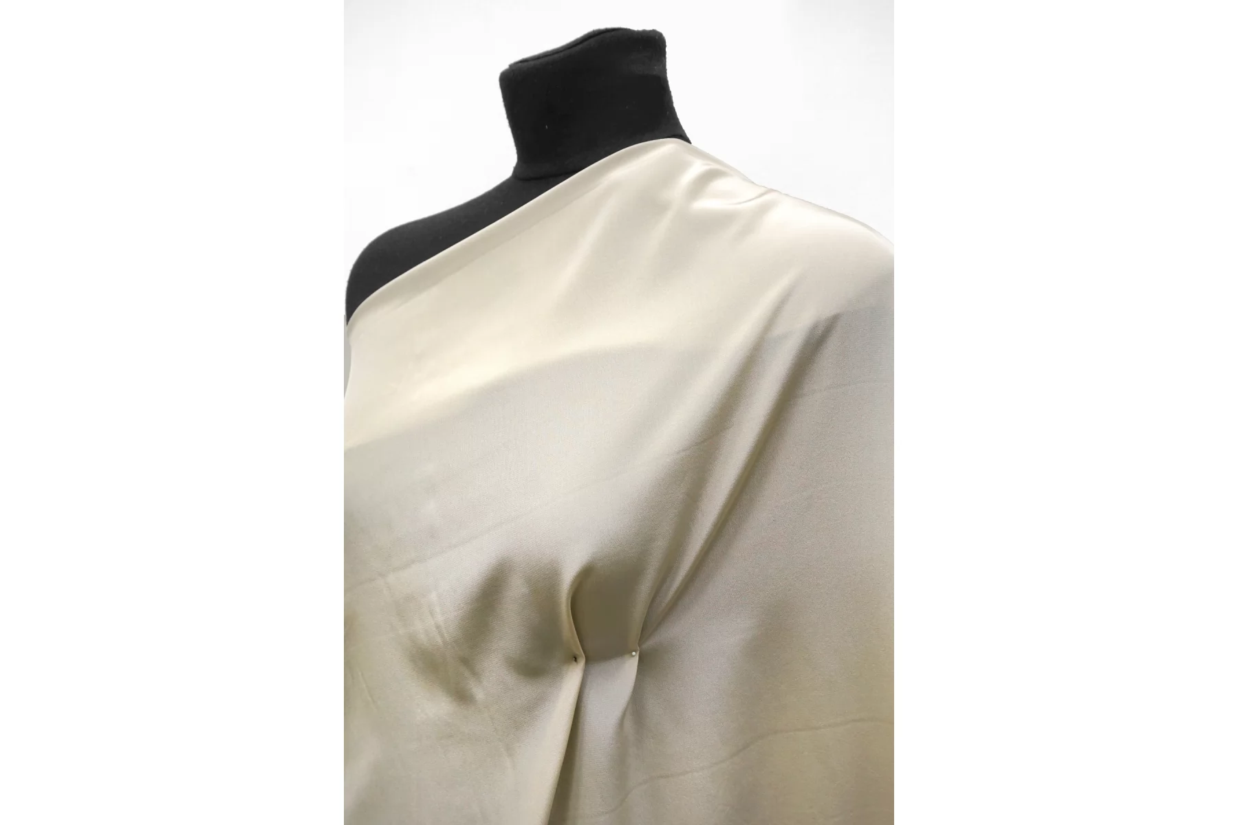 Итальянский шёлковый крепдешин от Max Mara, в светлом серовато-бежевом цвете. Поверхность материала гладкая и скользящая, с легкой шероховатостью присущей крепдешину. Ткань легкая и летящая. Не тянется, но слегка пружинит за счет плетения. Струится. Просвечивает силуэт. Не мнется. Форму не держит, но красив в драпировке. Отличный вариант на летние платья, блузки и юбки. При необходимости используйте подкладочный материал. Уход, как и за любым шелком, деликатный.