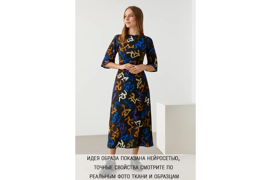 Креповая плательно-блузочная вискоза с абстрактным принтом в оттенках припыленного черного, серо-молочного, охры, голубого и фиолетового. Тактильно шероховатая. Не тянется, но хорошо пружинит за счет плетения. Просвечивает силуэт, на просвет. Немного мнется, но восстанавливается. Хороша в складках. Отлично подойдет на платья, блузки или юбки. Обязательно учитывайте усадку 5-10%. При необходимости используйте подкладочный материал.